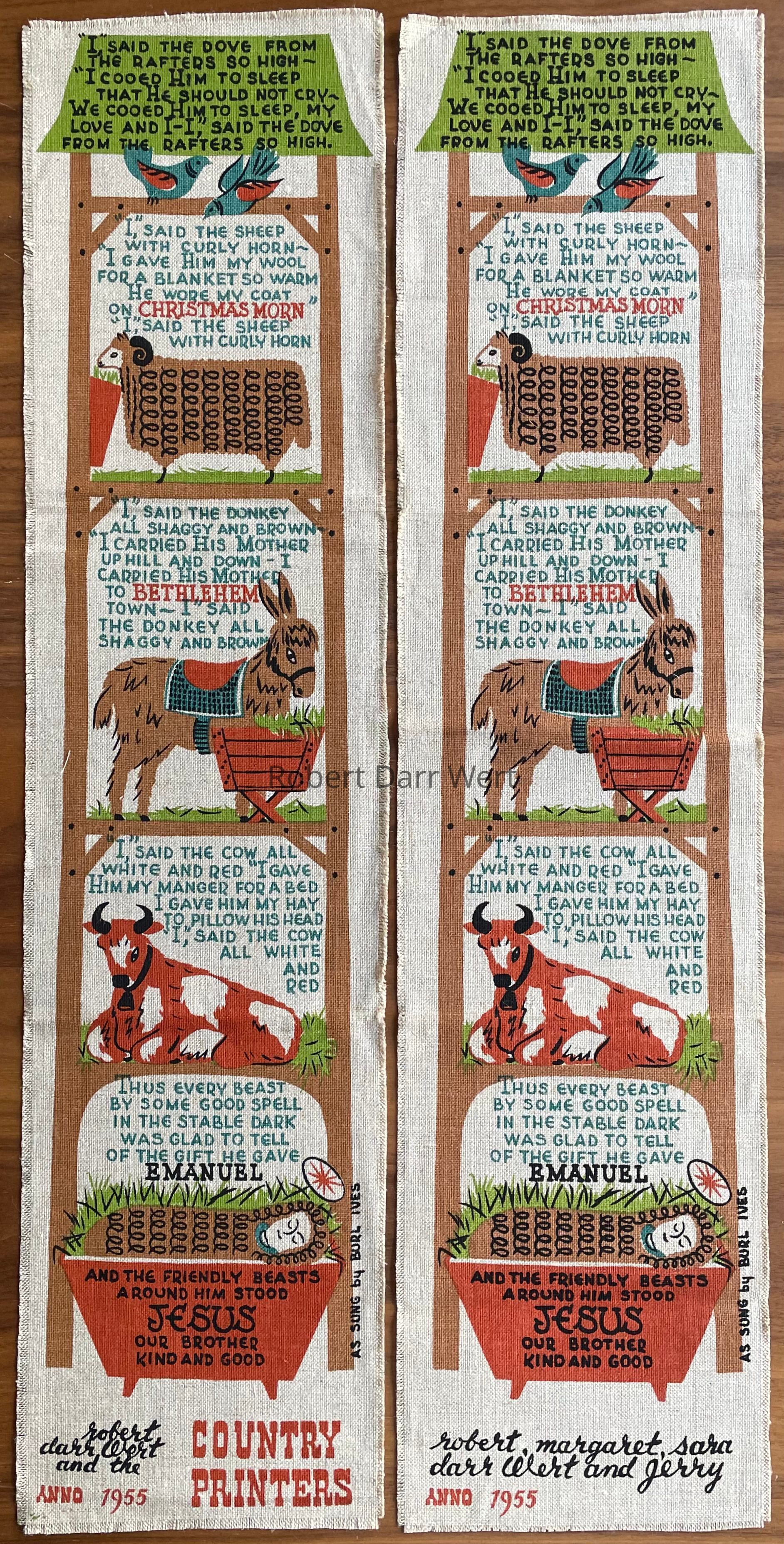 A five-color silkscreen print on natural linen depicting verses from the Christmas song The Friendly Beasts (which has multiple alternate titles), telling the Christmas story from the point of view of the animals living in the barn on the night Jesus was born.