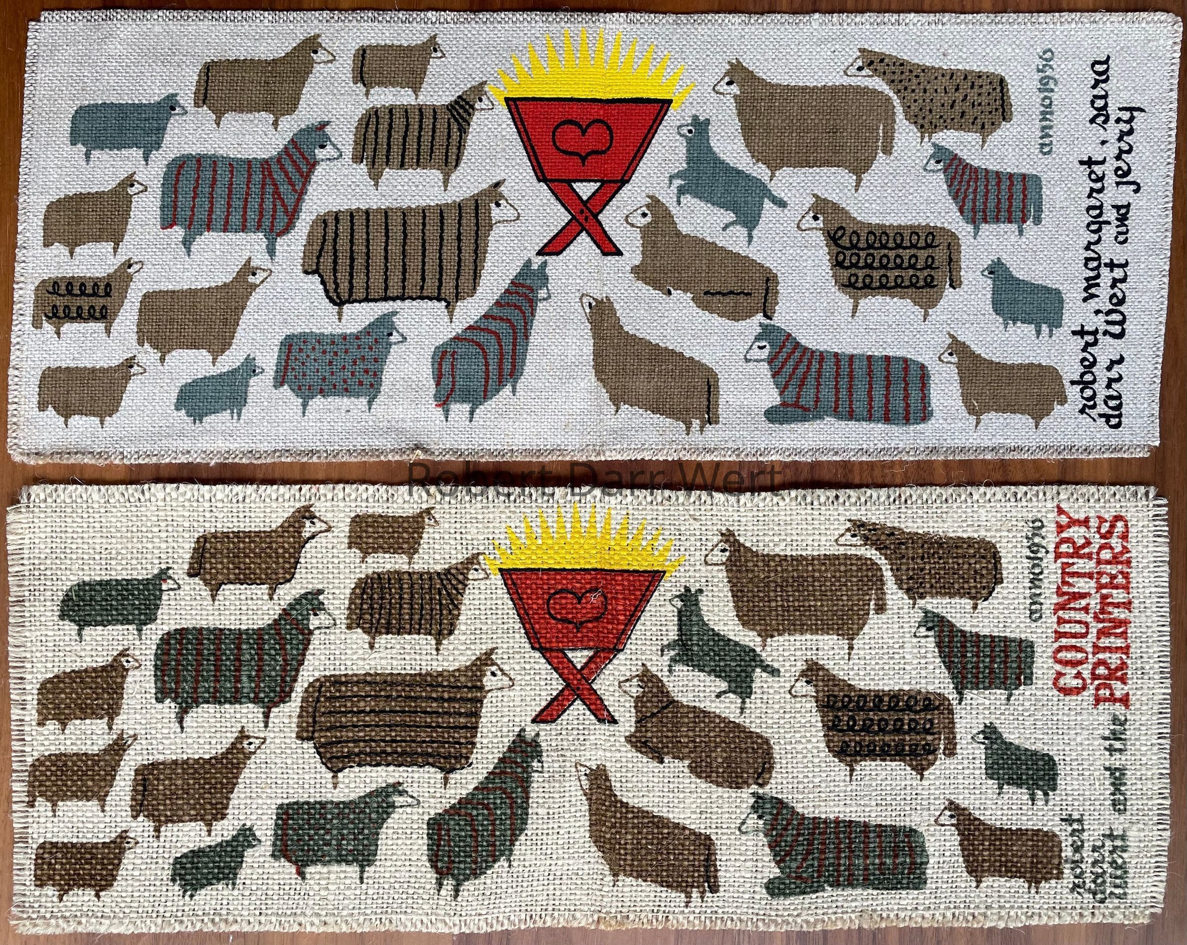 A five-color silkscreen print on natural linen depicting a flock of twenty-two sheep facing Jesus’ manger. A yellow light radiates from within.Made/Created