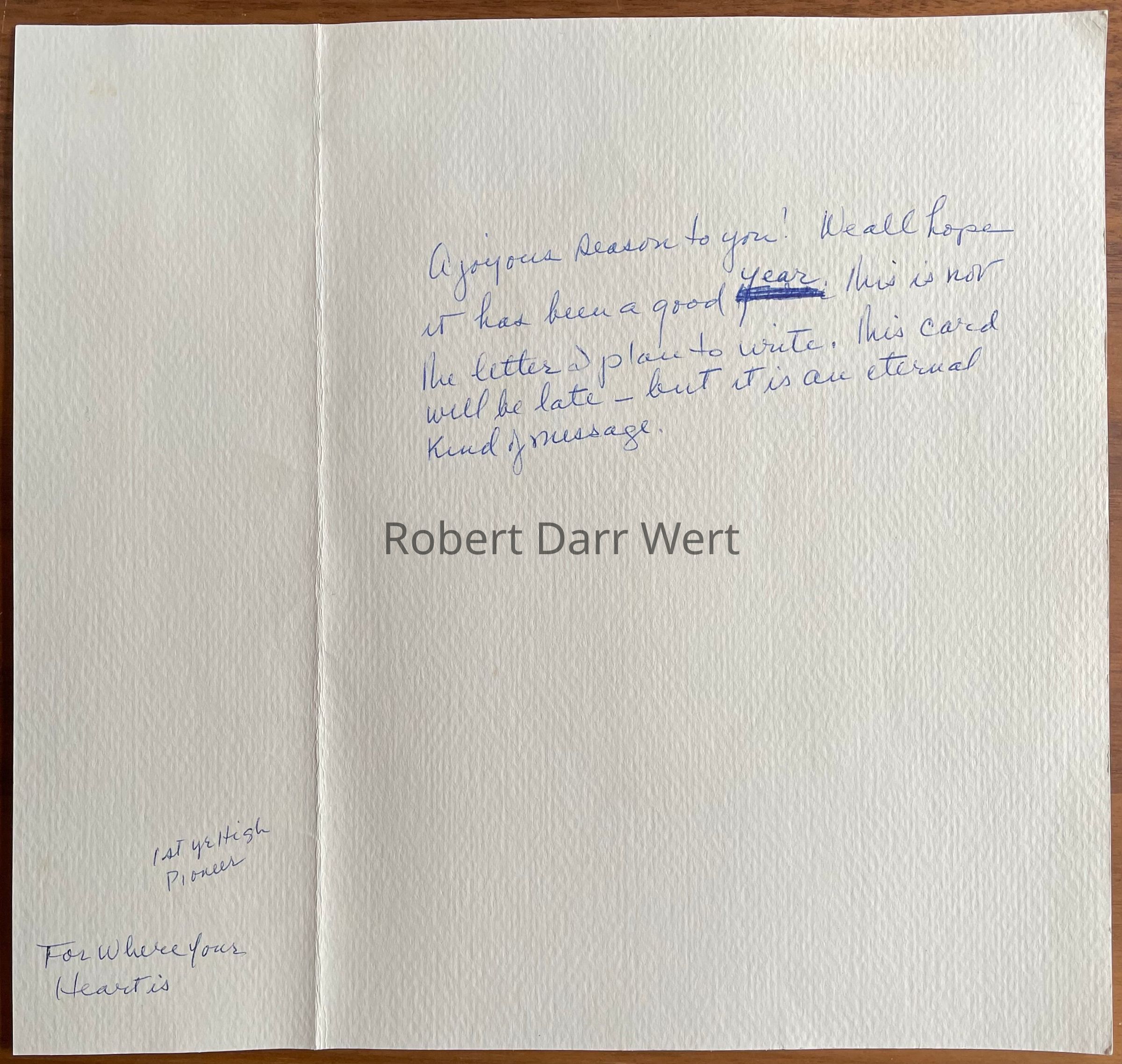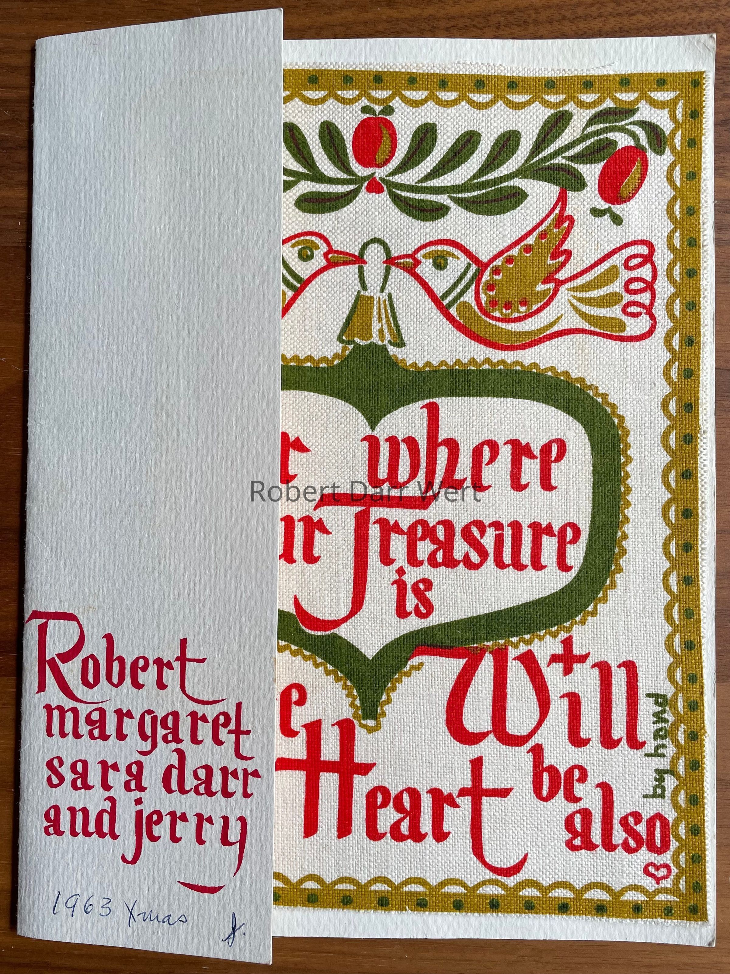A 1963 Wert family Christmas greeting comprised of a three-screen/four-color silkscreen print on linen within a textured white cardstock note folder. The note folder is printed with the Wert family names: Robert, Margaret, Sara Darr and Jerry.