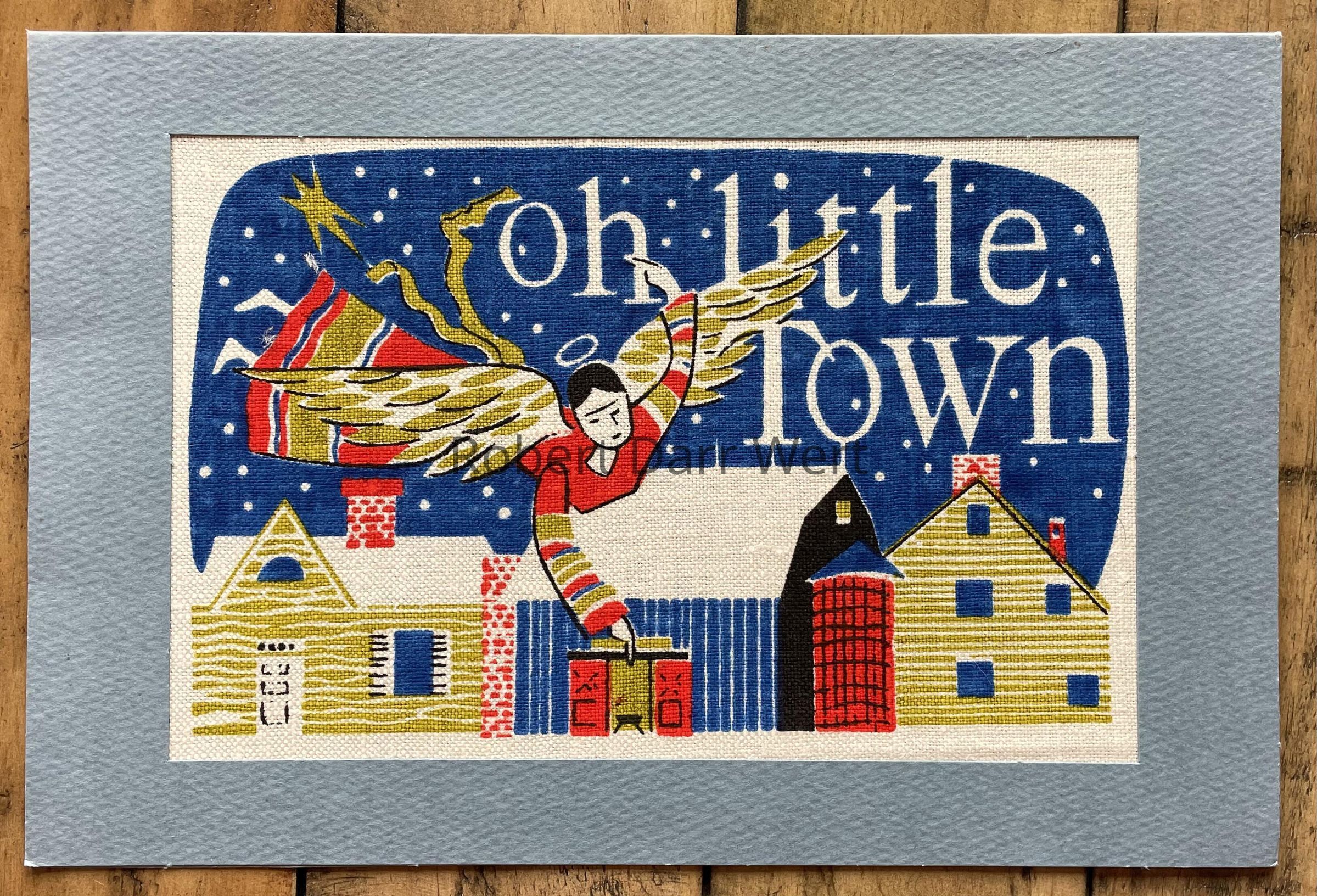 A four-color silkscreen print on off-white linen glued within a dye cut Strathmore notecard in blue-gray. The print depicts an angel flying above a New England style farm on a winter’s night. The angel points upward toward the Christmas star with its left hand, and downward to the open barn doors with its right. Within the barn is a manger, with a halo hovering above and to the left. In the sky, the words “oh little Town” refer to the traditional Christmas carol, “Oh Little Town of Bethlehem”. The image removes the birth of Jesus from Bethlehem and places it in a traditional New England scene, making the Christmas story more relevant and familiar to a North American audience.