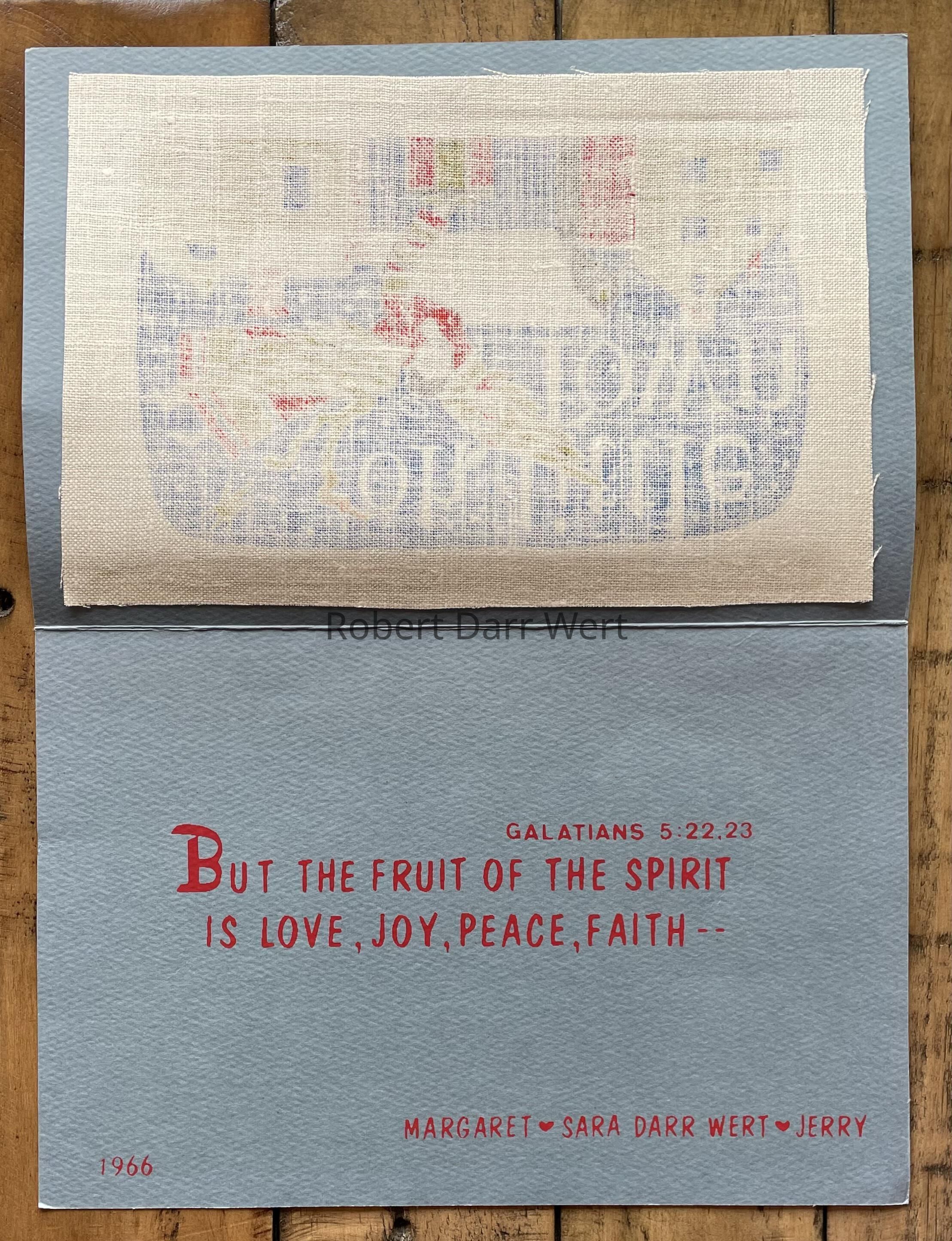 The interior of the notecard is custom printed for the Wert family. “But the fruit of the spirit is love, joy, peace, faith…, Galatians 5:22.23”. The printed message also states, “1966” (lower left), and “Margaret, Sara Darr Wert, Jerry”, with hearts in the place of commas (lower right). This is the Wert family’s first Christmas greeting after Robert Dar Wert’s death in January of 1966.