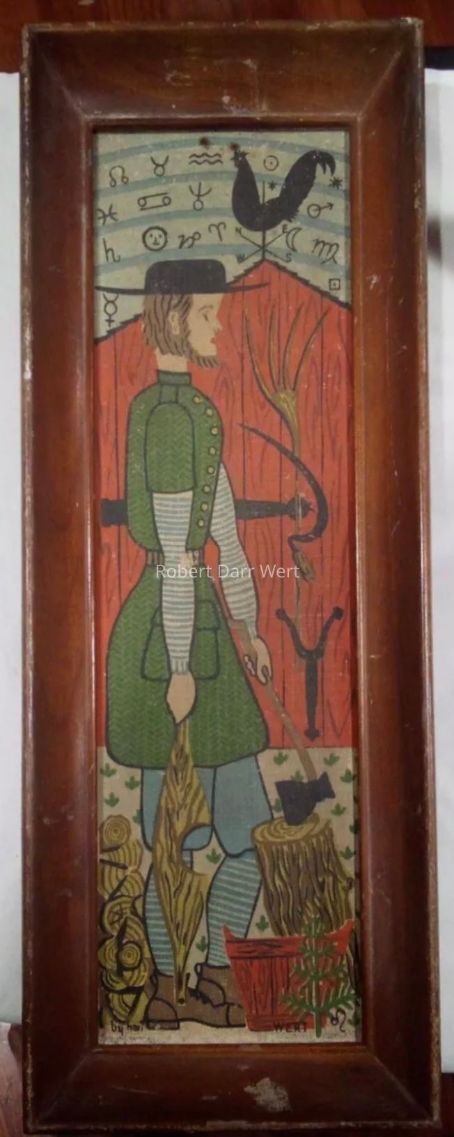 Country Man: a Pennsylvania “Dutch” farmer in 18th century dress stands in profile against a red barn. Implements of work surround him: a sickle and hay fork are on the barn wall, and in his hands he holds an ax and a yoke for hauling water. A wooden water bucket, a pile of split wood and an unsplit log are at his feet. Atop the barn is a rooster weathervane. The sky is streaked with curving blue meridian lines and in between are zodiac symbols, a reference to The Farmers Almanac. Wert’s zodiac symbol, Leo, is near his signature, to the right of the water bucket.