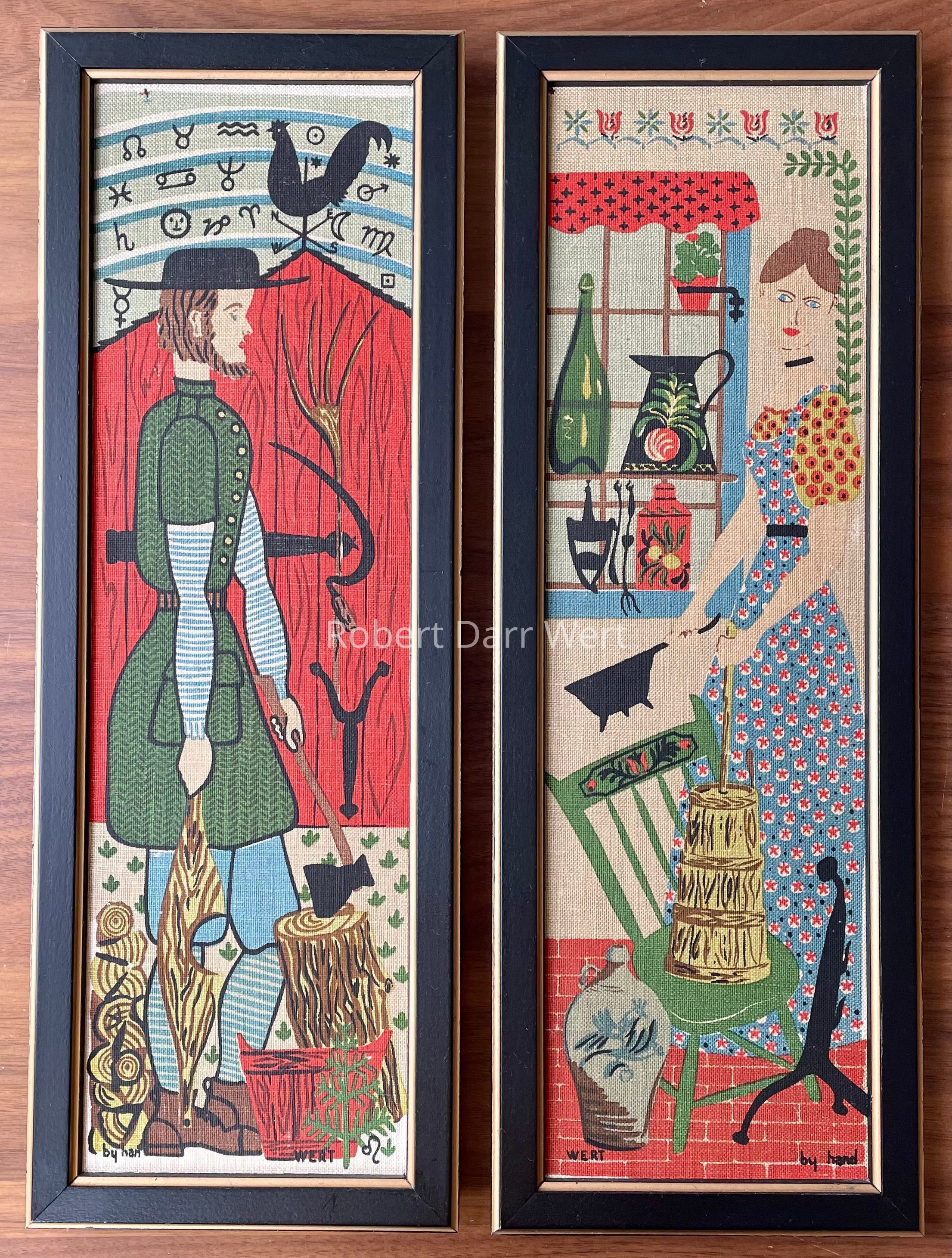 Two ten-color silkscreen prints on off-white linen. Compositions depict a country man and a country woman surrounded by tools of daily work on an early American farm.