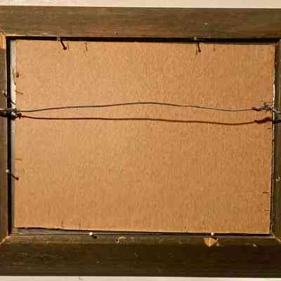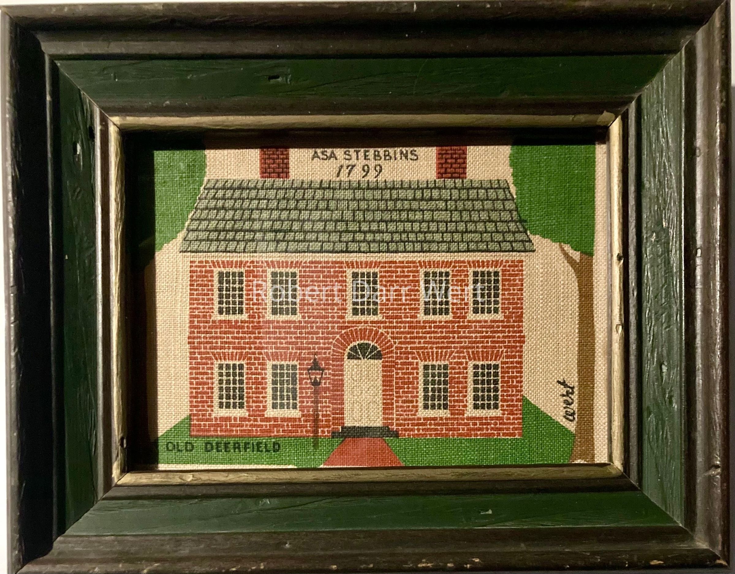 A silkscreen print on linen dry-mounted to chipboard. Imagery depicts the brick Asa Stebbins house at Old Deerfield Village (now Historic Deerfield) in Deerfield, Massachesetts.