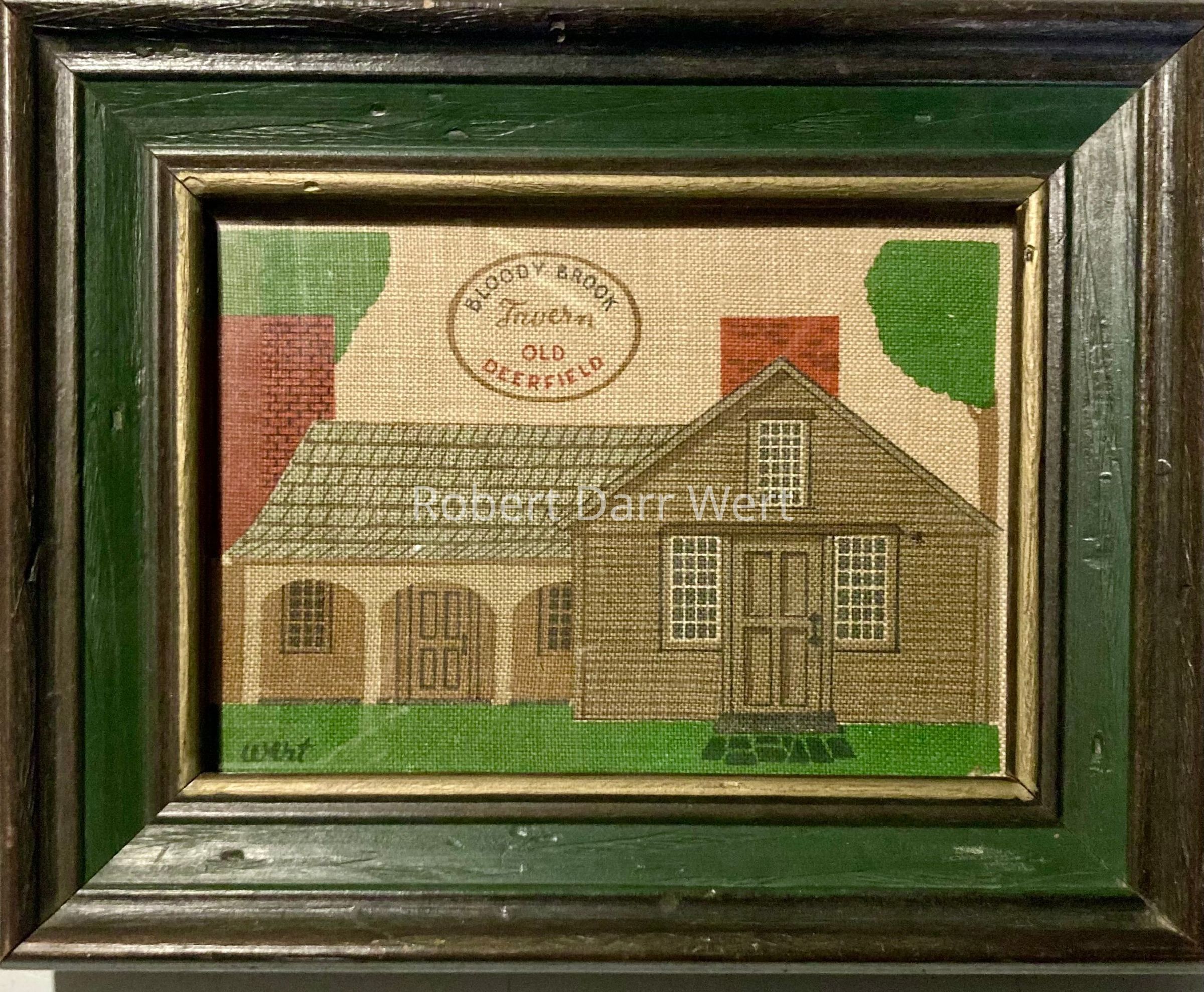 A silkscreen print on linen dry-mounted on chipboard depicting the Bloody Brook Tavern located at Old Deerfield Village, Massachusetts, now known as Historic Deerfield. The tavern is presented in elevation view, with partial perspective on the roofline at left. Typical muted Colonial era colors are utilized.