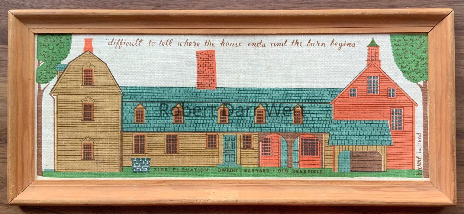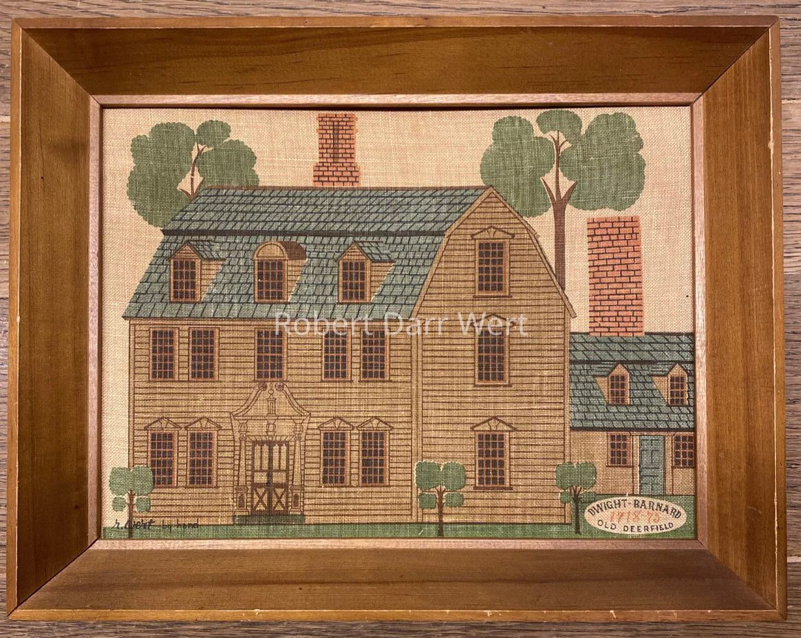 A silkscreen print on linen depicting the Dwight-Barnard House at Old Deerfield Village, a historic site in Massachusetts, now known at Historic Deerfield. The Dwight-Barnard House was the subject of two separate prints by Wert; see images. It is now known as the Dwight House; see web link.