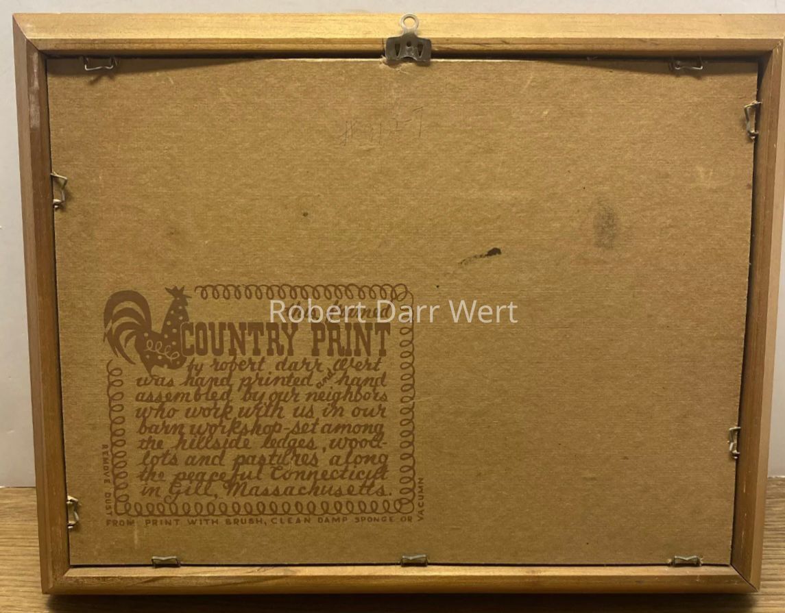 Likely first produced in the late 1950’s, this print was listed singly on a 1958 Country Prints packing slip. It appears as one of a pair with the John Wilson House on the January 1960 Country Prints price list in a choice of antique birch or flat black frames, and as “Deerfield Houses 912-7 Pair” in the c.1960 brochure “Country Prints in Frames Designed by Robert Darr Wert”; see images.Made/Created