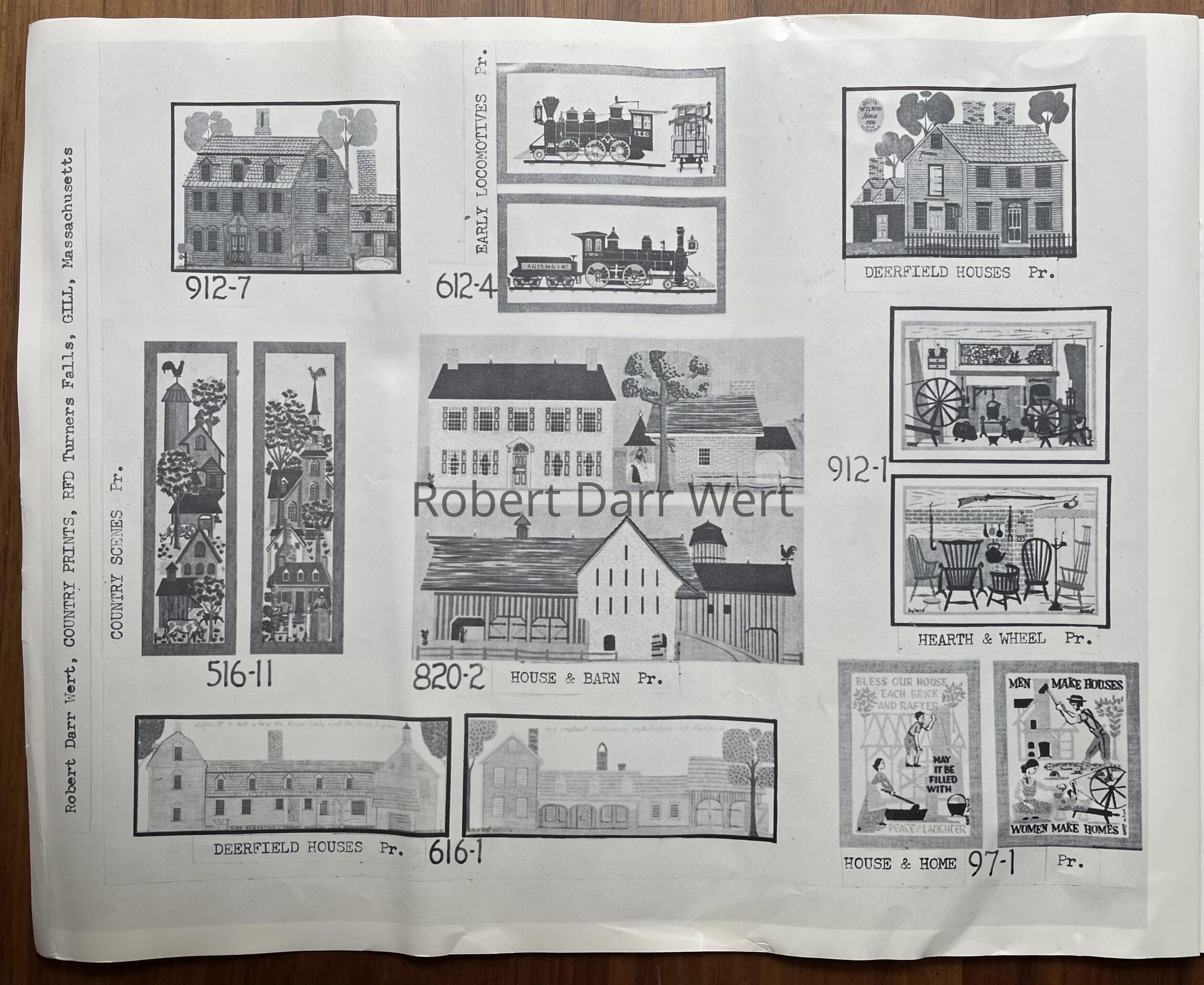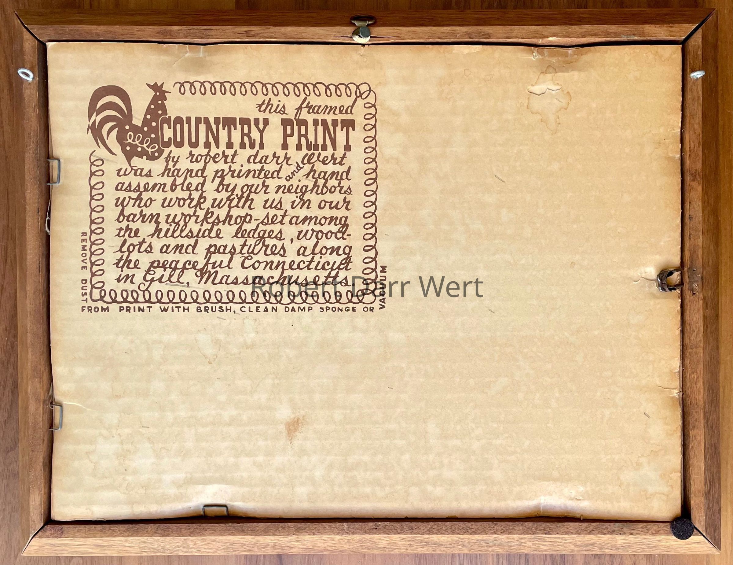 Likely first produced in the late 1950’s, this print was listed singly on a 1958 Country Prints packing slip. It appears as one of a pair with the Dwight-Barnard House on the January 1960 Country Prints price list in a choice of antique birch or flat black frames, and as “Deerfield Houses 912-7 Pair” in the c.1960 brochure “Country Prints in Frames Designed by Robert Darr Wert”; see images.