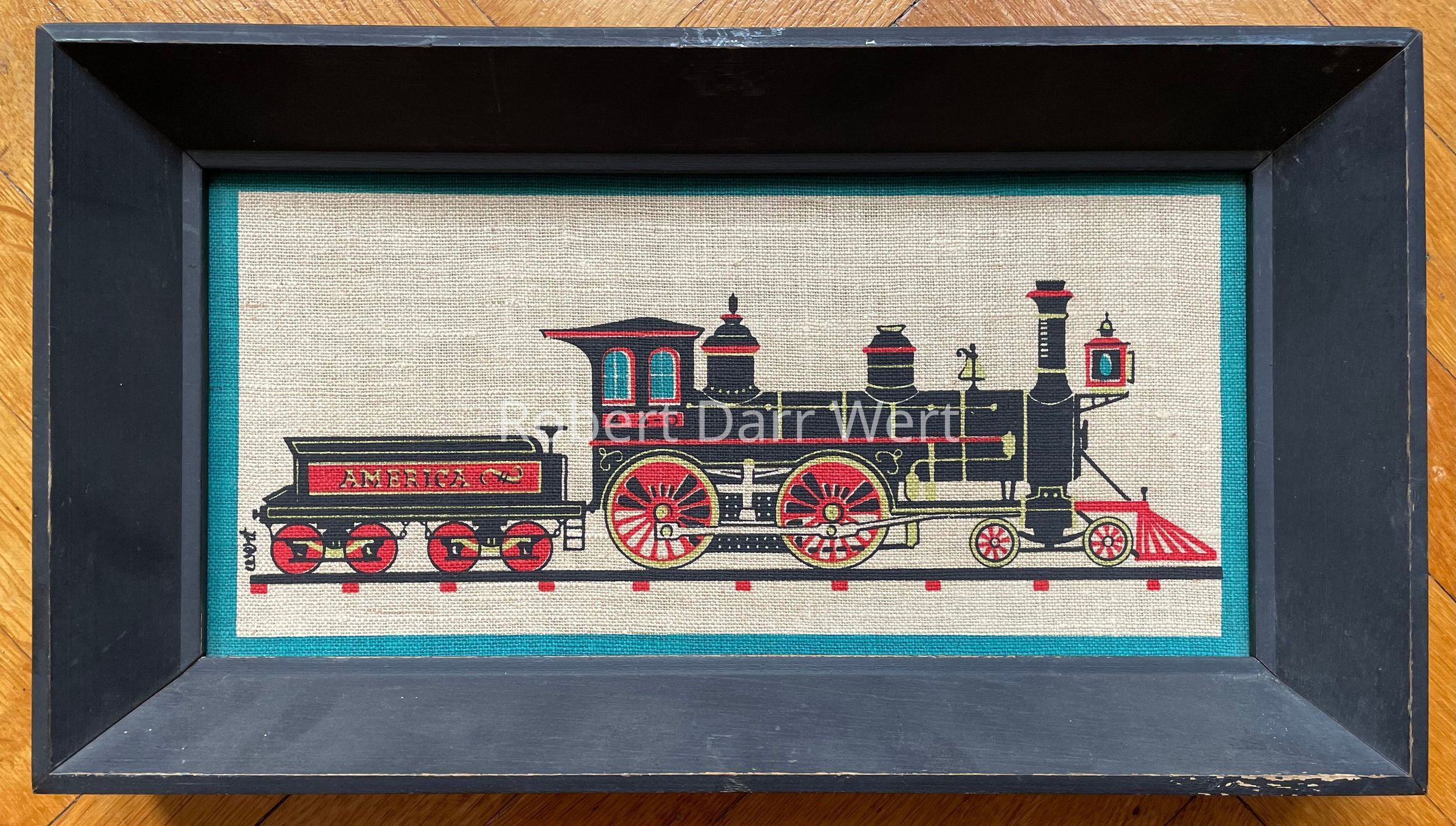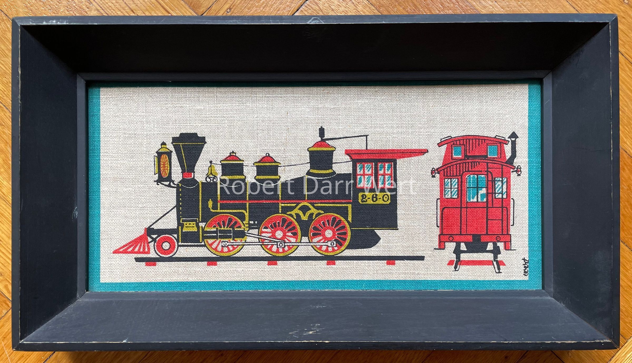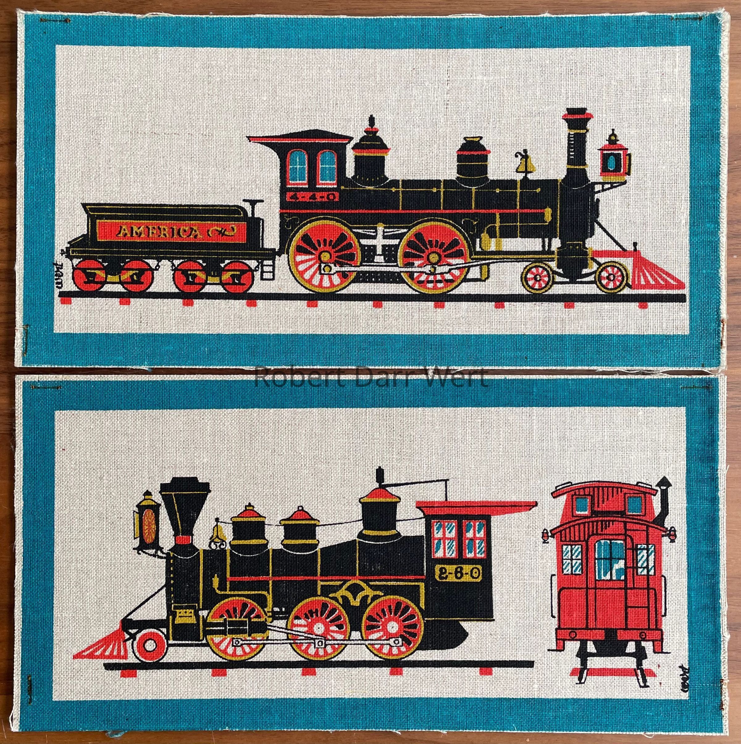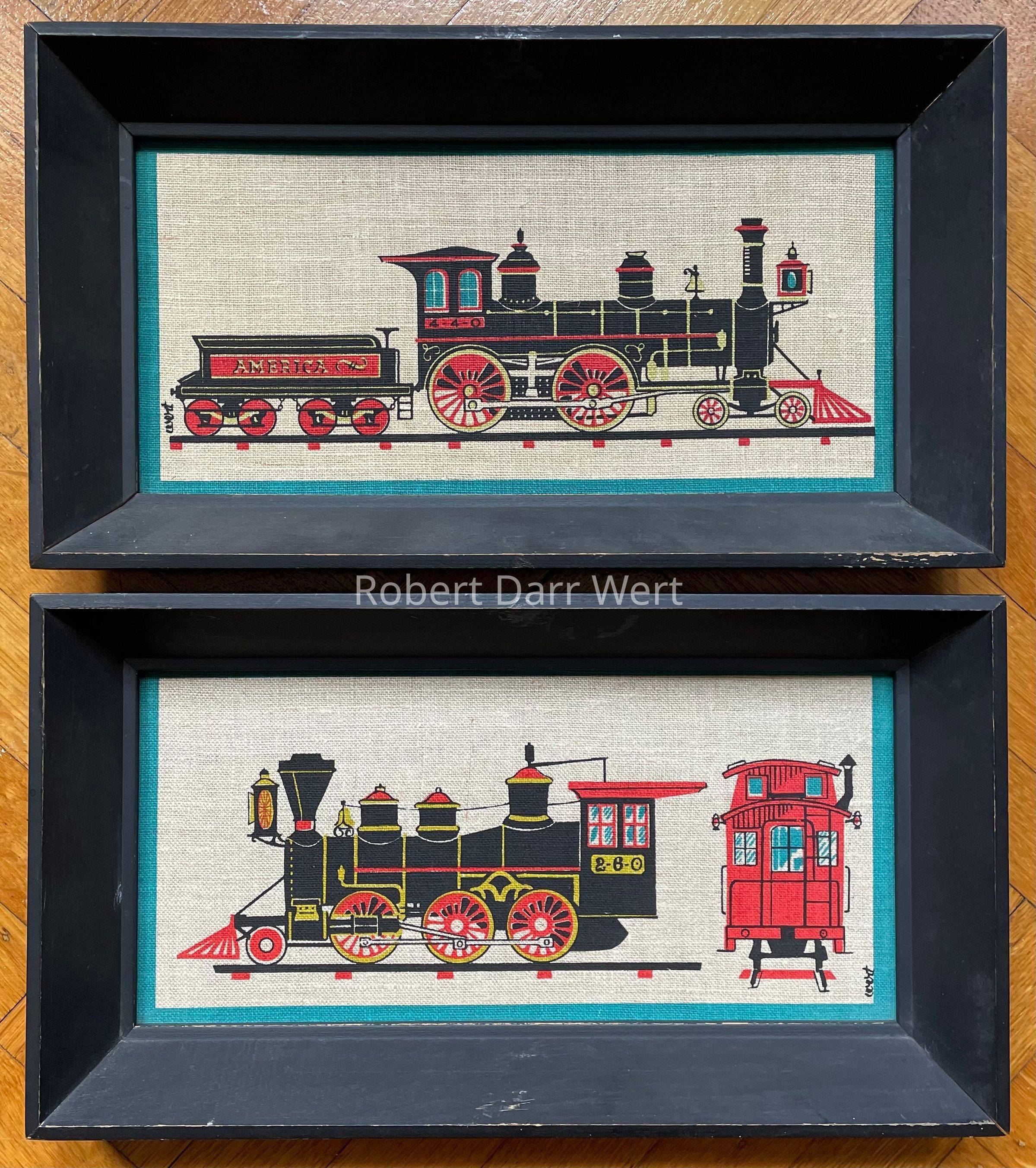 A pair of four-color silkscreen prints on off-white linen depicting examples of two early locomotive train engines, one shown with a caboose, the other with a tender (coal car). The compositions are finished with printed borders.