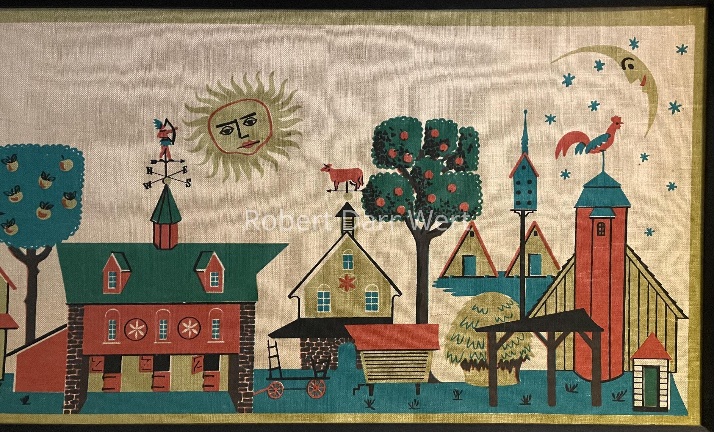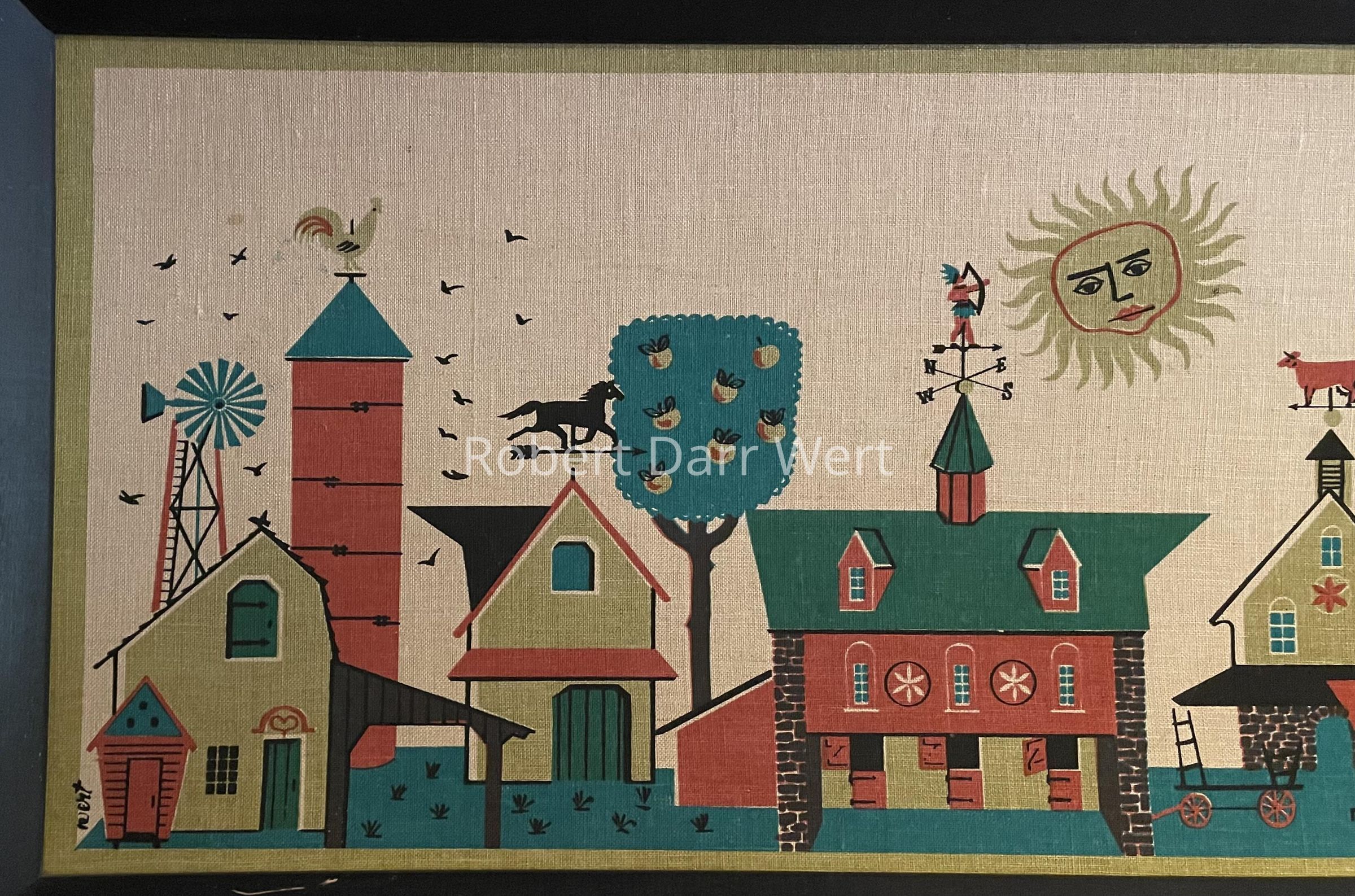 A four-screen/five-color silkscreen print on off-white linen depicting a group of farm structures topped with weathervanes. The central barn is modeled on Pennsylvania “Dutch” stone-ender barns, and the red silo at right is modeled on the silo of Wert’s barn workshop in Gill, MA. Five weathervanes top the structures. Fruiting trees are sculpted into rough topiaries, and a sun, moon and stars imply the transition from day to night. The composition is finished with a printed border.
