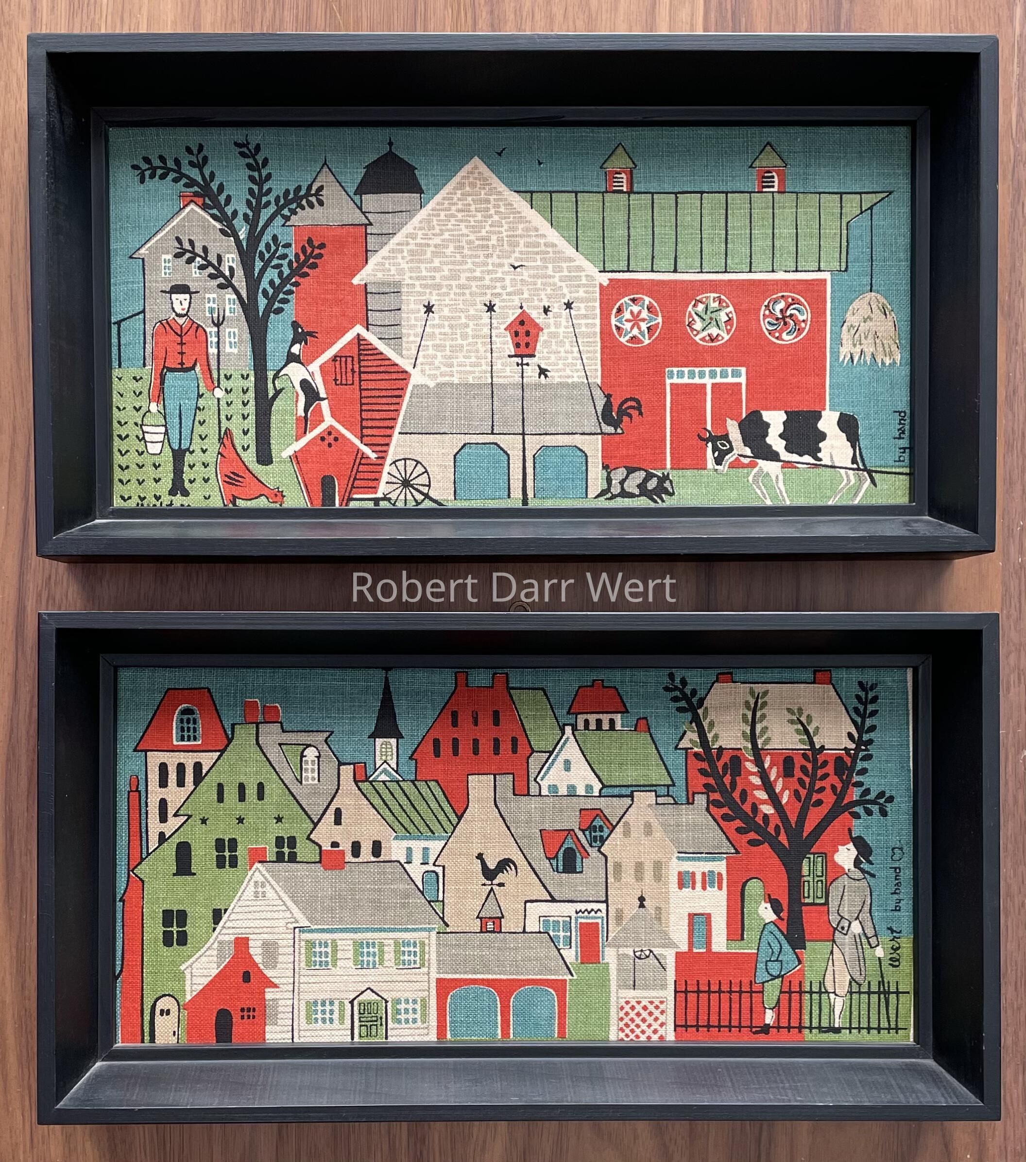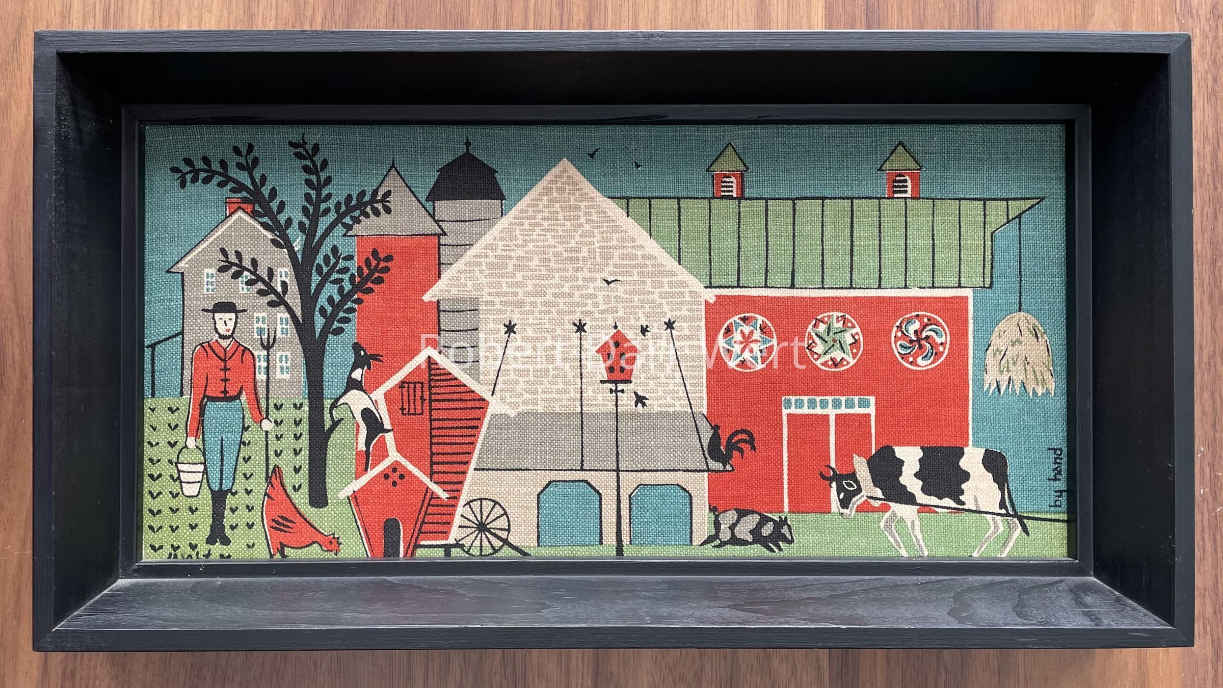 A six-color silkscreen print on off-white linen depicting a Pennsylvania “Dutch” barnyard scene dominated by a large barn complex including two silos, a corn crib and a hen house. The red stone-ender barn is accented with three large hex signs. A rooster, hen, goat and pig roam freely. At right, a yoked oxen pulls against tie lines connected to something out of the frame. At left, a farmer in work clothes holds a pail and pitchfork as he stands amidst rows of newly planted crops. Beyond is a stone farmhouse.