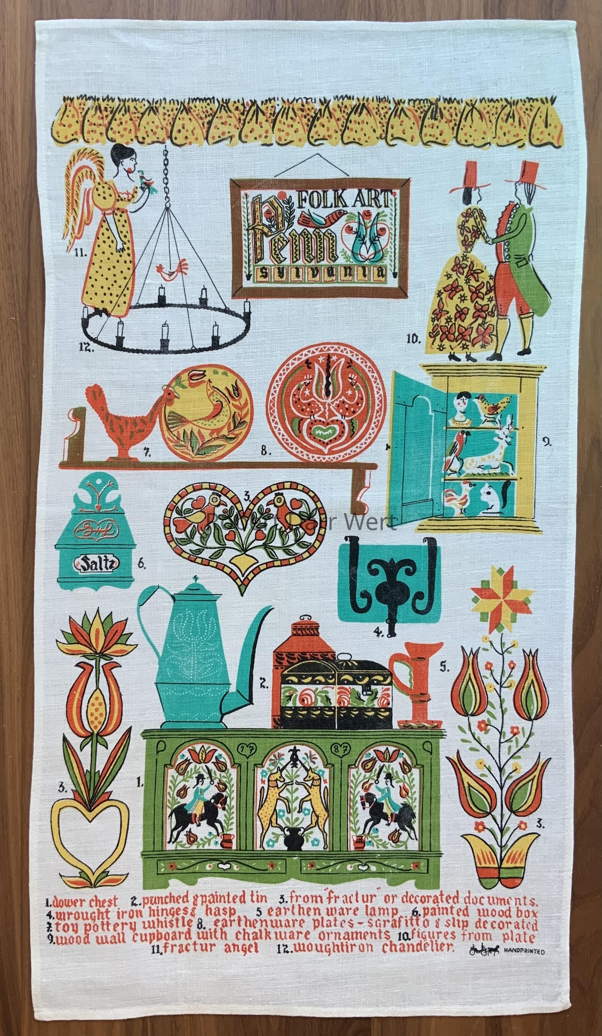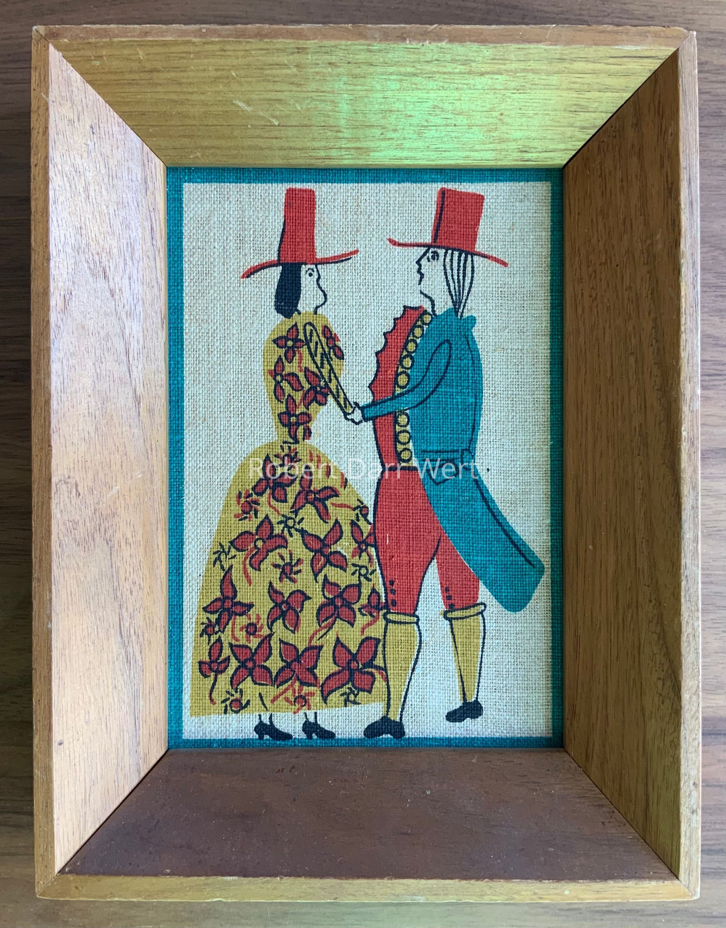A four-color silkscreen print on off-white linen depicting a couple in 18th c. dress, possibly dancing, bordered in an aqua silkscreened band. This illustration also appears on Wert’s Pennsylvania Dutch 204 towel/wallhanging keyed to the description, “figures from plate”; see images.Made/Created