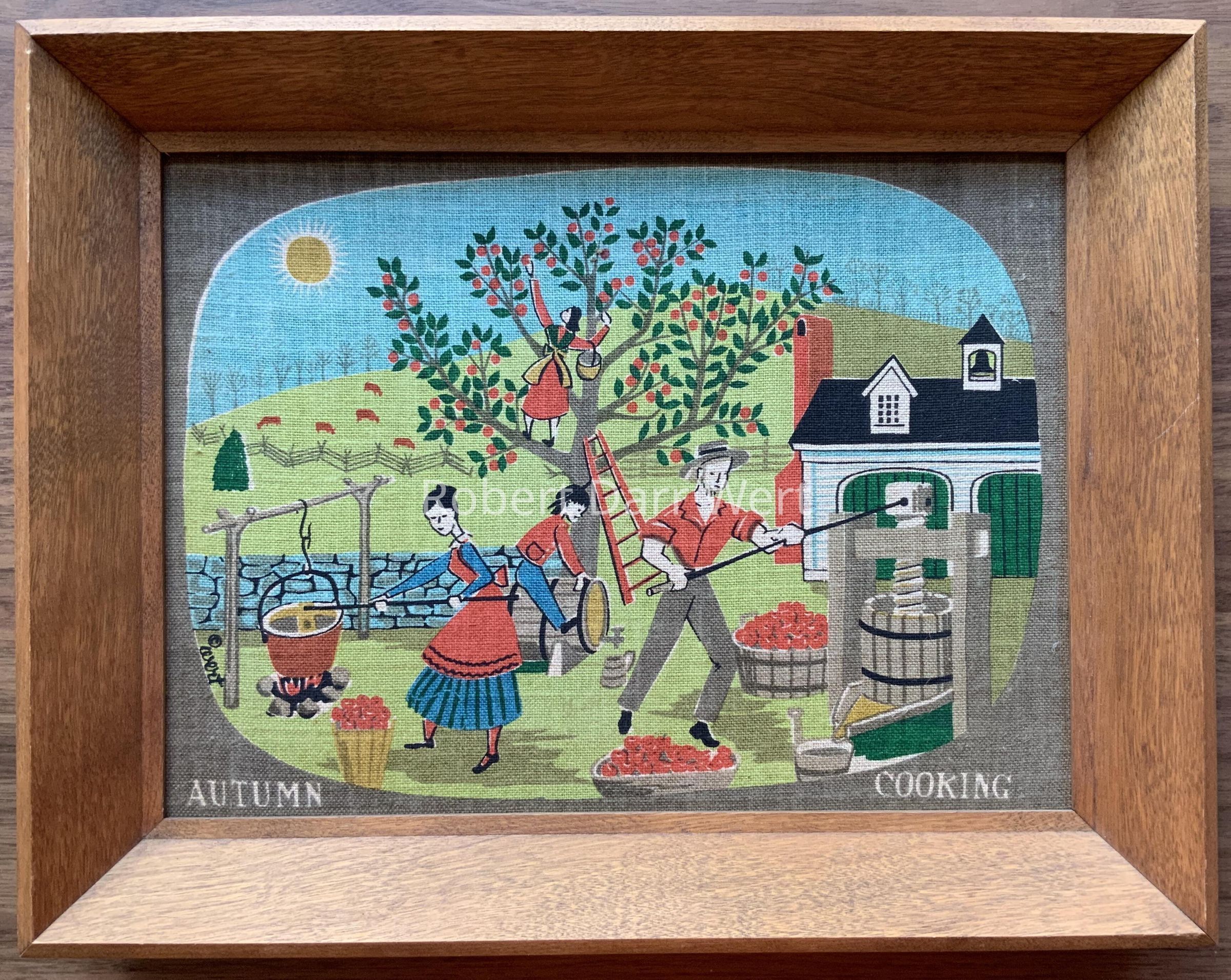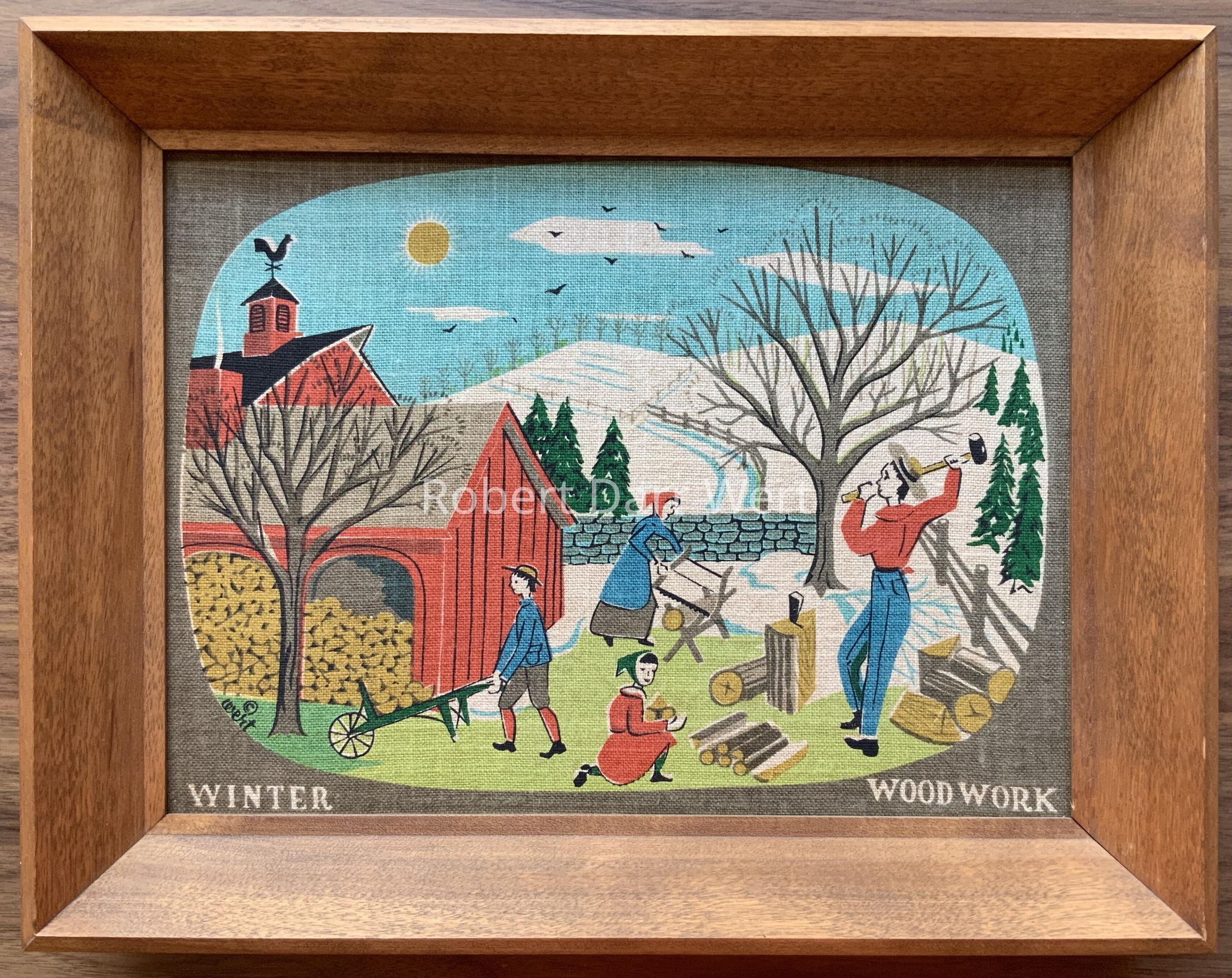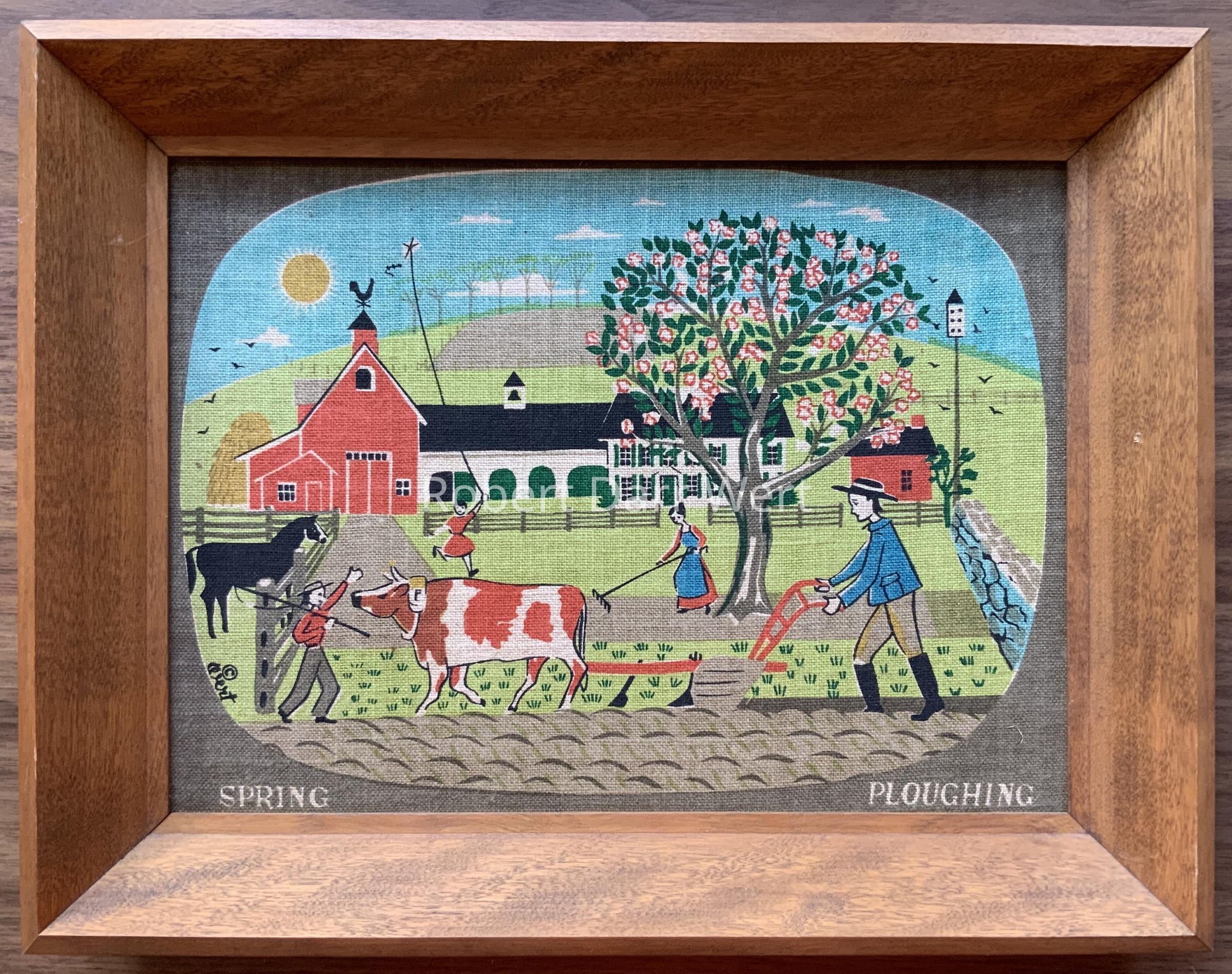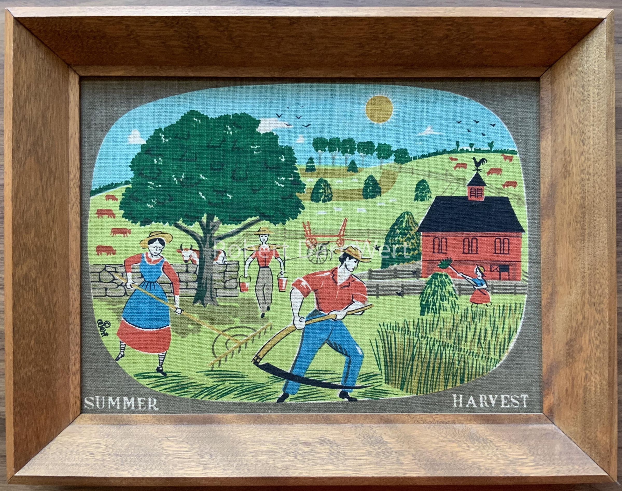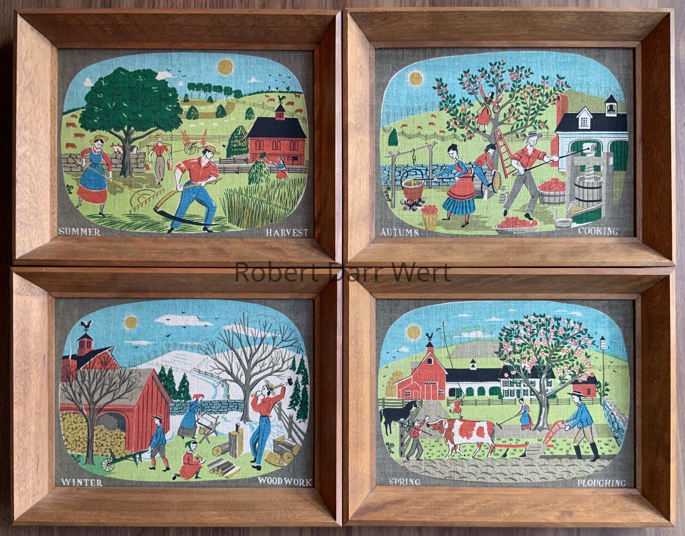 A set of four nine-color silkscreen prints on off-white linen depicting four seasons in the life of a farm family. Clockwise from upper left in first photo: