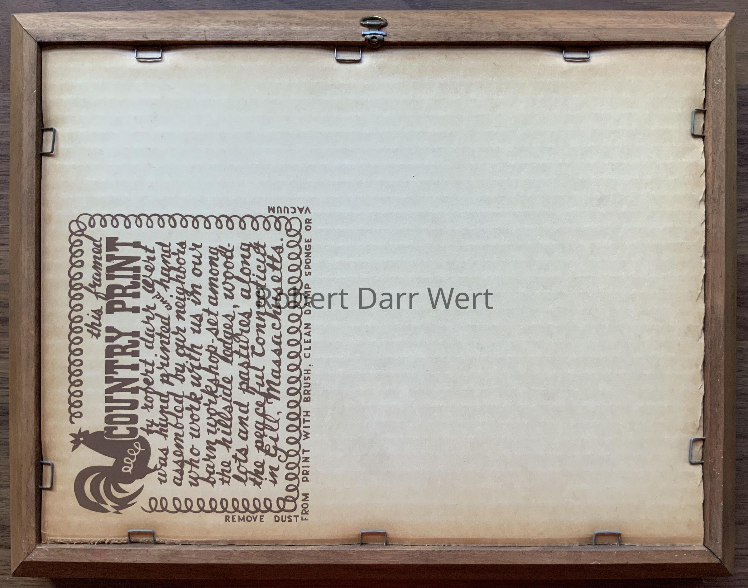 “© wert” in lowercase black script, lower left corner of each print. Country Prints imprint silkscreened in brown on backing panel of each frame.Dimensions