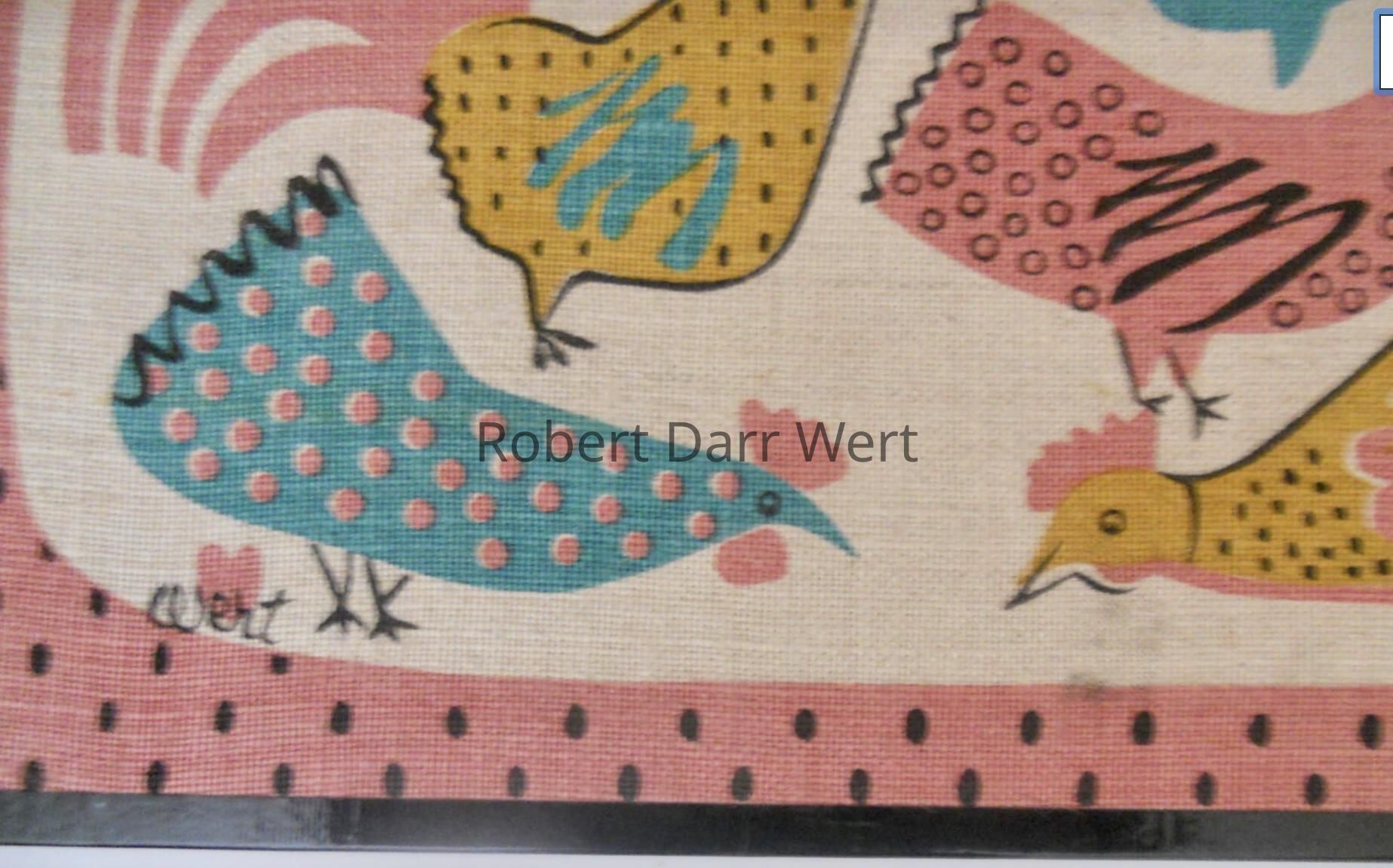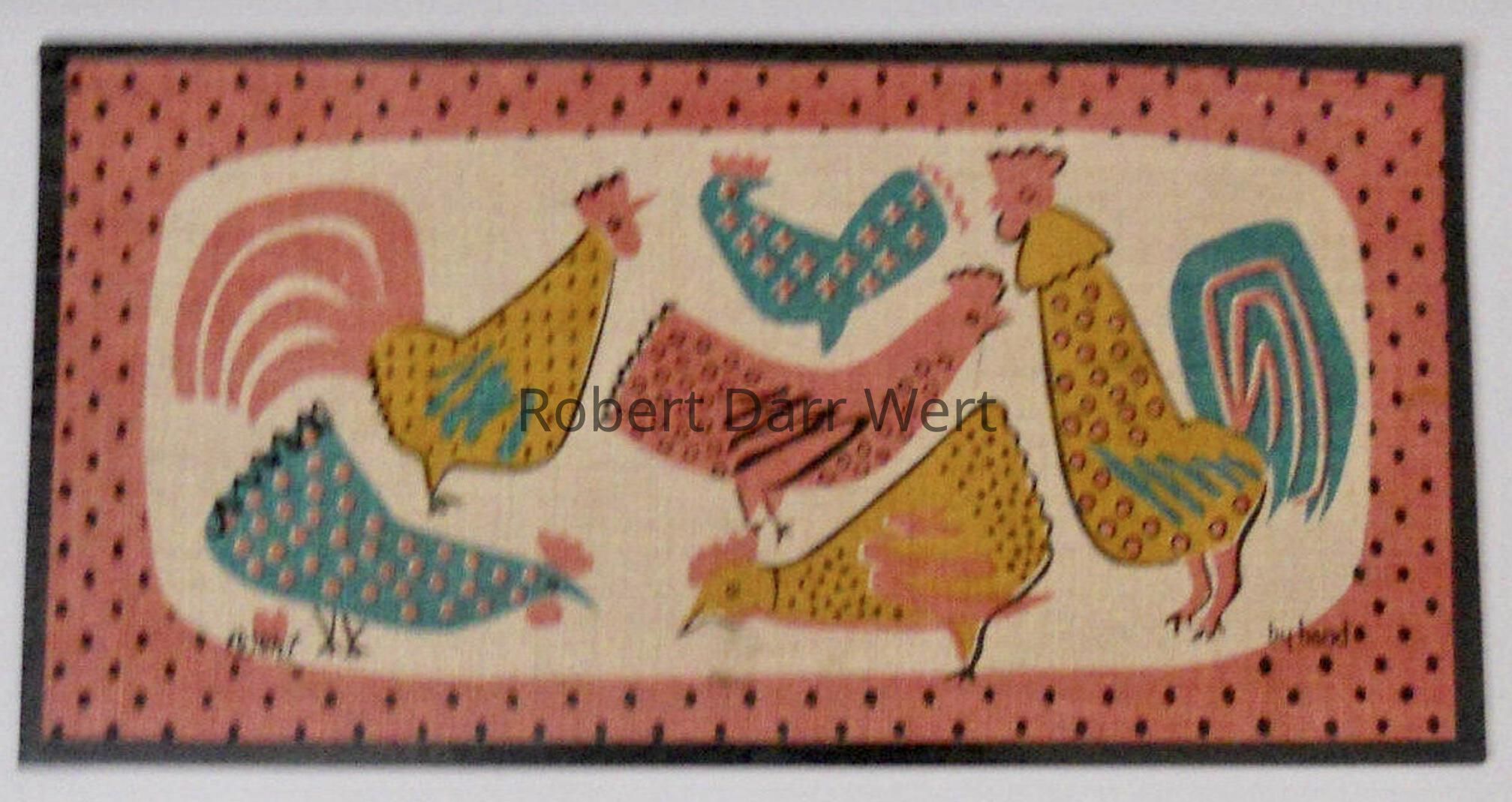 A five-color silkscreen print on off-white linen depicting six roosters and hens in various poses surrounded by a pink border with black polka dots. The bodies of the birds are superimposed with Wert’s interpretation of calico prints in lieu of feathers.