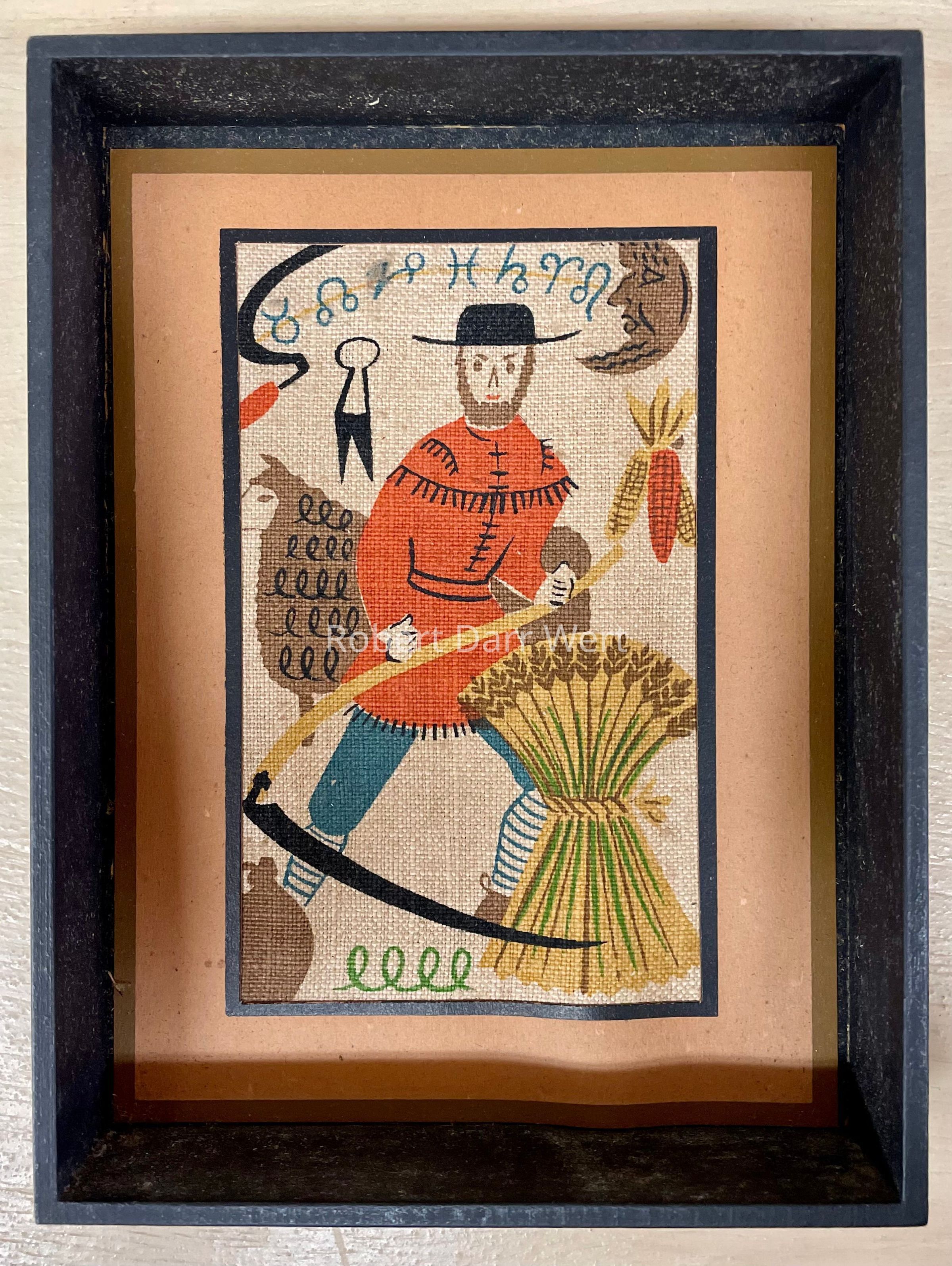A six-color silkscreen print on off-white linen depicting a farmer holding a scythe. Symbols of the harvest surround the farmer: a shock of wheat, a bundle of dried corn, a jug for cider, a sheep, the harvest moon, and symbols of the zodiac (a reference to the Farmers’ Almanac).
