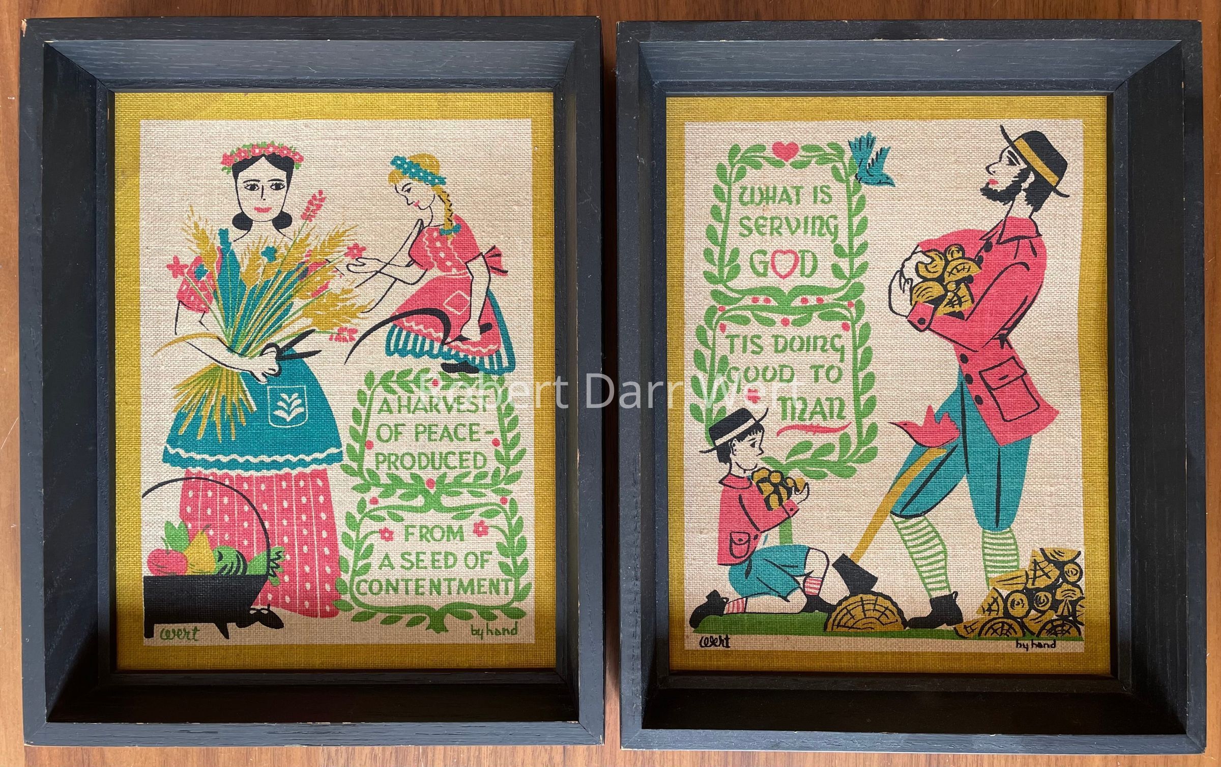 A pair of five-color silkscreen prints depicting Pennsylvania “Dutch” people in 18th century garb doing farm related work, supporting two maxims from Poor Richard’s Almanac by Benjamin Franklin.
