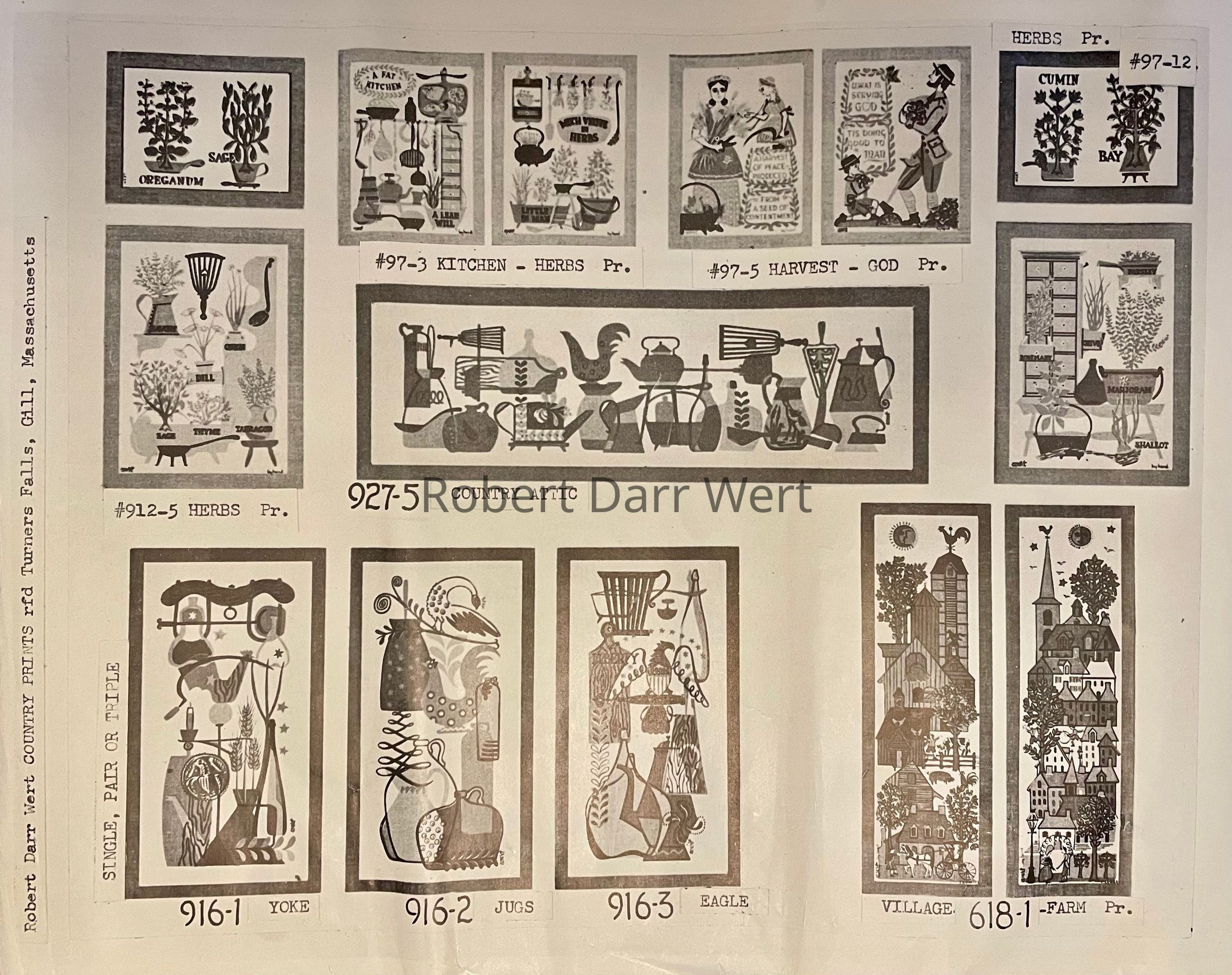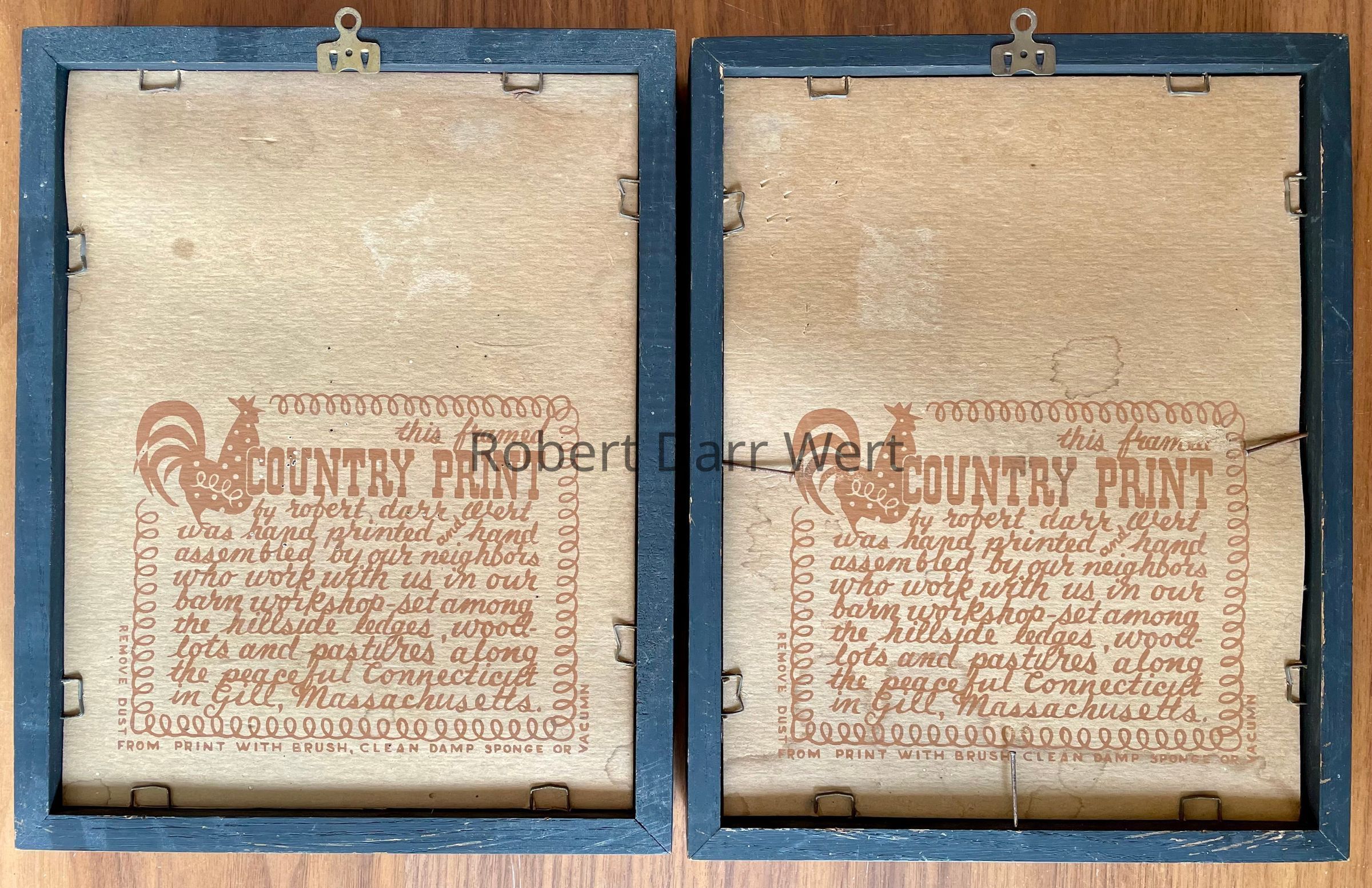 First produced in the late 1950’s, this pair of prints is listed in the January 1960 Country Prints price list, and appears in the c.1960 brochure “Country Prints in Frames Designed by Robert Darr Wert”. Prints were produced in a choice of antique birch or flat black frames.Made/Created