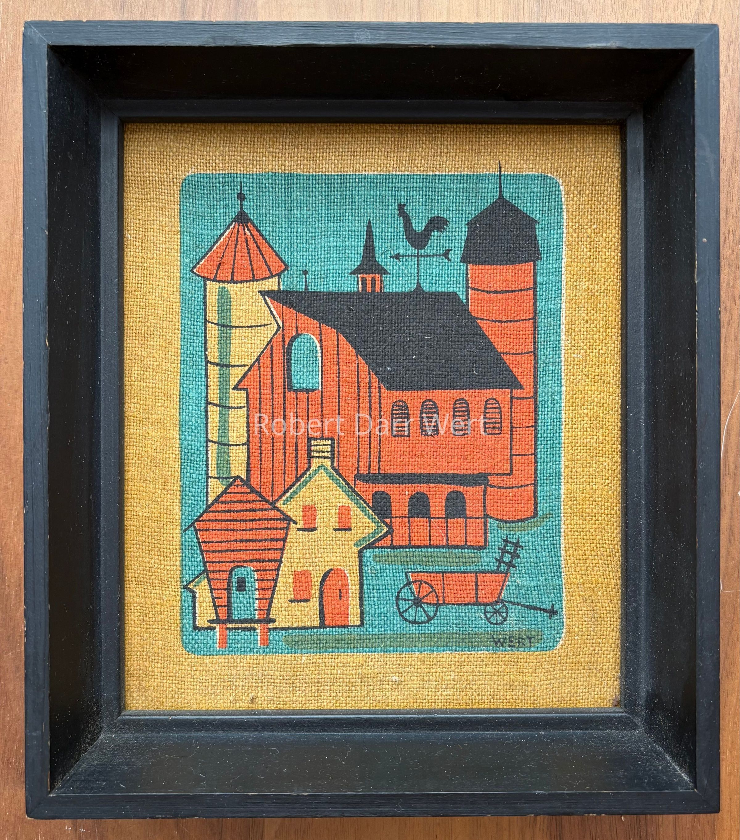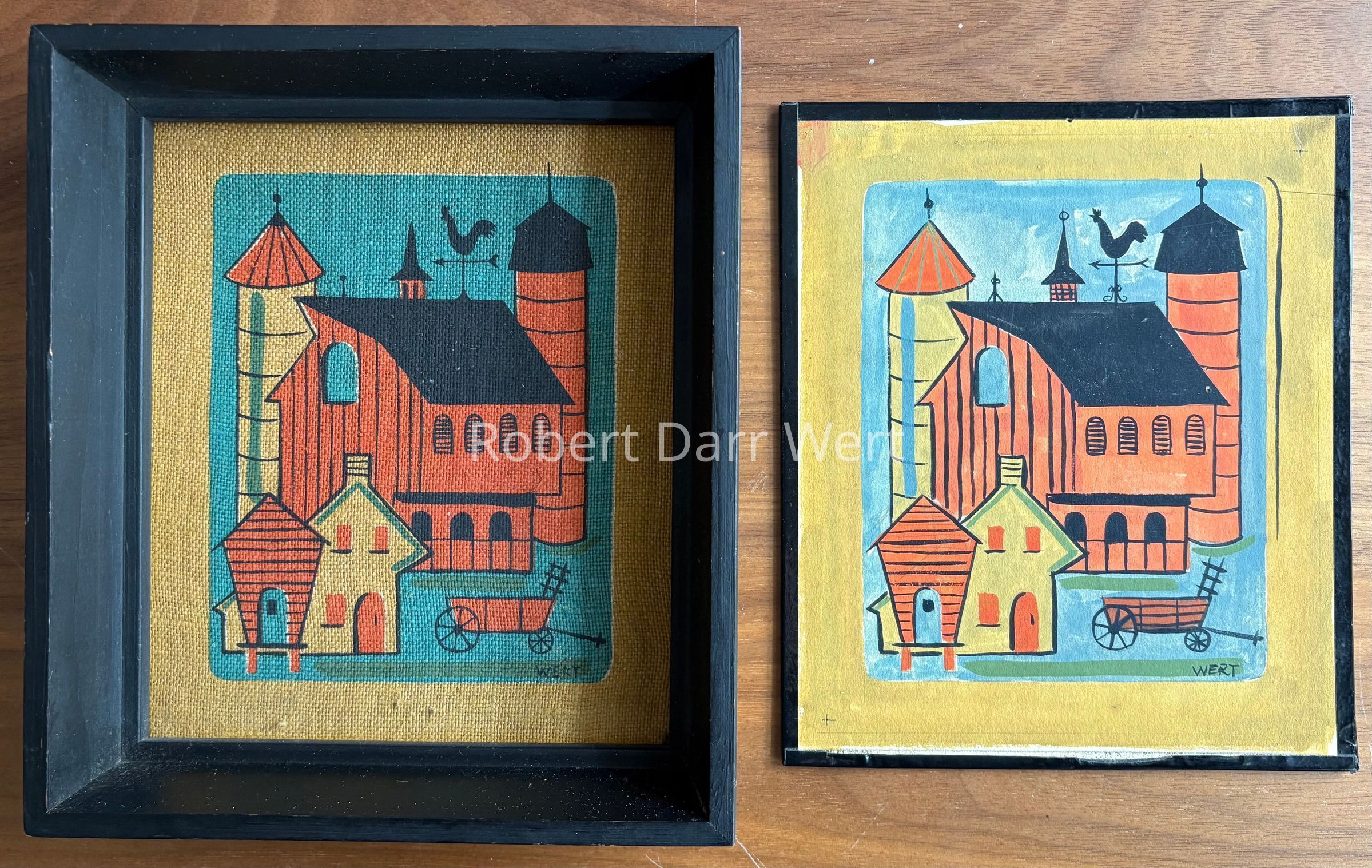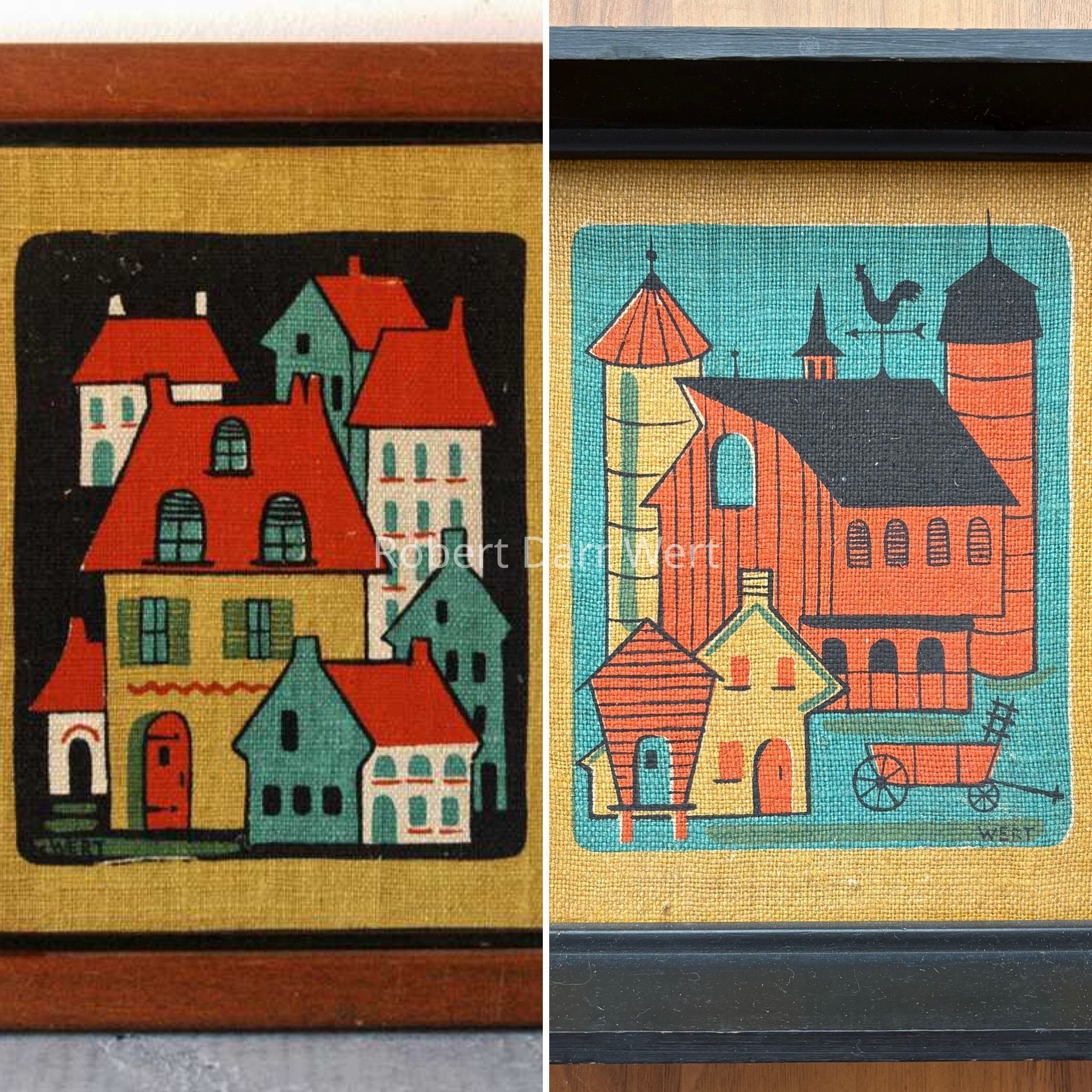 A pair of four-screen/five-color silkscreen prints on off-white linen. One print depicts six houses of varying size and height, all with red roofs. The second print depicts a large barn with a lightning rod, cupola and rooster weathervane, two silos with lightning rods, a saltbox farmhouse, a corn crib and an ox cart.