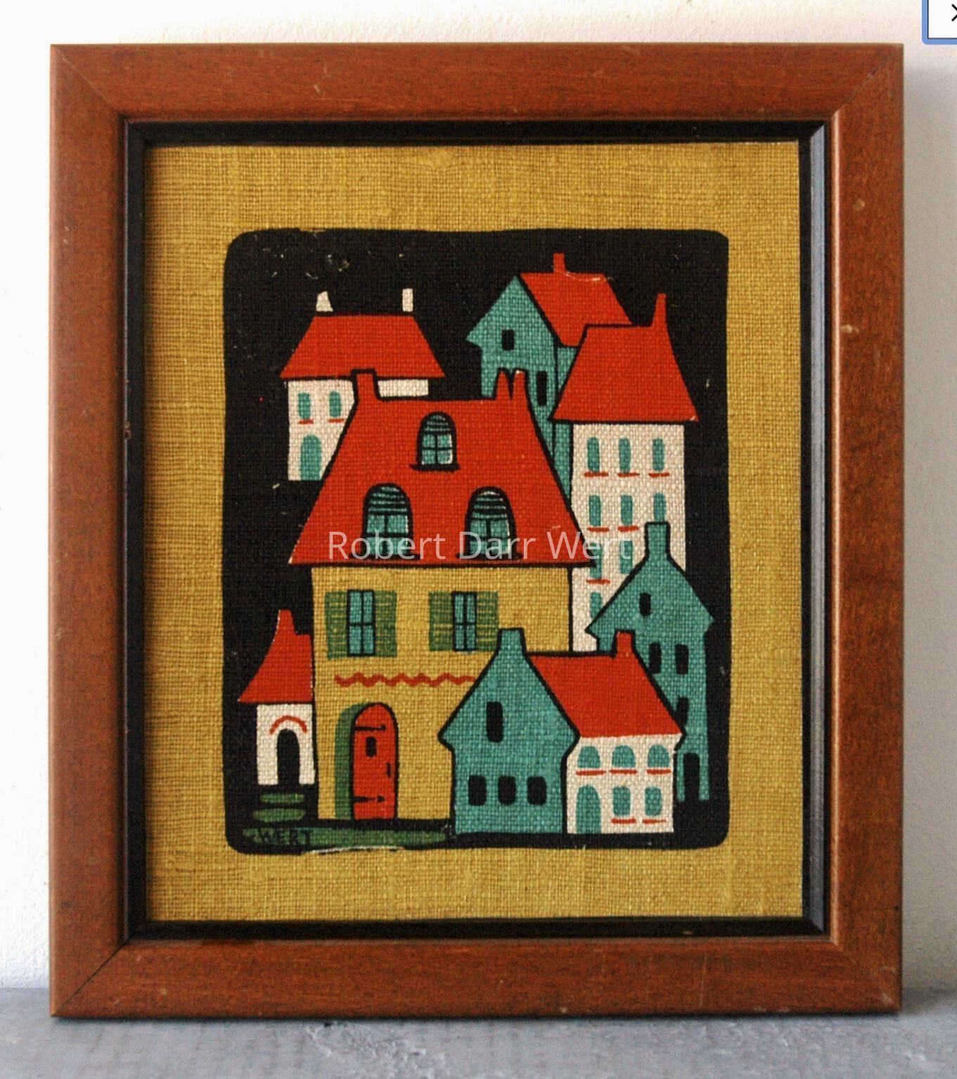 This pair of prints appears in the c.1955 brochure “Country Prints in Frames”, and a c.1955 price list with the description, “Village and Farm buildings suggest painting on glass — Mustard mats.”Made/Created