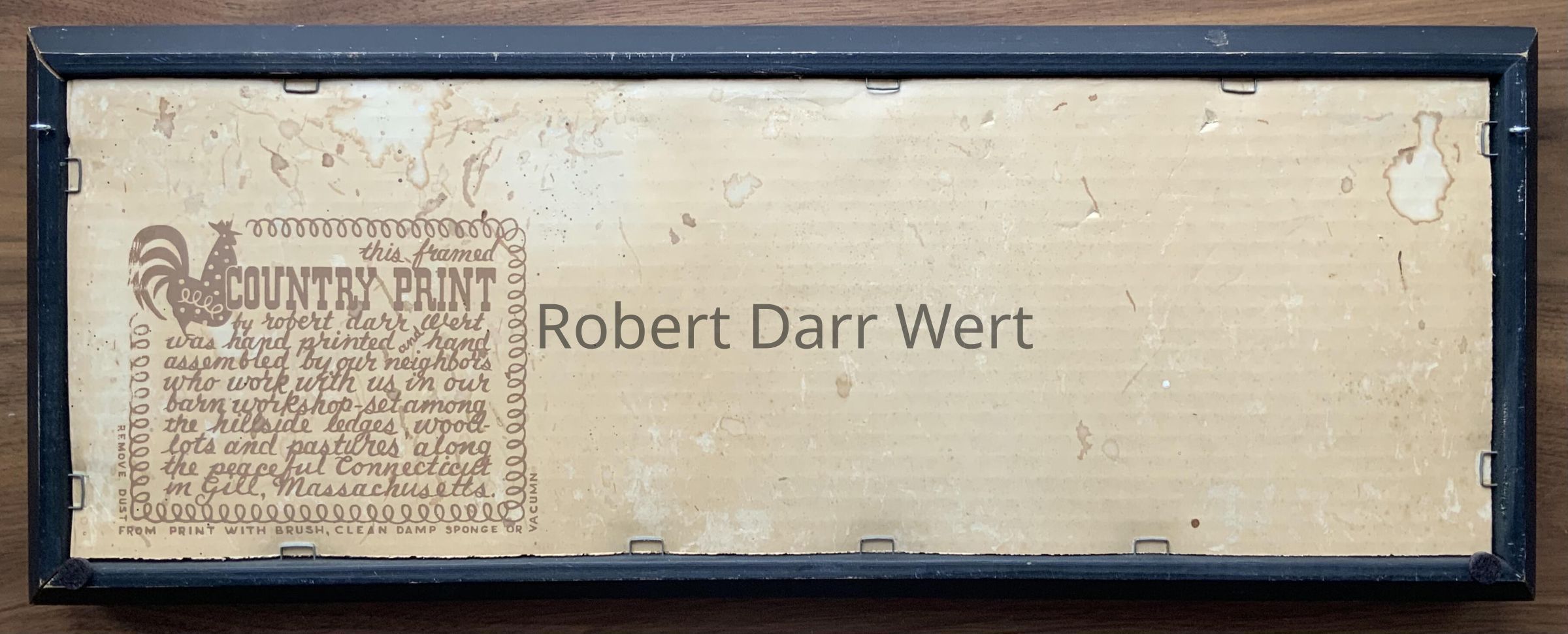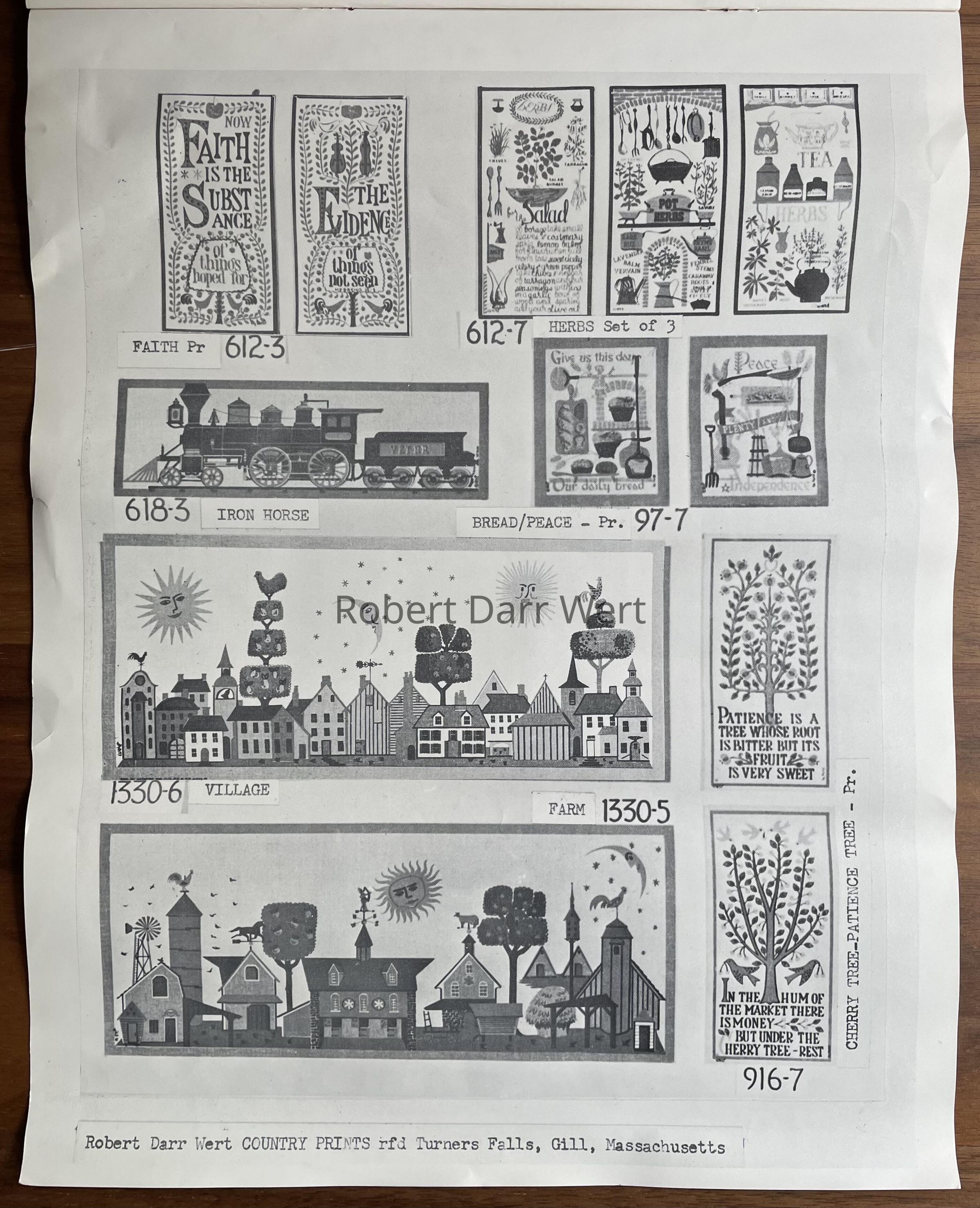 This print is listed in the January 1960 Country Prints price list, and appears in the c.1960 brochure “Country Prints in Frames Designed by Robert Darr Wert”. Prints were offered in a choice of antique birch or flat black frames.