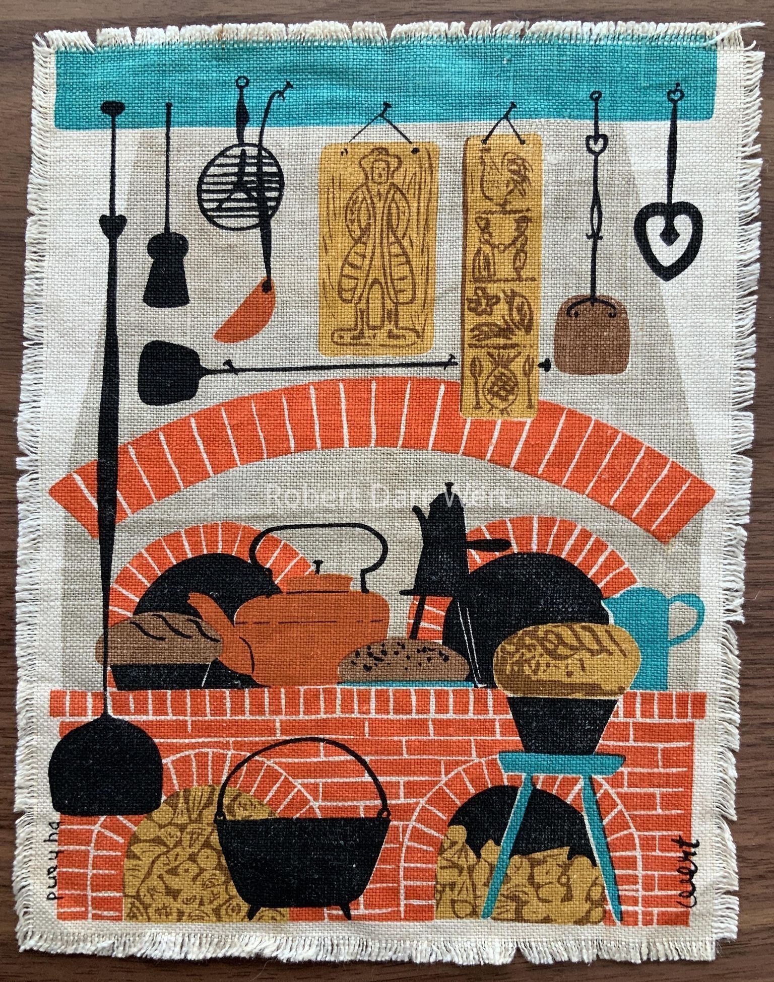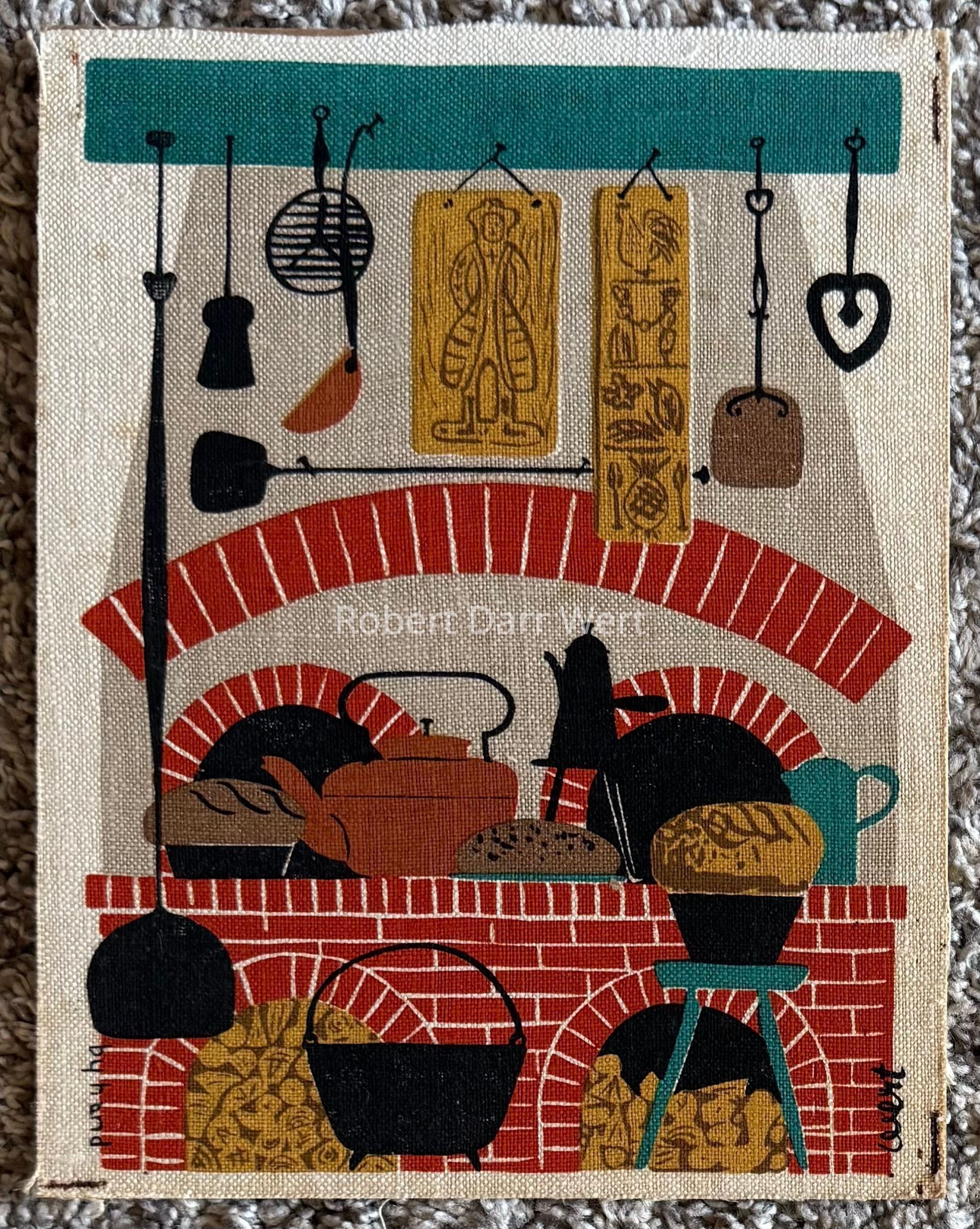 A six-color silkscreen print on off-white linen depicting wood-fired baking ovens, tools related to baking, and other kitchen tools, most hanging from a painted overhead beam. Tools are made of wrought iron, cast iron, and copper. The ovens are formed of red brick arches and the chimney mass is finished with a gray plaster or stucco. Carved wood springerle molds also hang from the overhead beam.