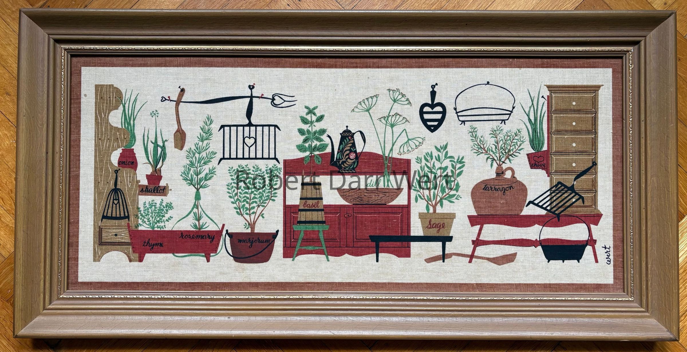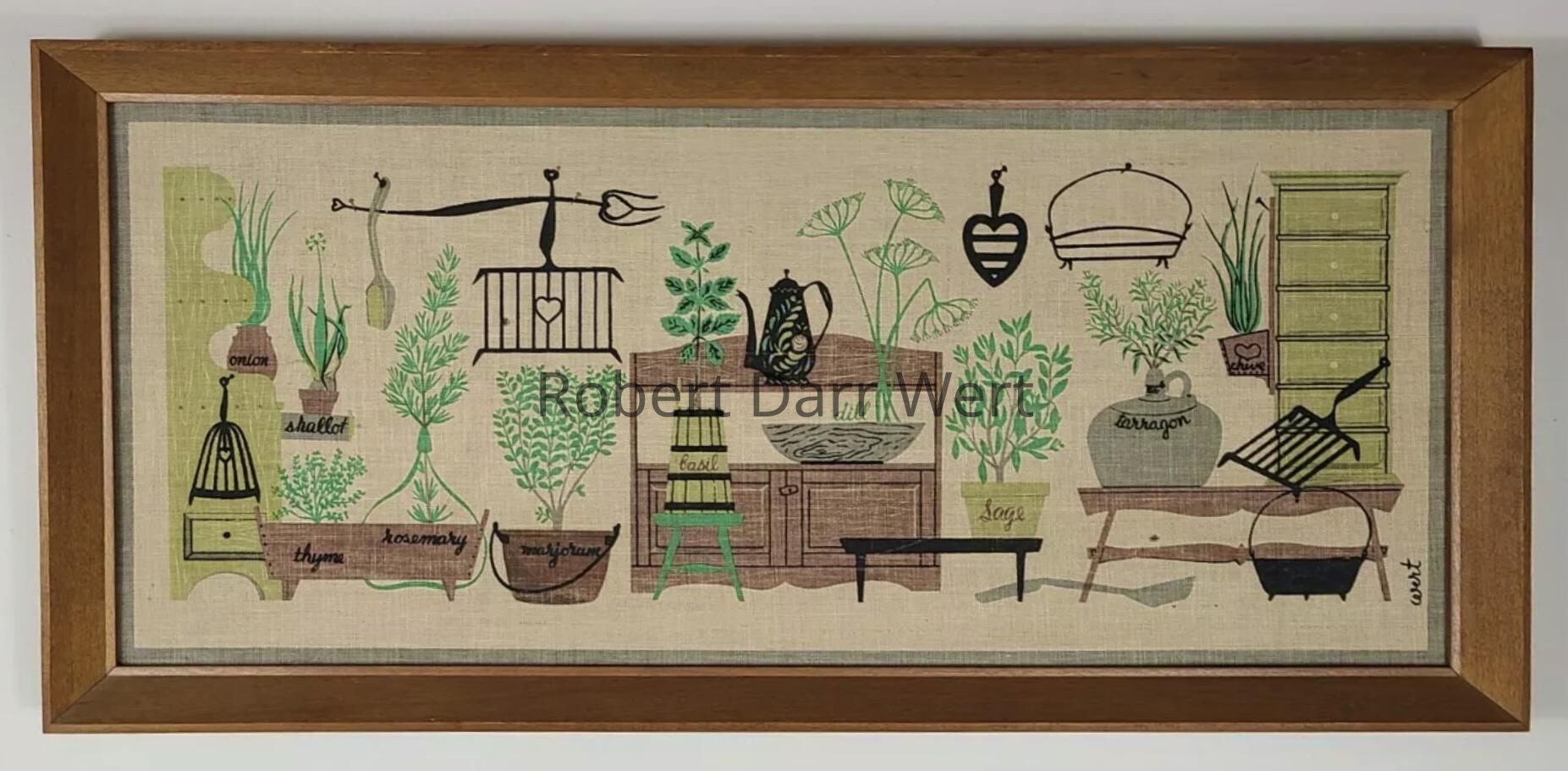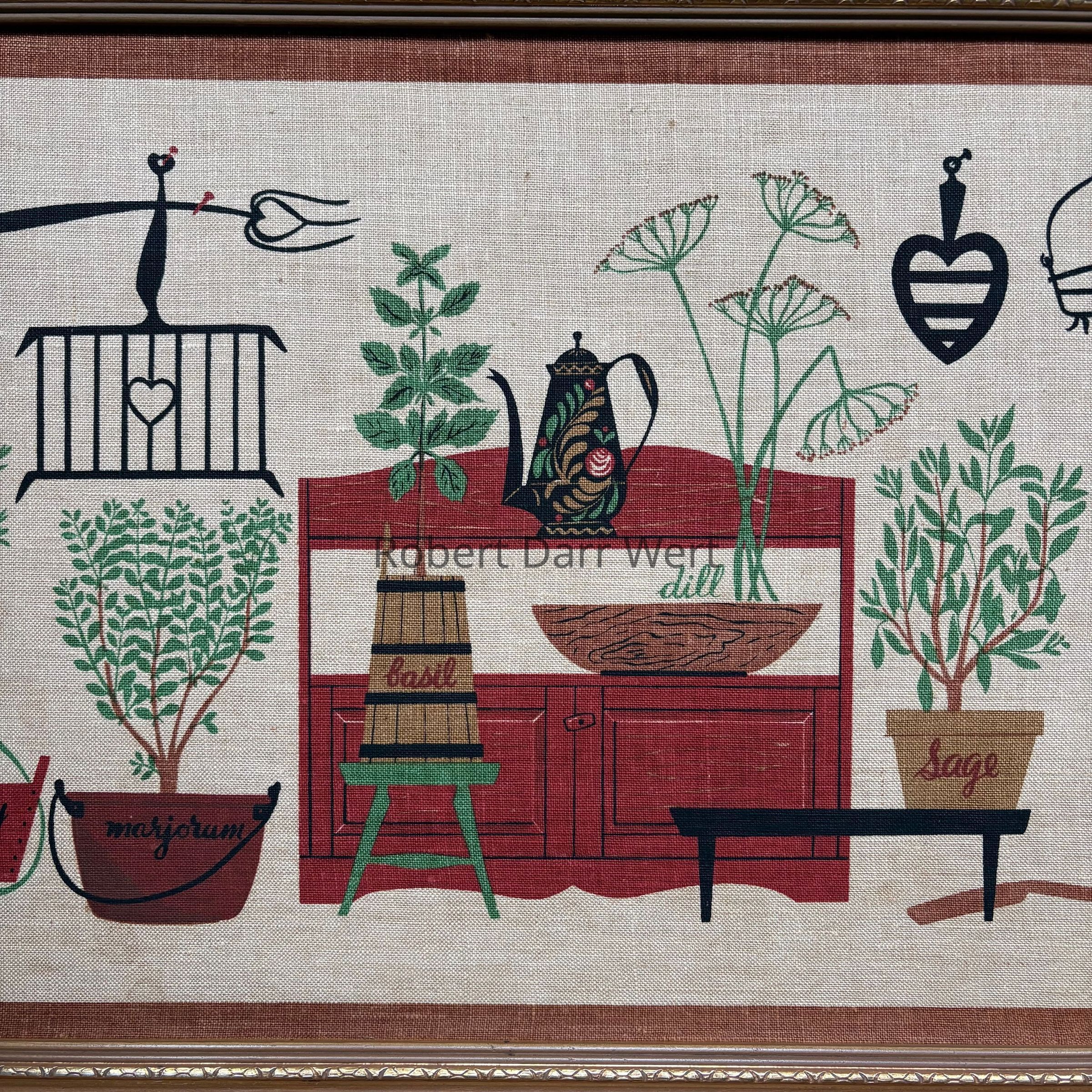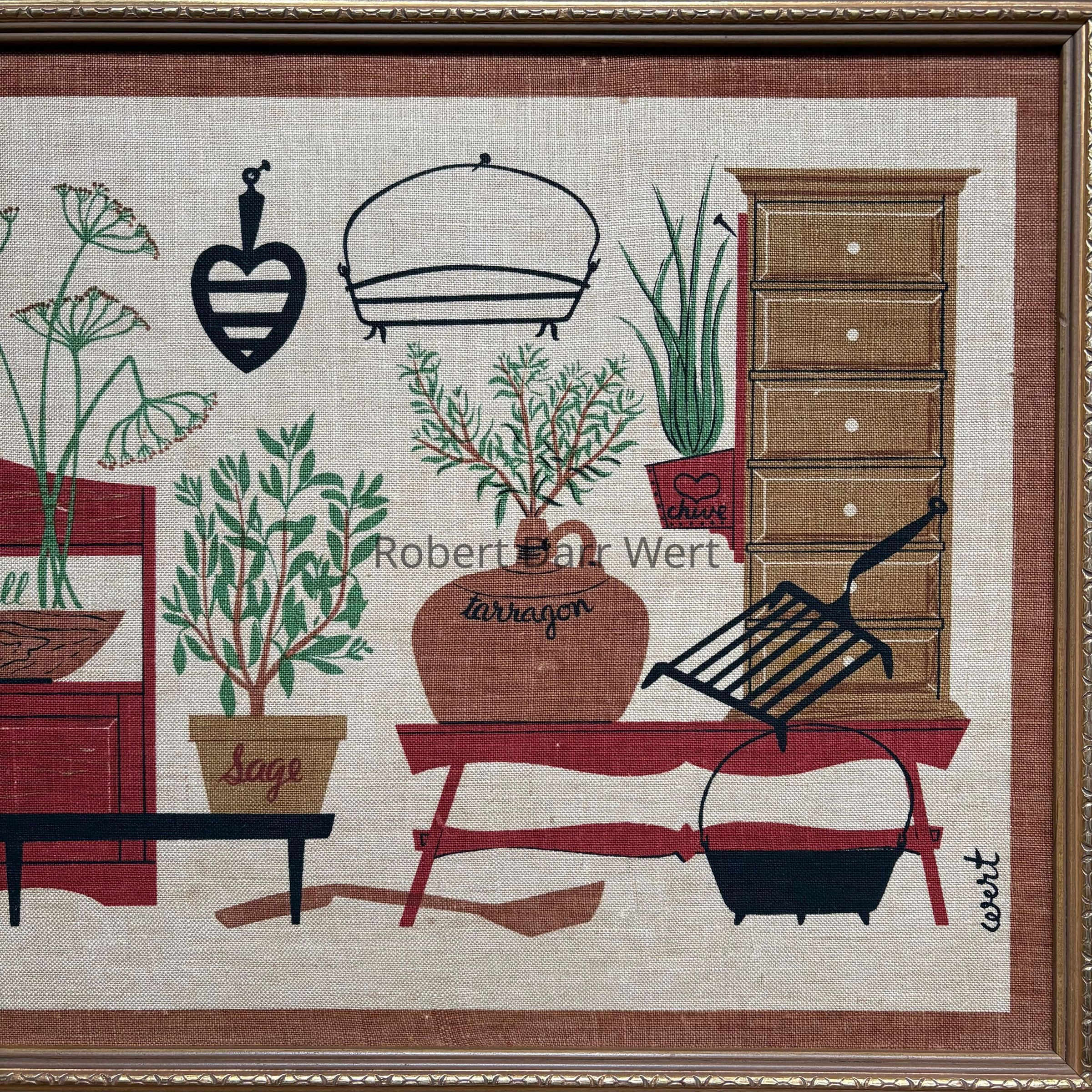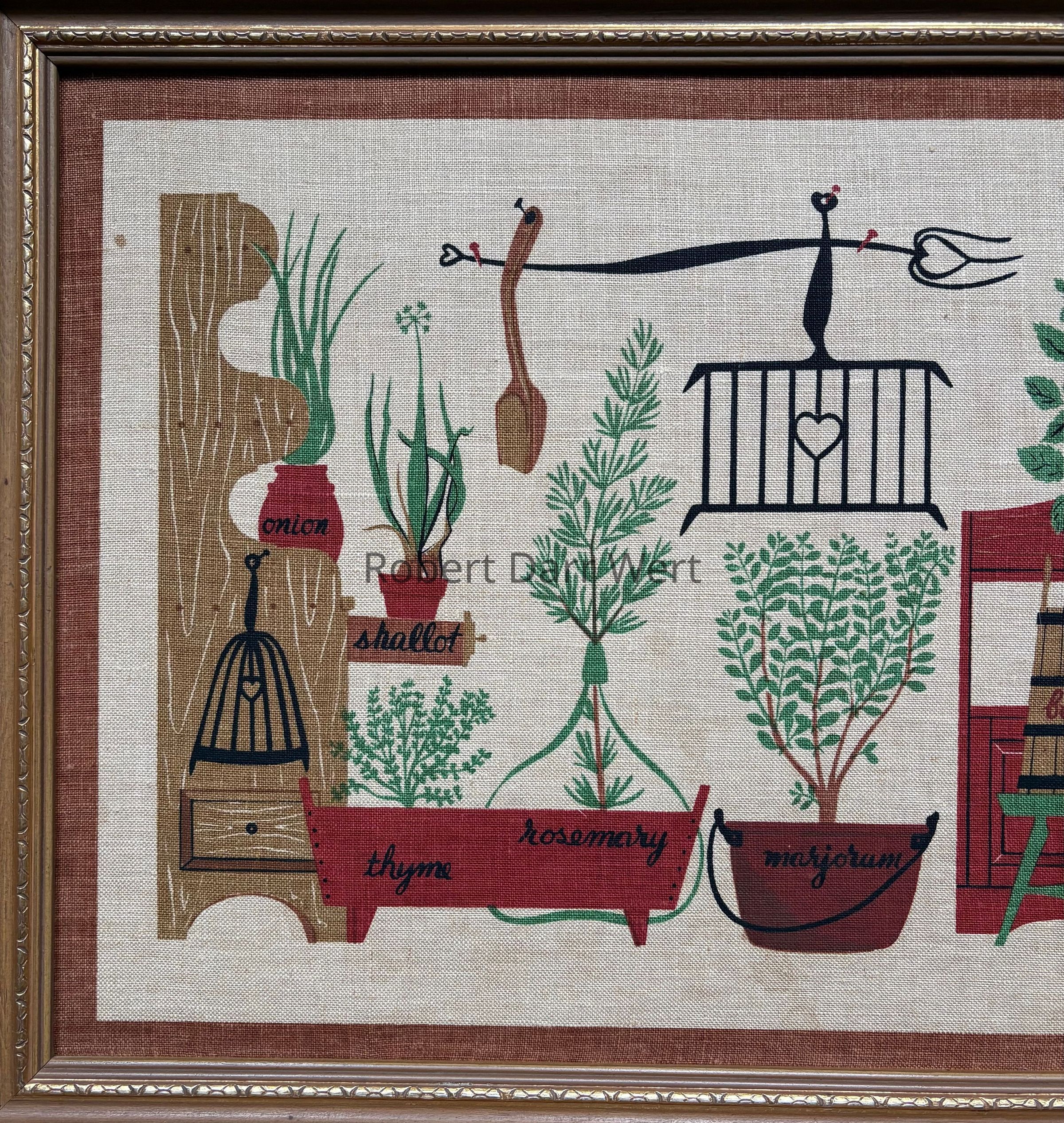 A five-screen/six-color silkscreen print on off-white linen depicting herbs planted in various vessels set amongst items found in a well-equipped early American kitchen. Items of cast iron, wrought iron, copper, wooden ware, painted tin, and cabinetry are illustrated.
