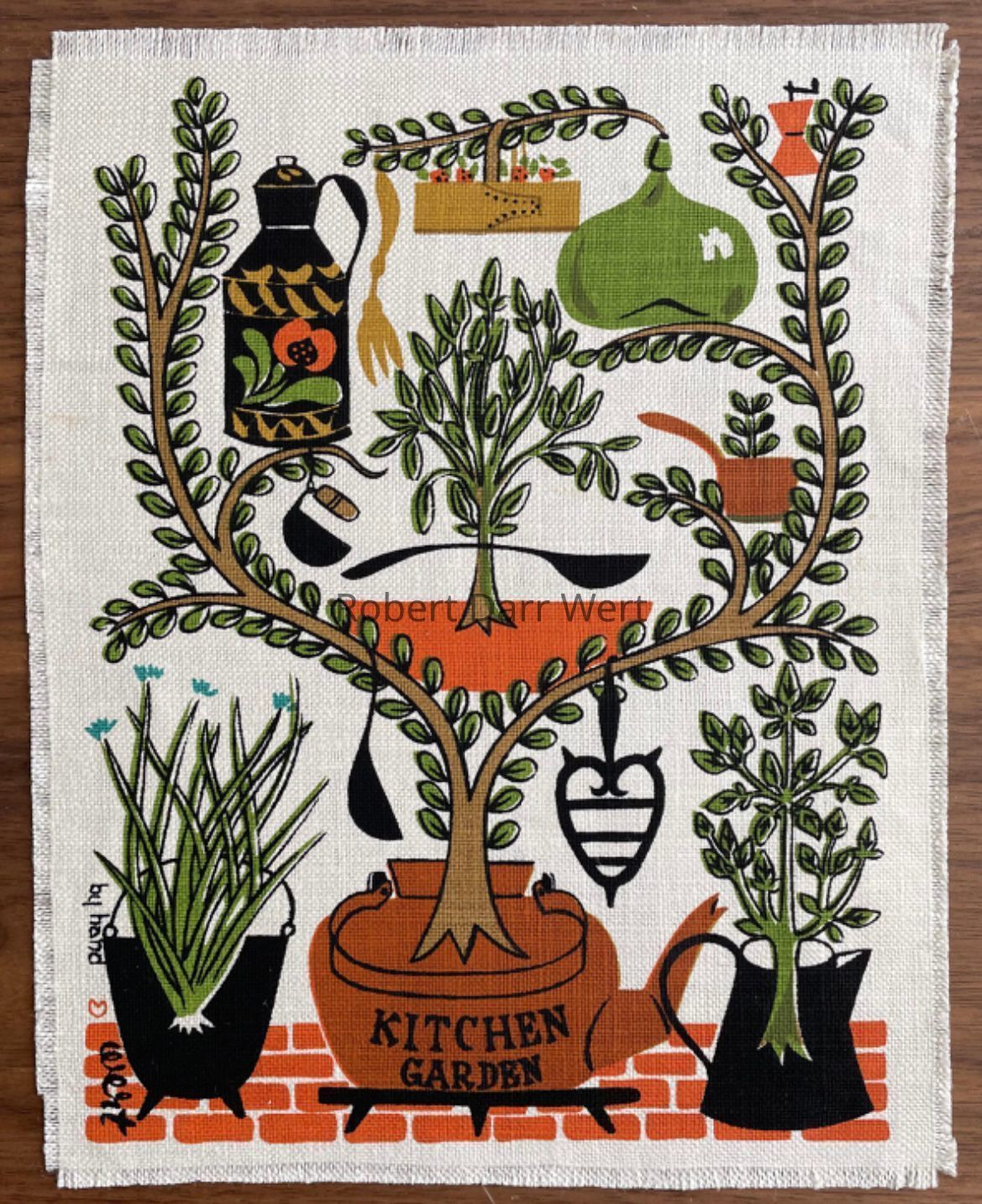 A six-screen/seven-color silkscreen print on off-white linen depicting plants and herbs found in a kitchen garden. Early American tools, vessels and implements related to cooking populate the composition and are made of cast iron, wrought iron, copper, and wood.