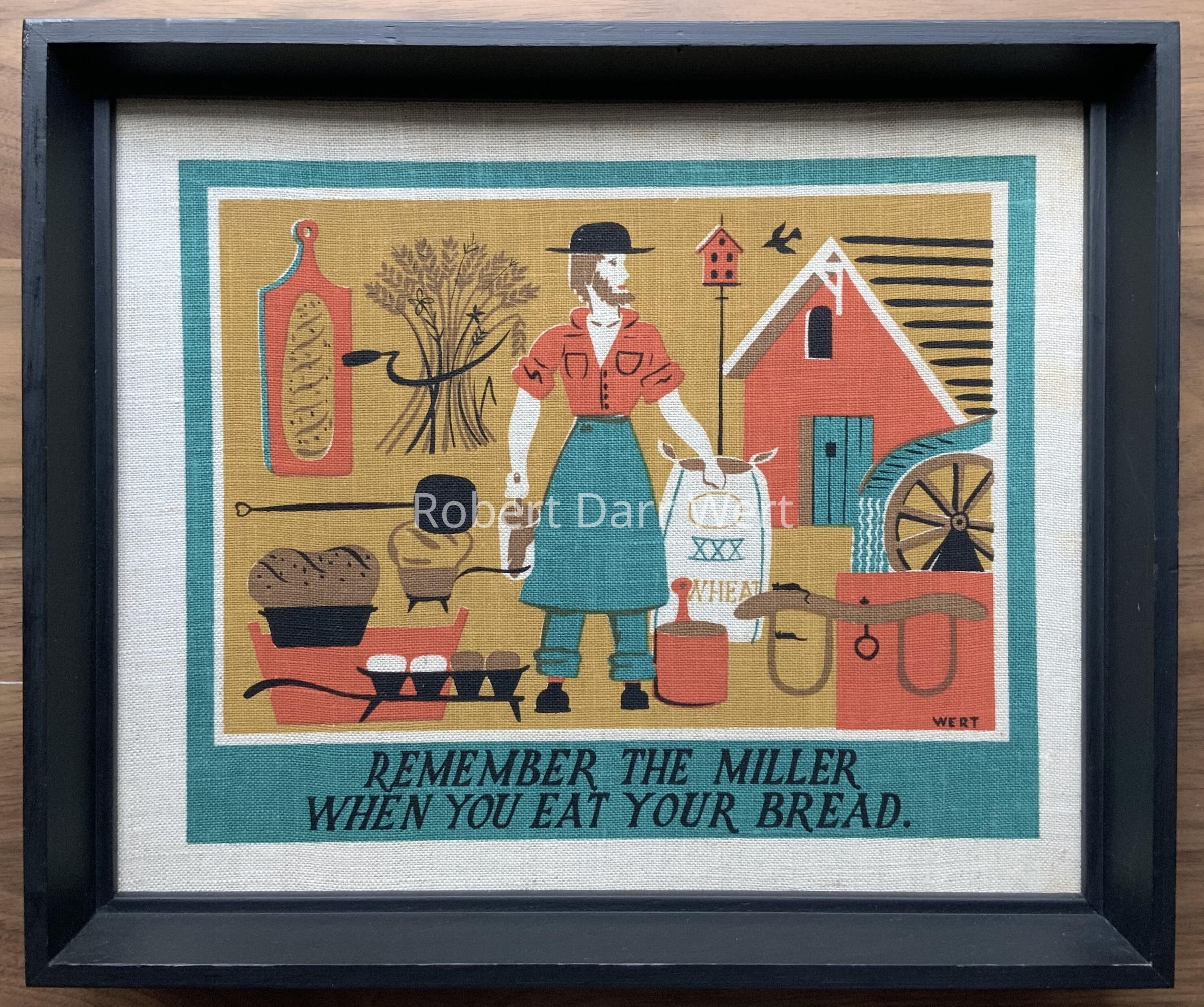 A five-color silkscreen print on off-white linen depicting a miller standing outside his mill surrounded by raw materials and products of the milling trade. Wert’s sense of humor is in evidence, as he includes mice in the composition (an ever-present issue in the storage and use of grains), and his exhortation to “remember the miller when you eat your bread”.