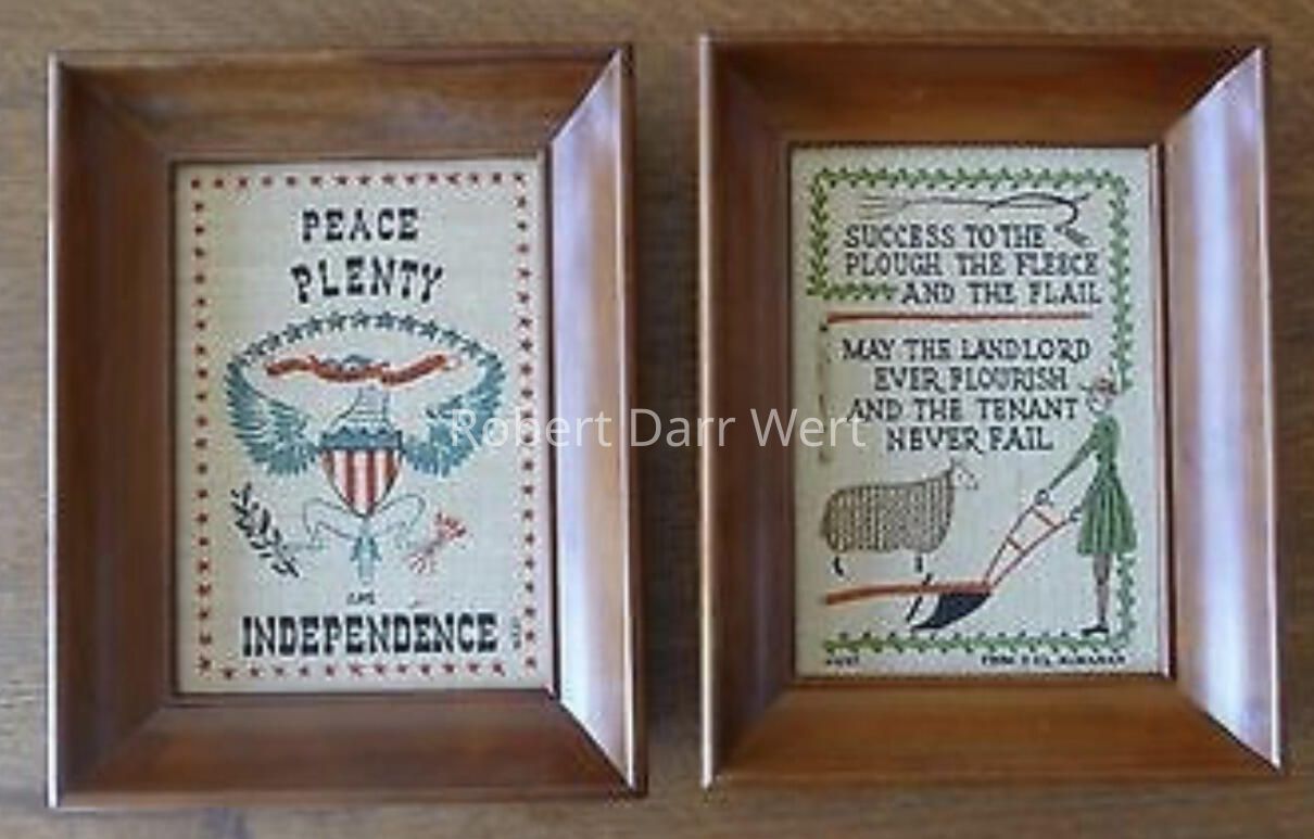 “Success” print: a four-color print displaying a farmer at a plow, a sheep and harvest tools. Central to the composition is the motto, possibly from Poor Richard’s Almanac, “SUCCESS TO THE PLOUGH, THE FLEECE, AND THE FLAIL. MAY THE LANDLORD EVER FLOURISH AND THE TENANT NEVER FAIL”. The composition is bordered with a trailing vine.