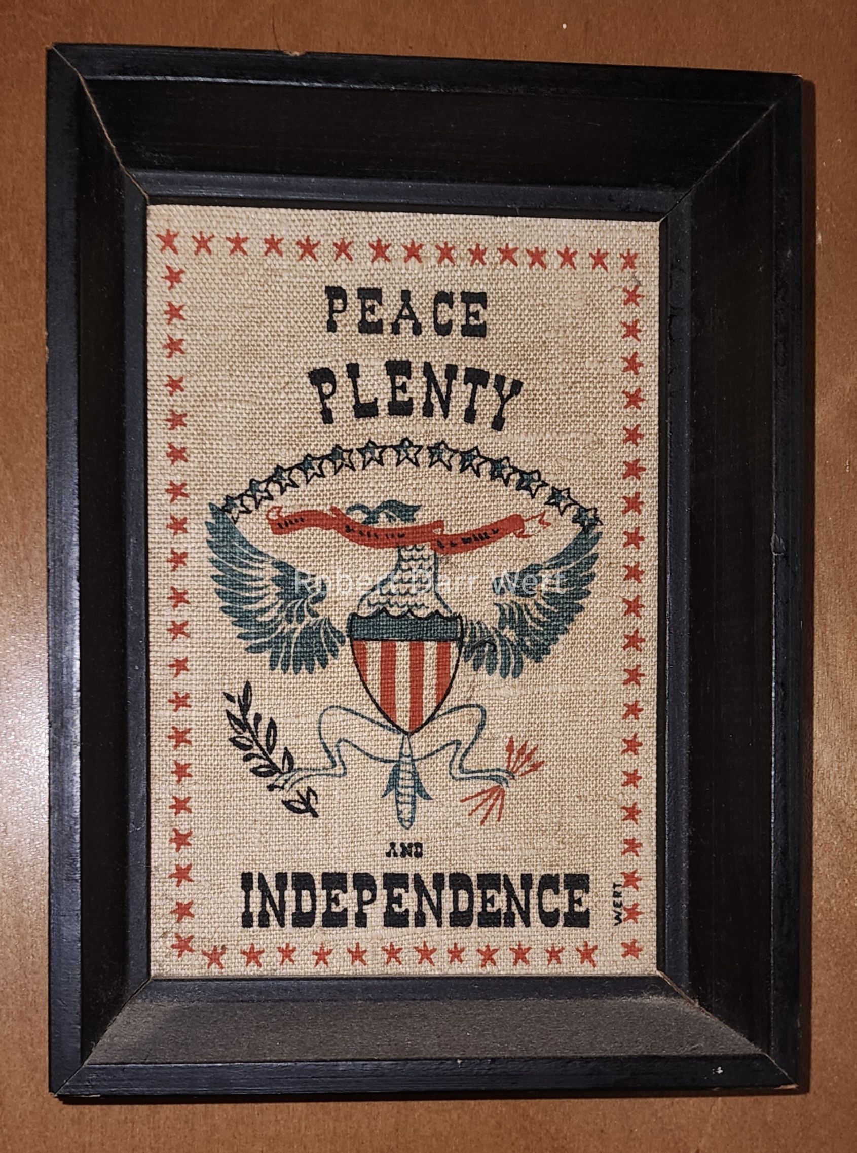 “Peace” print: a three-color print displaying an American eagle at center, with the words, “PEACE PLENTY AND INDEPENDENCE”. The composition is bordered with red five-point stars.