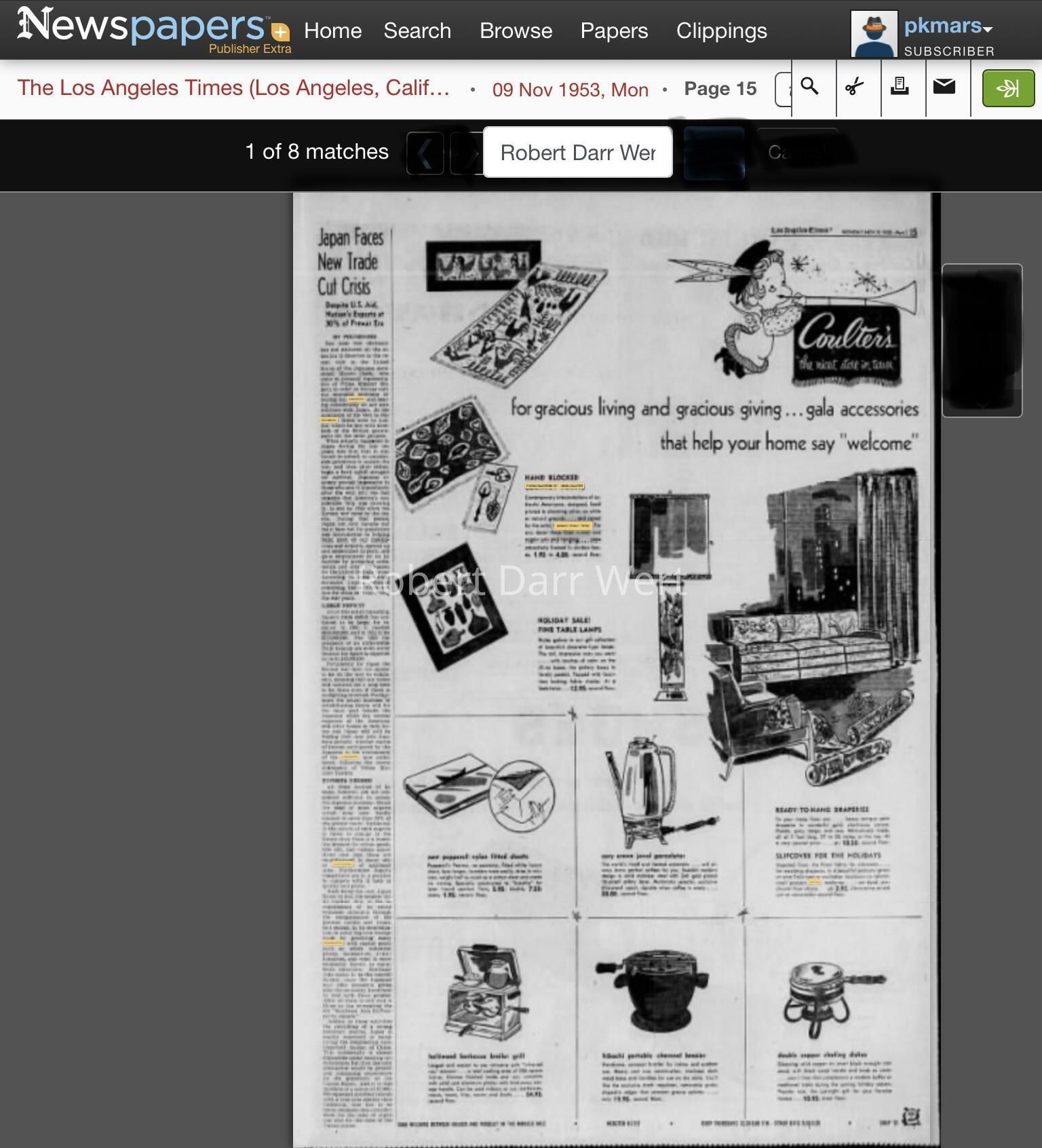 Date based on appearance in an LA Times advertisement for Coulter’s Department Store, see image below.Inscription/Signature/Marks