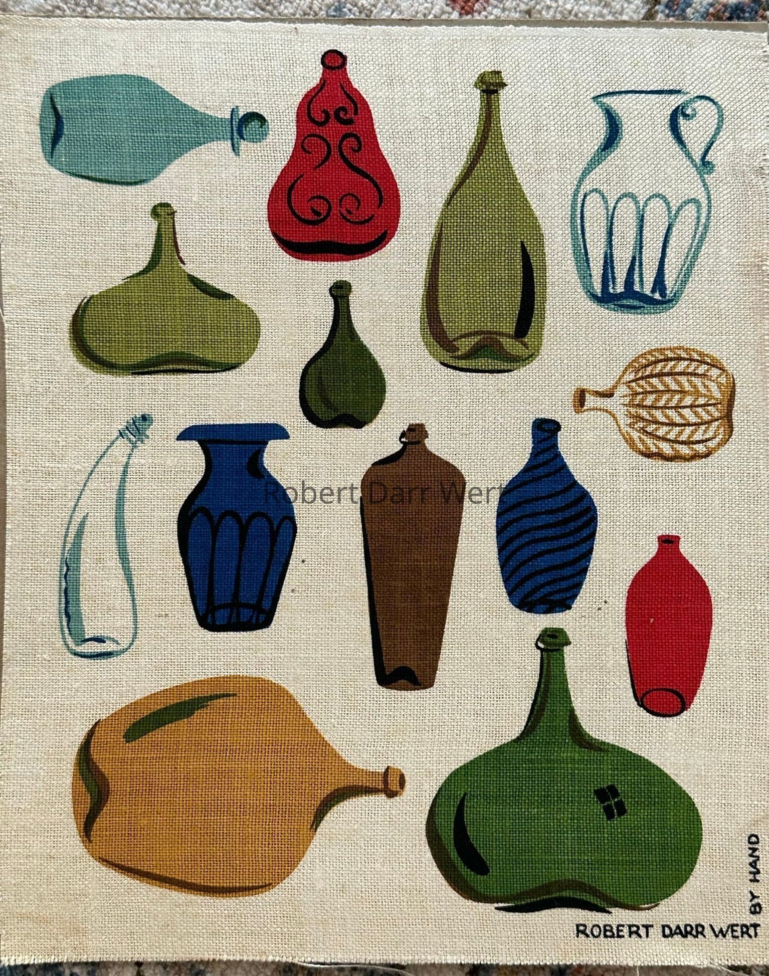 An eight-screen/multi-colored silkscreen print on linen depicting thirteen early American glass vessels.