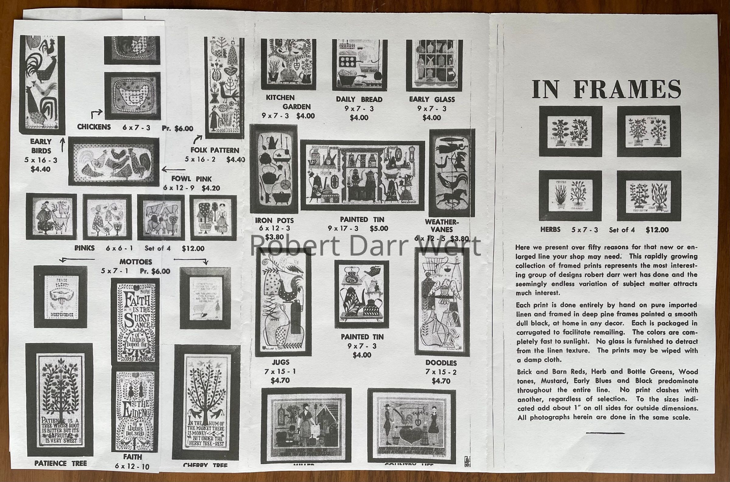 These 7”x14” prints appear singly in the c.1955 brochure “Country Prints in Frames” and the Spring 1958 Country Prints price list as Cherry Tree 714-1 and Patience Tree 714-2. They are listed in the January 1960 Country Prints price list in a choice of antique birch or flat black frames, and appear as a pair in the c.1960 brochure, “Country Prints in Frames Designed by Robert Darr Wert”, as Cherry Tree/Patience Tree 916-7, indicating the prints were reworked into a larger 9”x16” format (see separate entry for larger prints).Made/Created