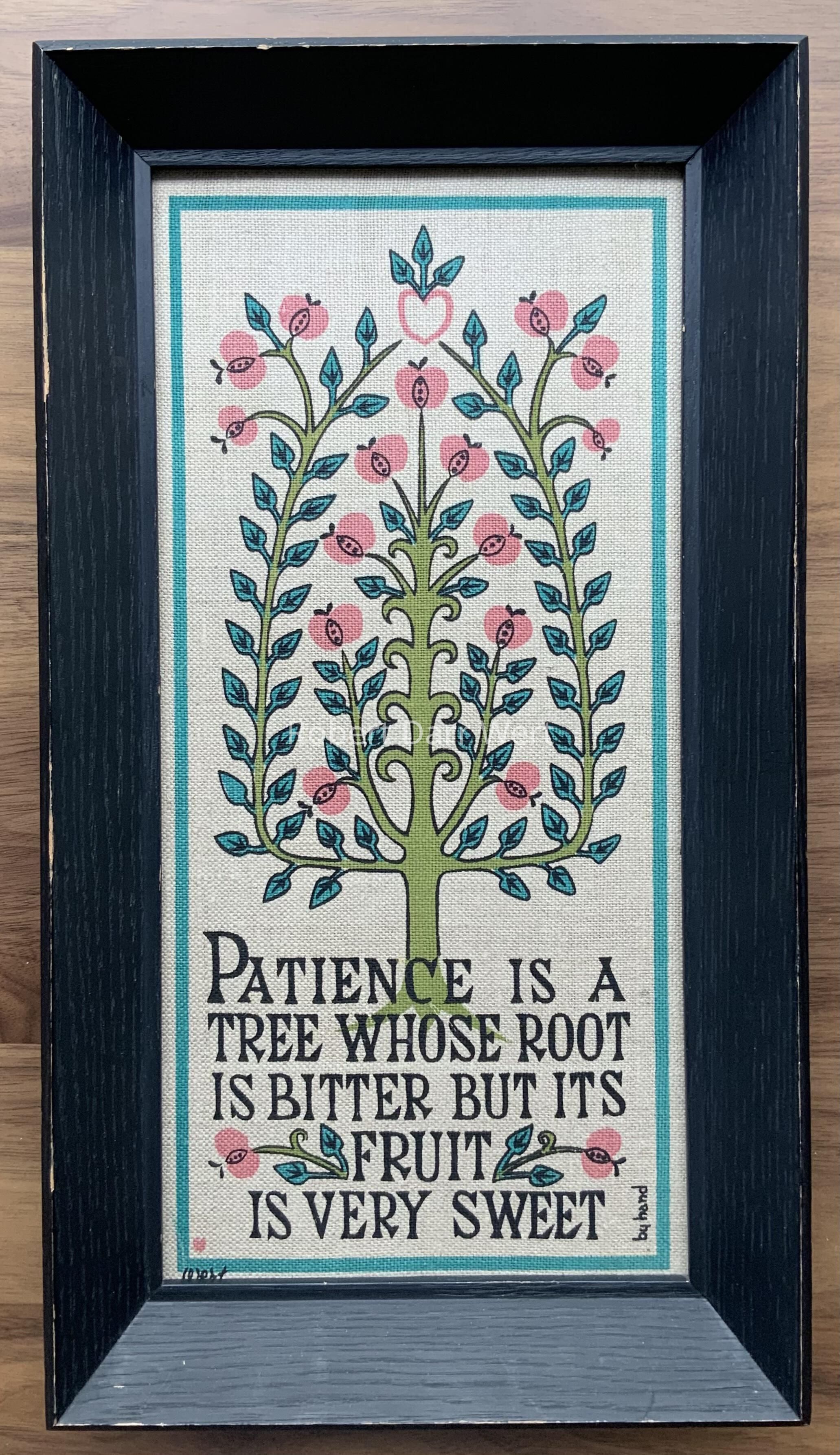 Patience Tree 714-1: depicts a conventionalized apple tree bearing fruit, crowned with a pink outlined heart sprouting three leaves. Below is a maxim from Poor Richard’s Almanac, “Patience is a tree whose root is bitter but its fruit is very sweet”. The composition is finished with a teal border.