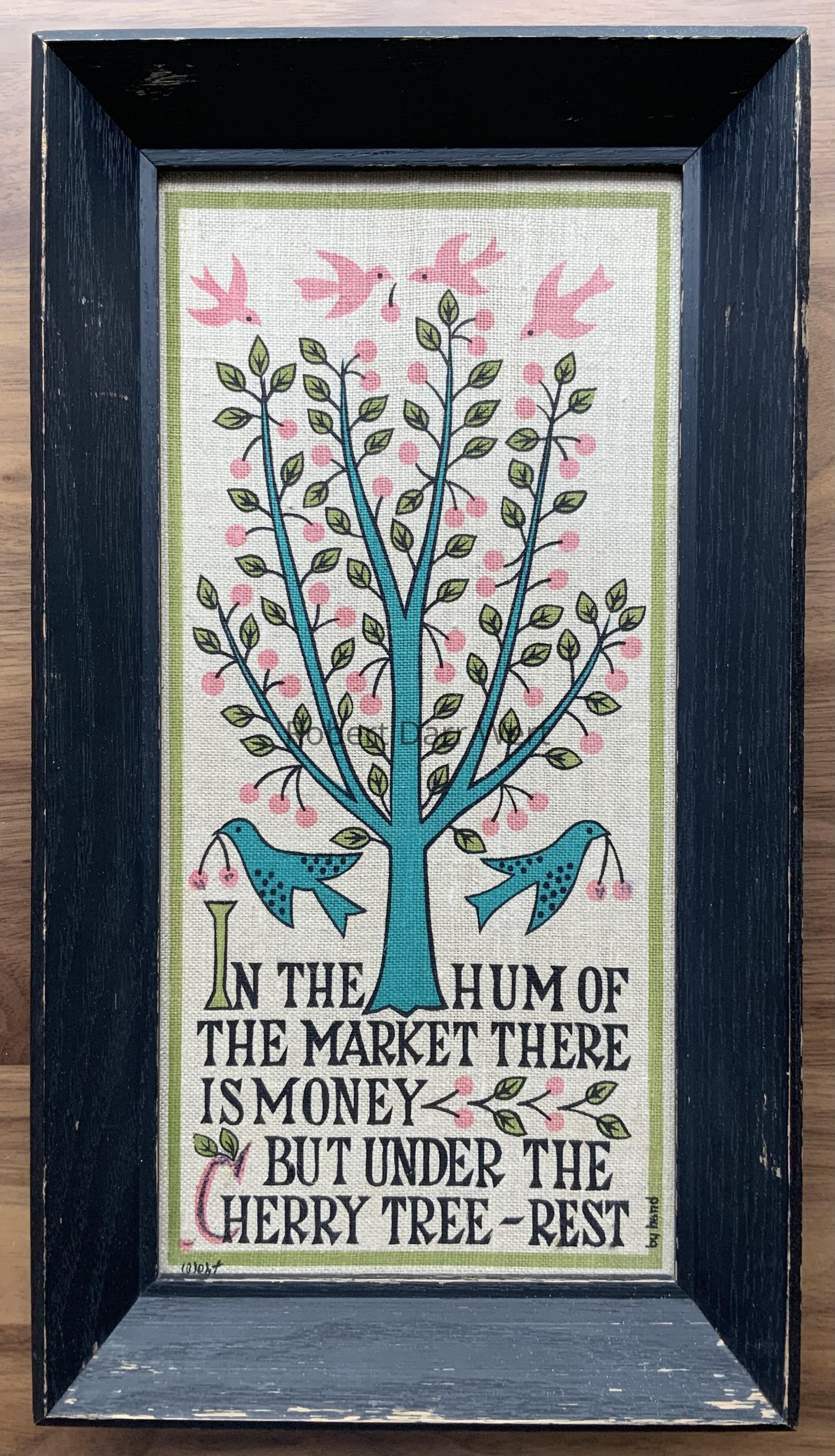 Cherry Tree 714-2: depicts a conventionalized cherry tree bearing pink fruit. Birds pluck cherries above and below the tree. At the base of the composition is the Japanese proverb, “In the hum of the market there is money but under the cherry tree - rest”. The composition is finished with a chartreuse border.