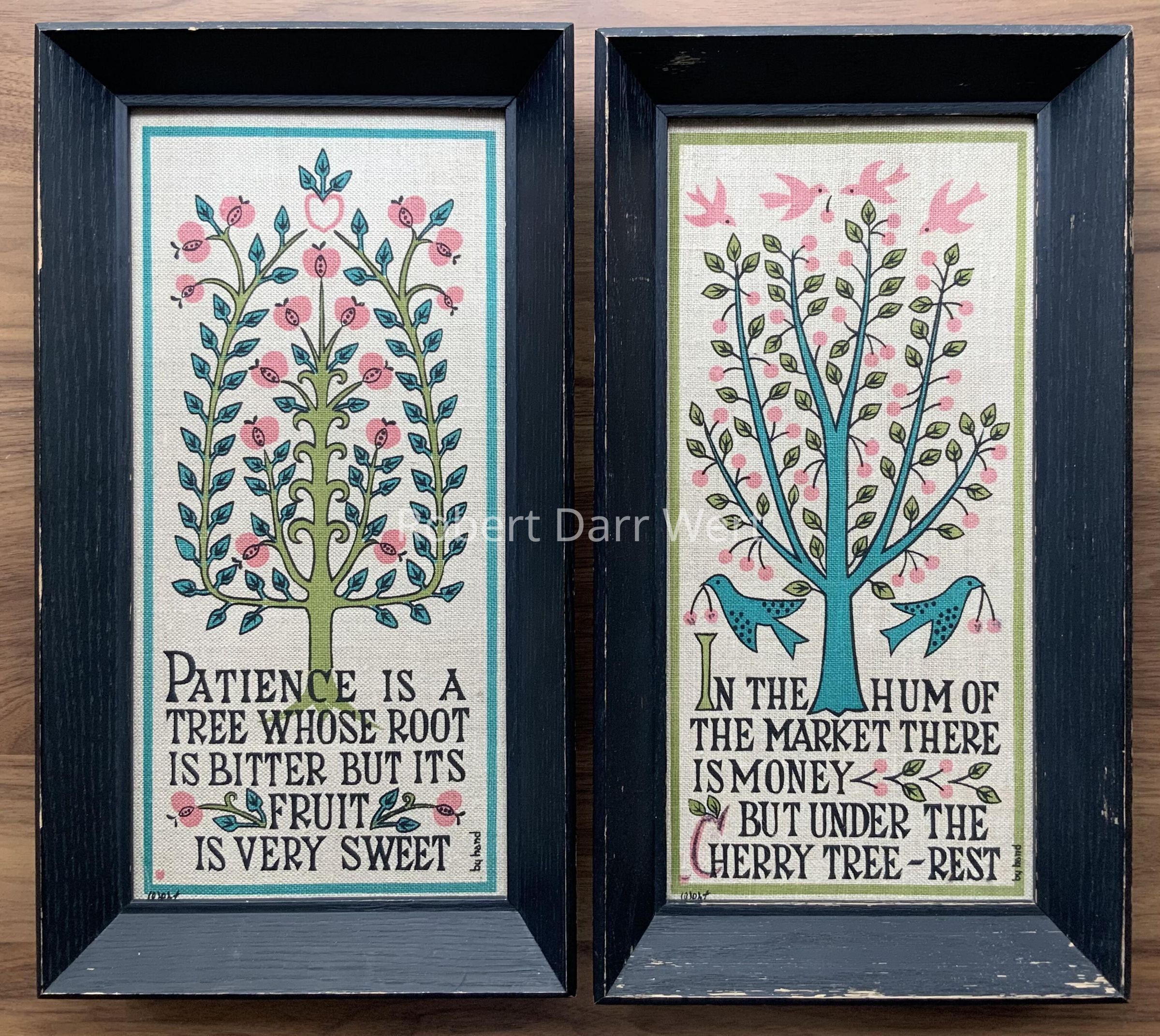 A pair of four-color silkscreen prints on off-white linen, each depicting a fruiting tree illustrating a maxim.