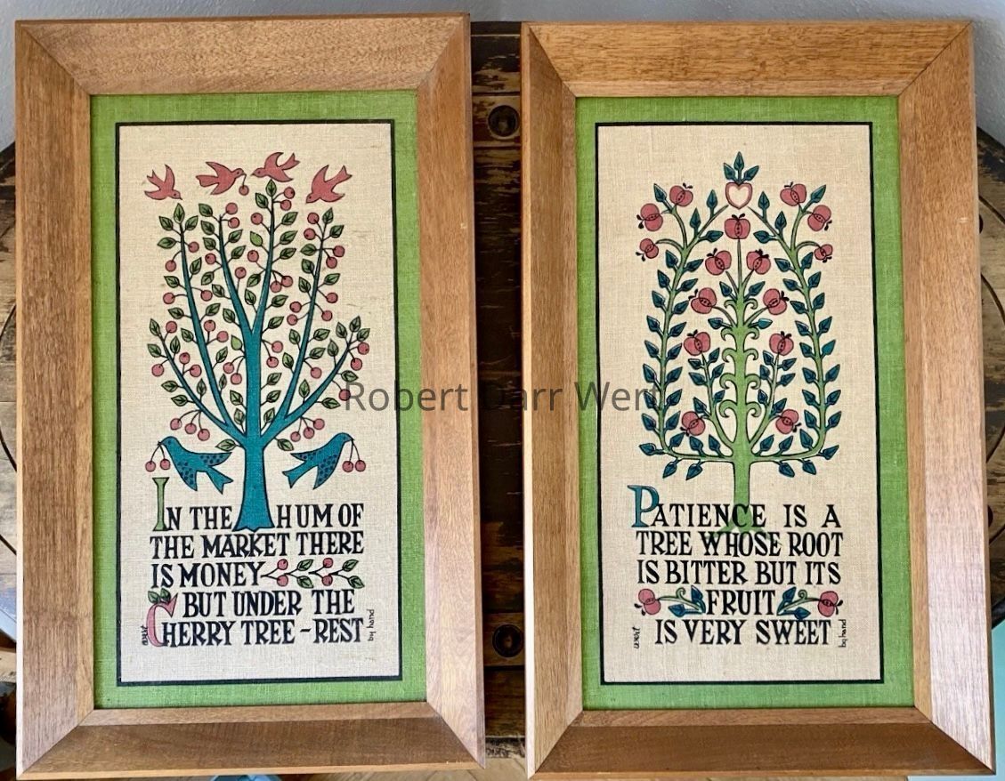 A pair of four-color silkscreen prints on off-white linen, each depicting a fruiting tree illustrating a maxim.