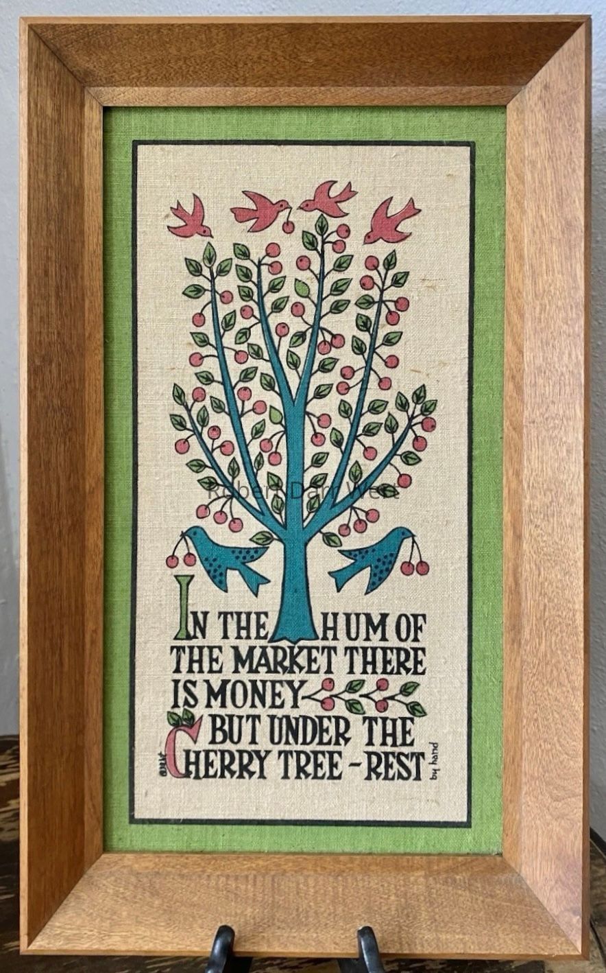 Cherry Tree: depicts a conventionalized cherry tree bearing pink fruit. Birds pluck cherries above and below the tree. At the base of the composition is the Japanese proverb, “In the hum of the market there is money but under the cherry tree - rest”. The composition is finished with a green border.