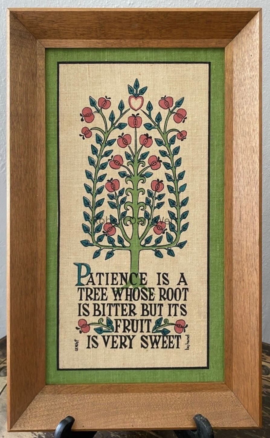 Patience Tree: depicts a conventionalized apple tree bearing fruit, crowned with a pink outlined heart sprouting three leaves. Below is a maxim from Poor Richard’s Almanac, “Patience is a tree whose root is bitter but its fruit is very sweet”. The composition is finished with a green border.