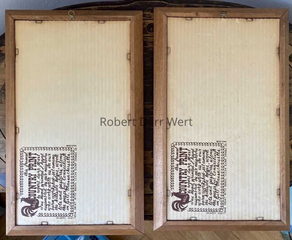 These prints appear singly in the c.1955 brochure “Country Prints in Frames” and the Spring 1958 Country Prints price list at a smaller size (7”x14”) as Cherry Tree 714-1 and Patience Tree 714-2. They are listed in the January 1960 Country Prints price list in a choice of antique birch or flat black frames, and appear as a pair in the c.1960 brochure, “Country Prints in Frames Designed by Robert Darr Wert”, as Cherry Tree/Patience Tree 916-7, indicating the prints were reworked into a larger 9”x16” format as seen here; see images.Made/Created