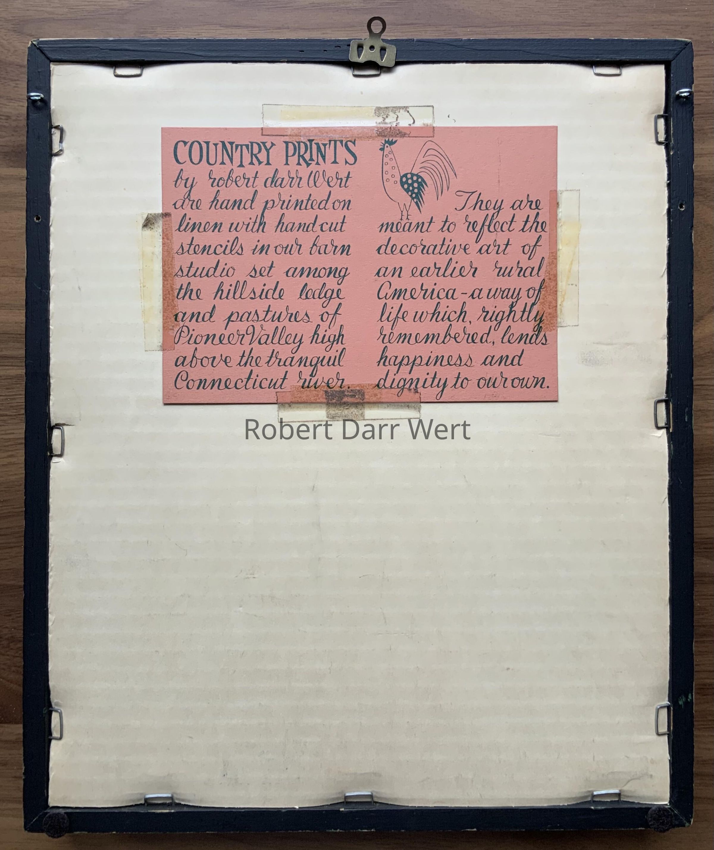 This pair of prints is listed in the January 1960 Country Prints price list in a choice of antique birch or flat black frames, and appears in the c.1960 brochure “Country Prints in Frames Designed by Robert Darr Wert”; see images.Made/Created