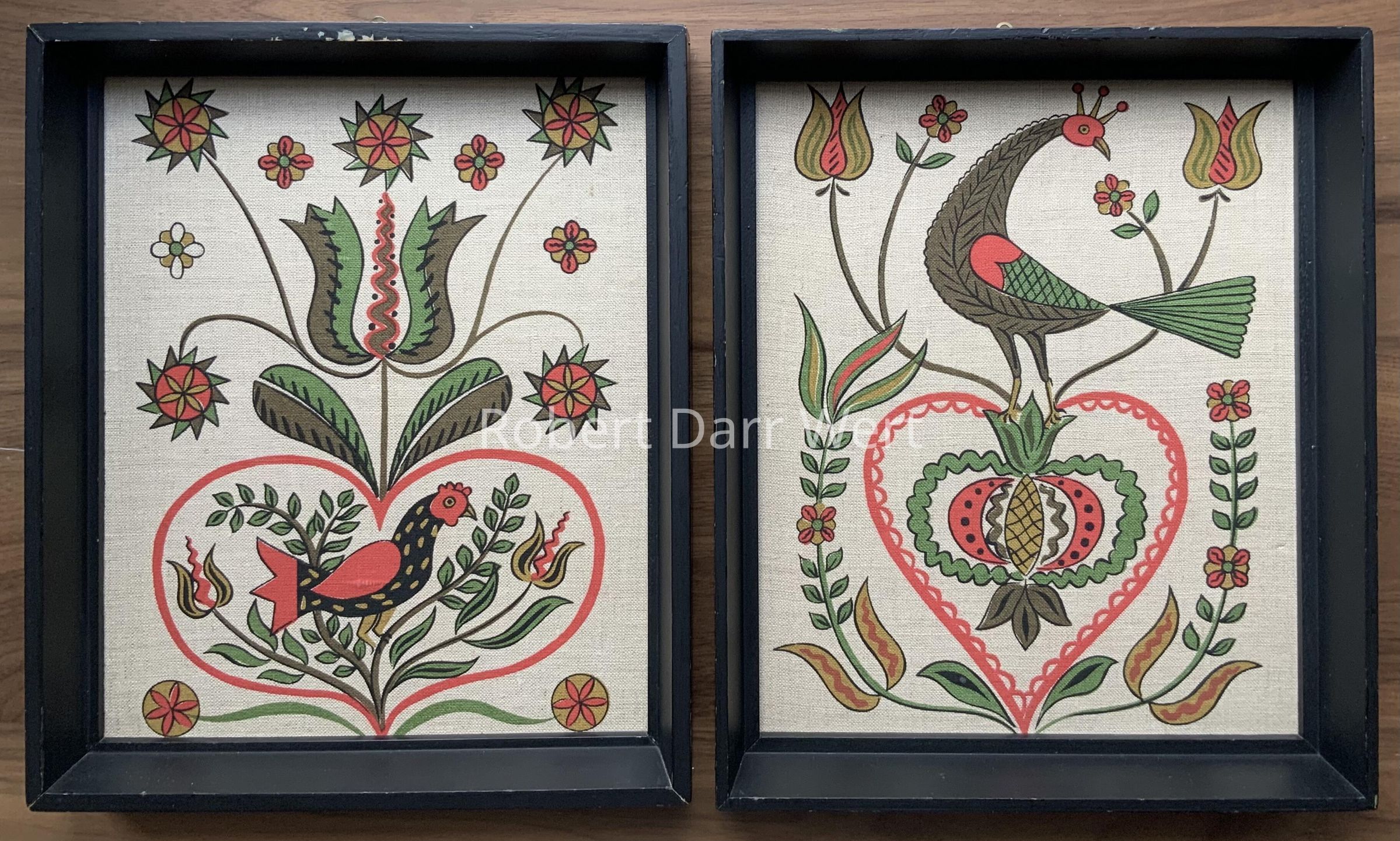 A pair of five-color silkscreen prints on off-white linen depicting Wert’s interpretation of Pennsylvania “Dutch” folk art motifs featuring birds, flowers, and hearts.
