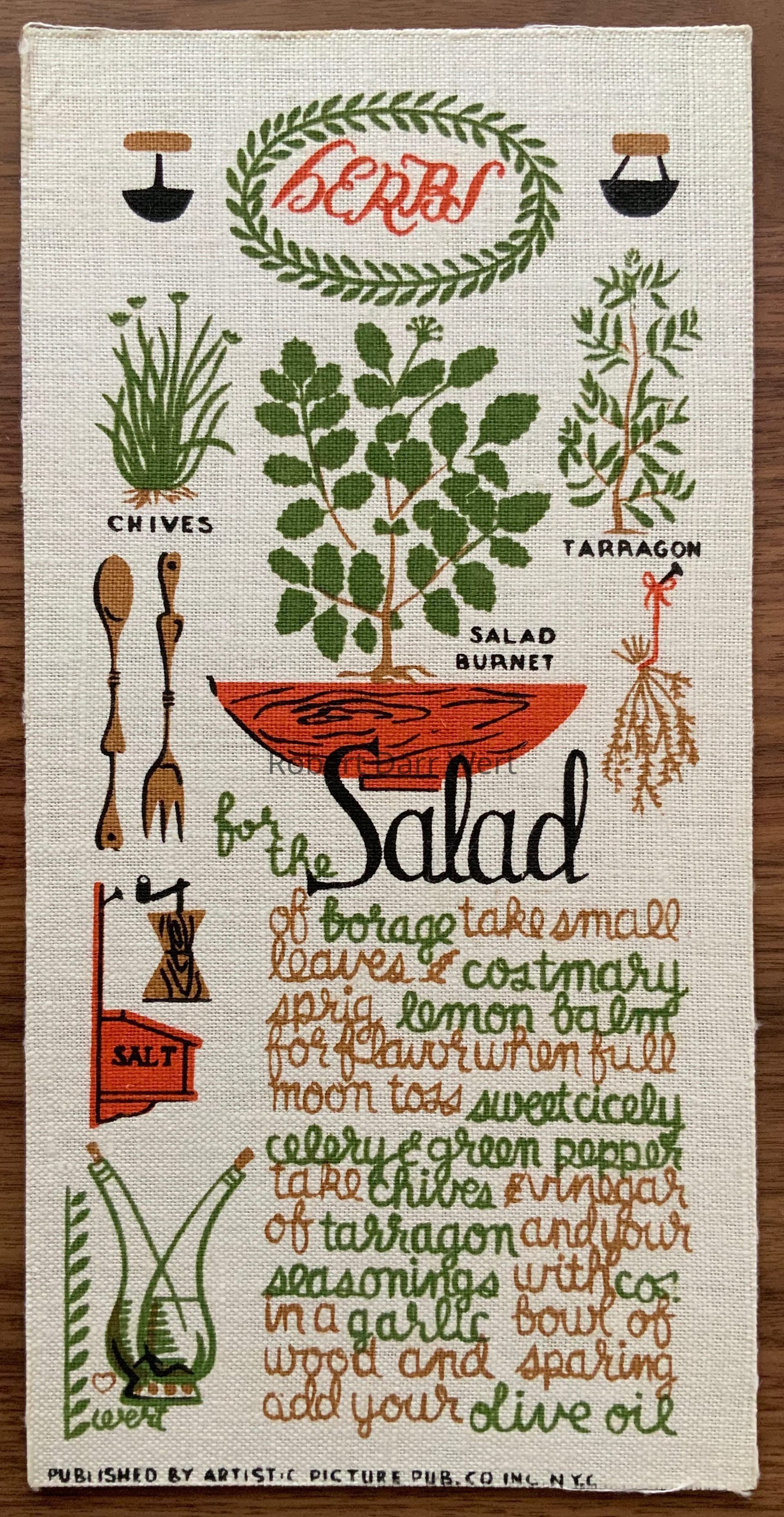 A four-color silkscreen print on off-white linen depicting herbs and implements used for making salad, along with a fragmentary salad recipe.
