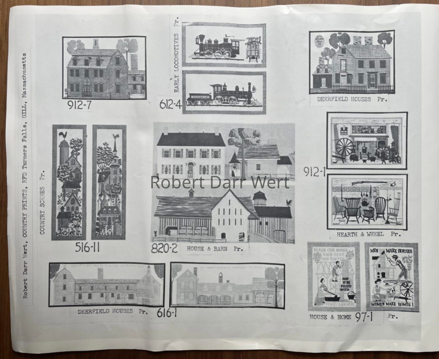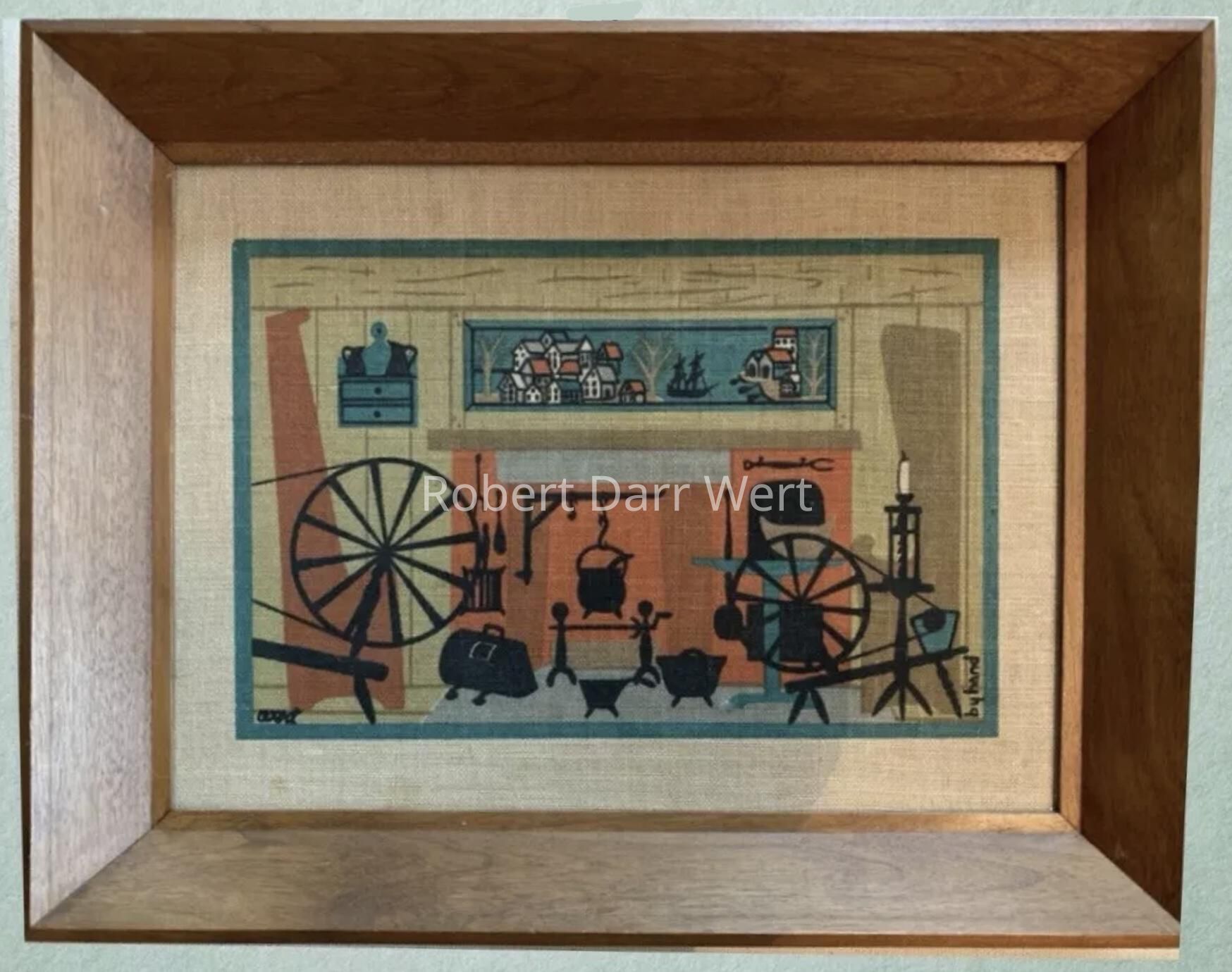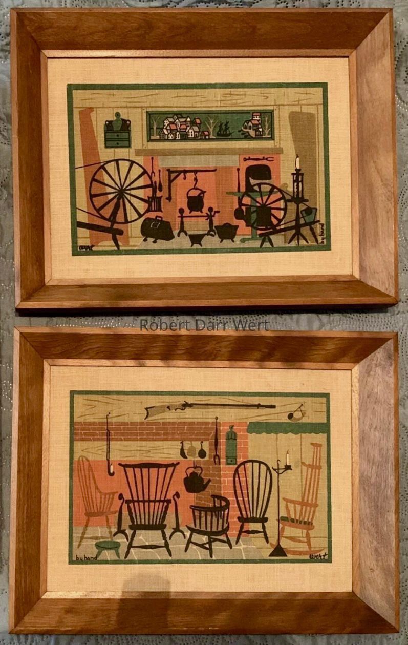 This print appears in the c.1955 brochure “Country Prints in Frames” and the Spring 1958 Country Prints price list as Chair Hearth 912-1 and Spinning Wheels 912-2. Later, on a 1958 Country Prints packing slip, the two are paired as Chair Hearth/Spinning Wheels 912-1/2. In the c.1960 brochure “Country Prints in Frames Designed by Robert Darr Wert” they are paired as Hearth & Wheel 912-1; see images.Made/Created