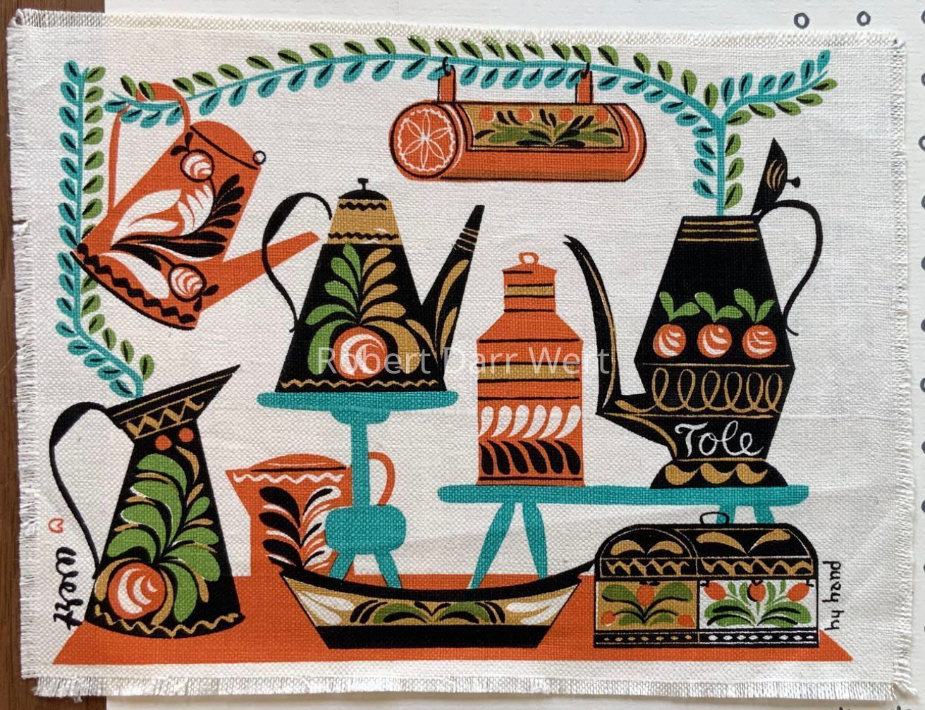 A five-color silkscreen print on off-white linen depicting nine painted tin (toleware) vessels. A trailing vine borders the upper portion of the composition.