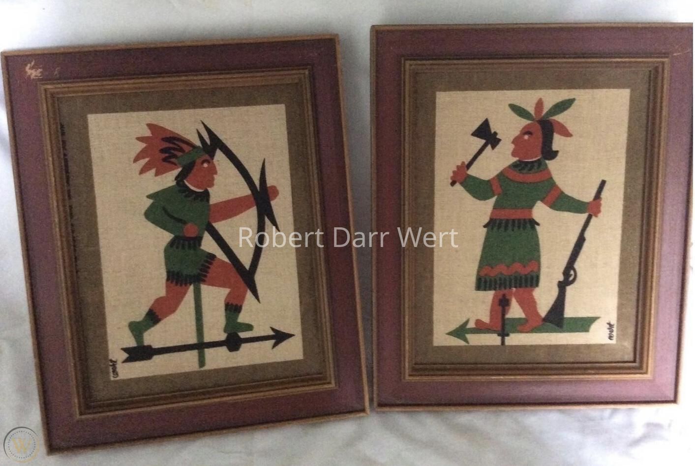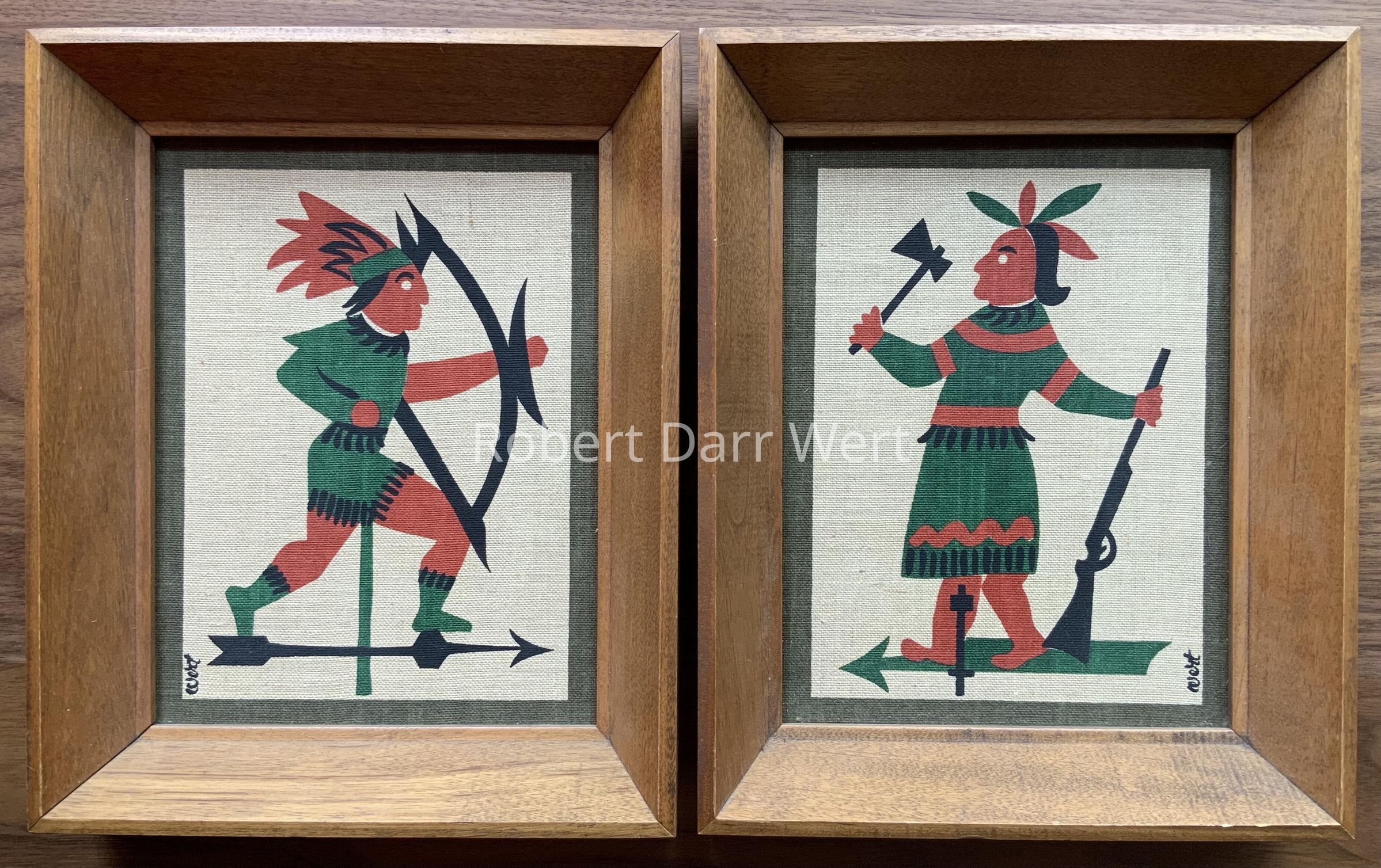 A pair of four-color silkscreen prints on off-white linen depicting weathervanes in the form of Native American warriors, one running holding a bow, one standing holding a hatchet and a rifle. The compositions are finished with printed borders.