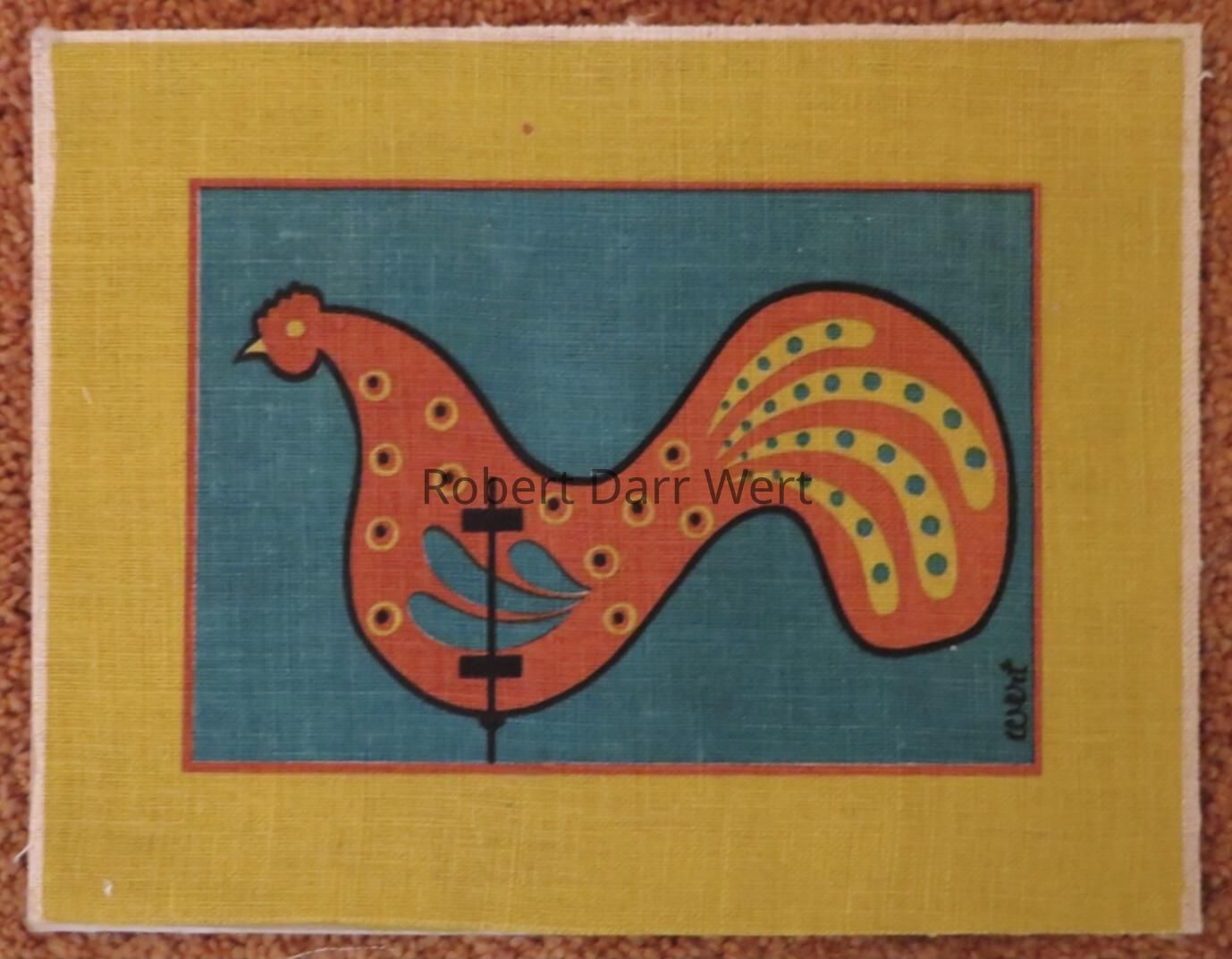 A four-color silkscreen print on off-white linen depicting a stylized interpretation of an early American rooster weathervane.Made/Created