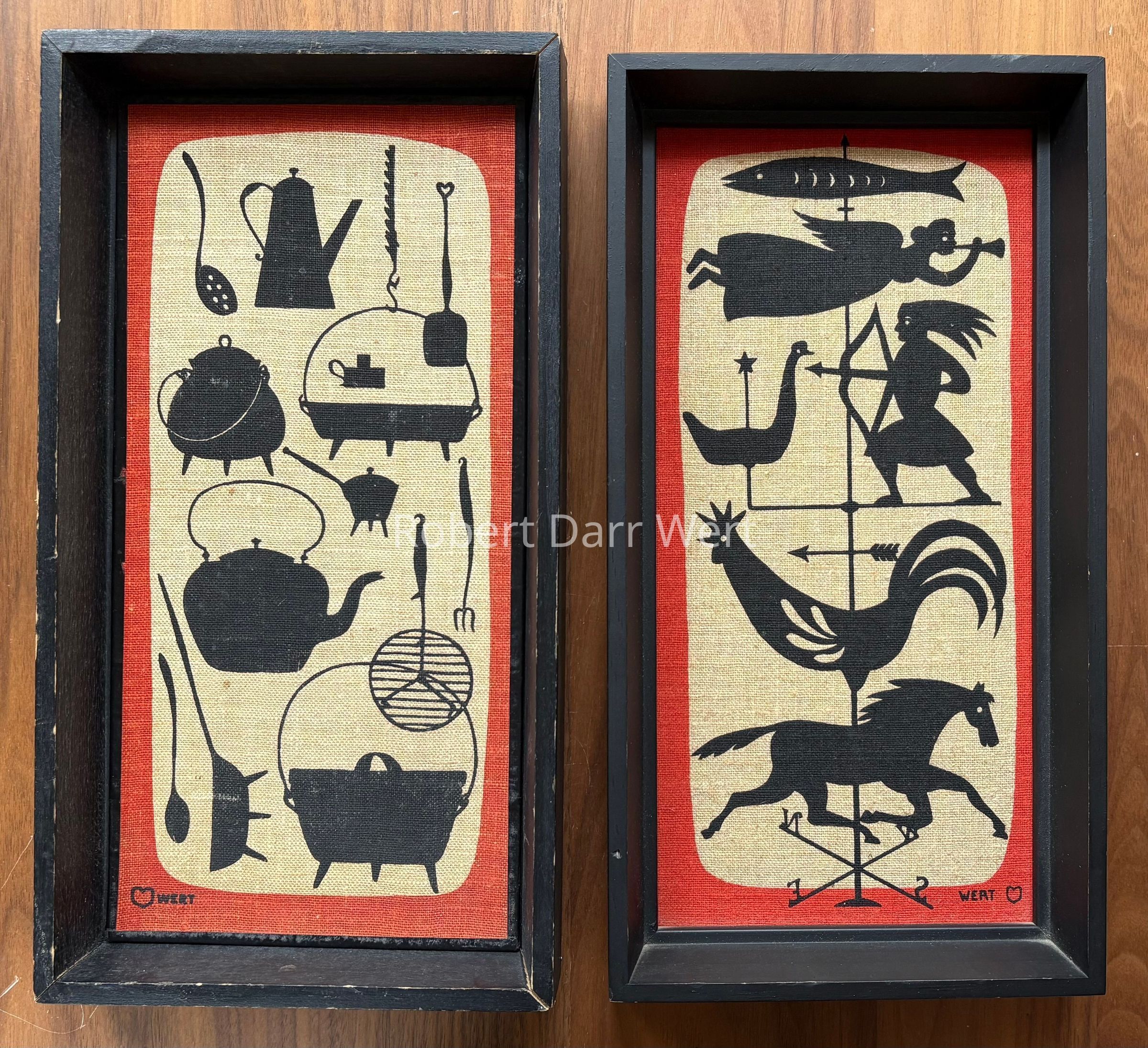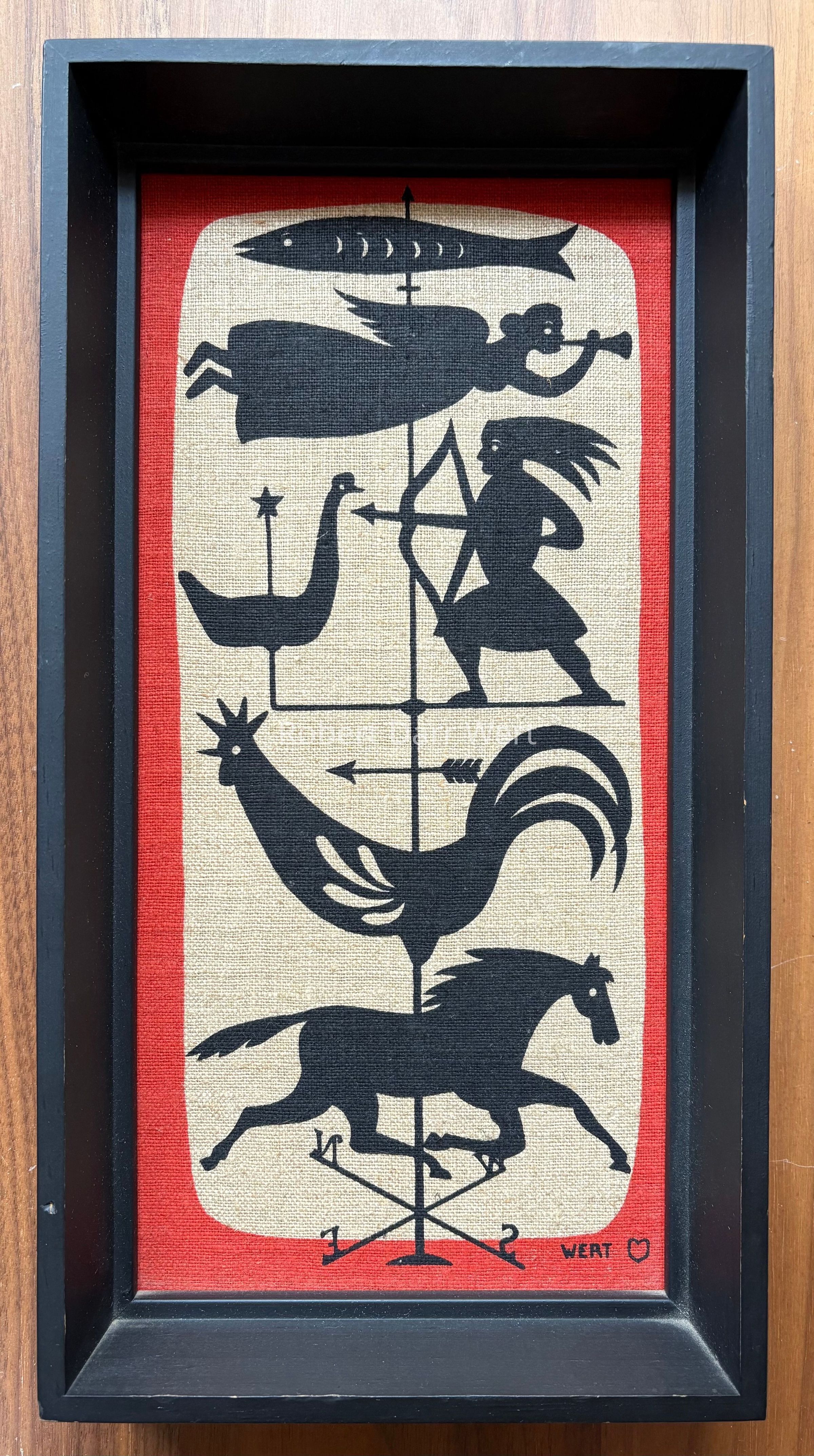 A two-color silkscreen print on off-white linen depicting eight early American weathervanes. The composition is finished with a red border.