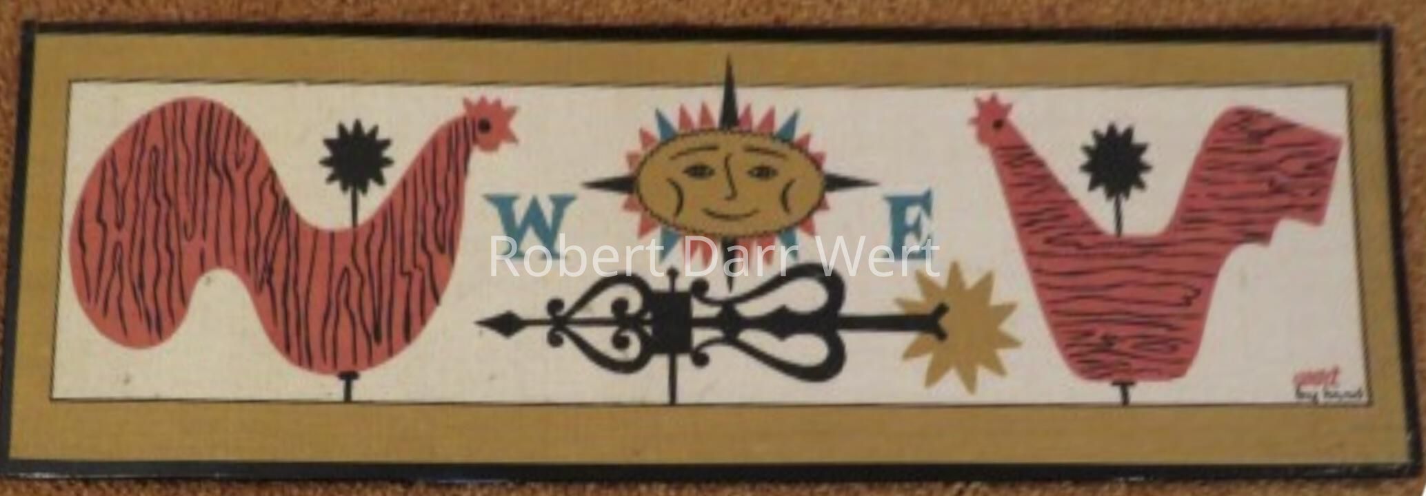 A four-color silkscreen print on off-white linen depicting a stylized interpretation of two early American rooster weathervanes and a smiling sun with a large “W” and “E” indicating west and east. This is likely one of a pair of matching prints. The second print would have “N” and “S” for north and south.